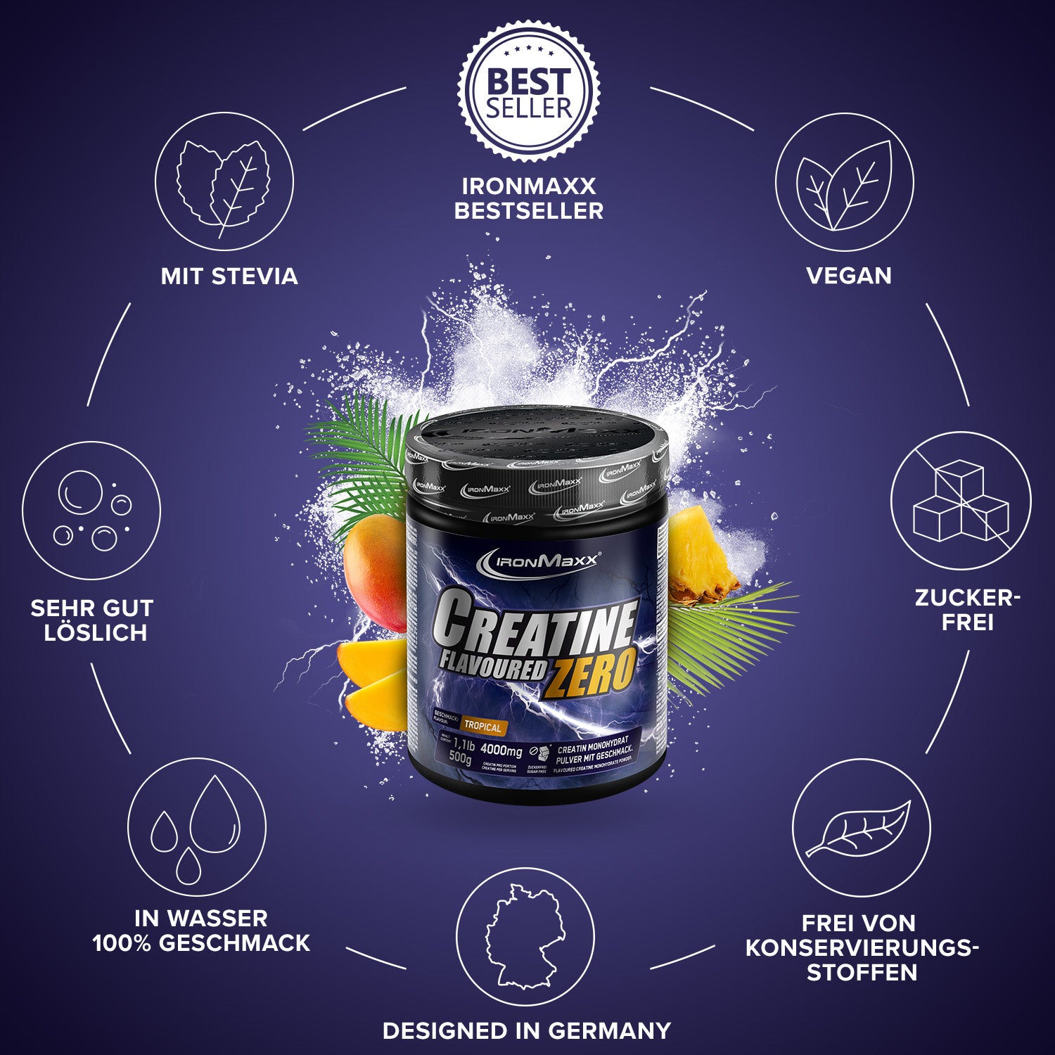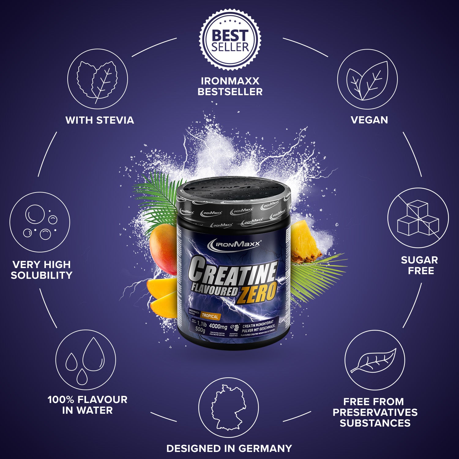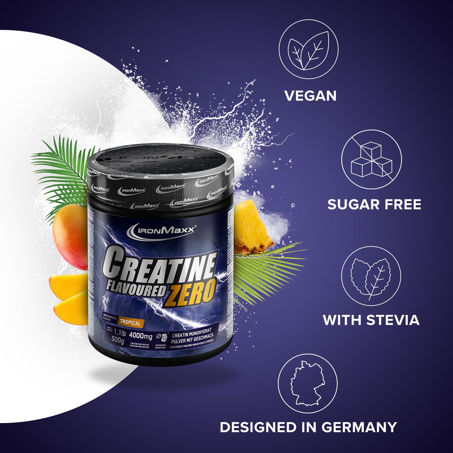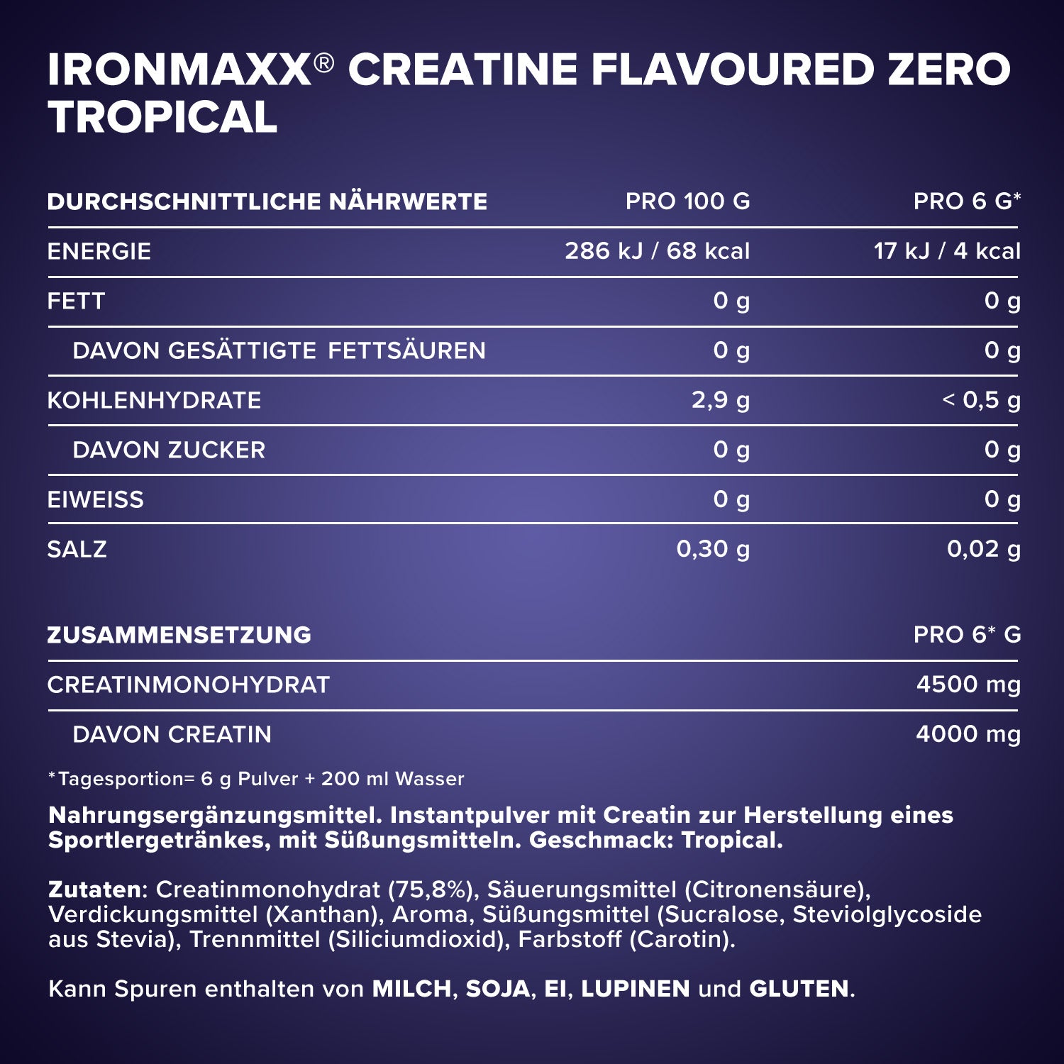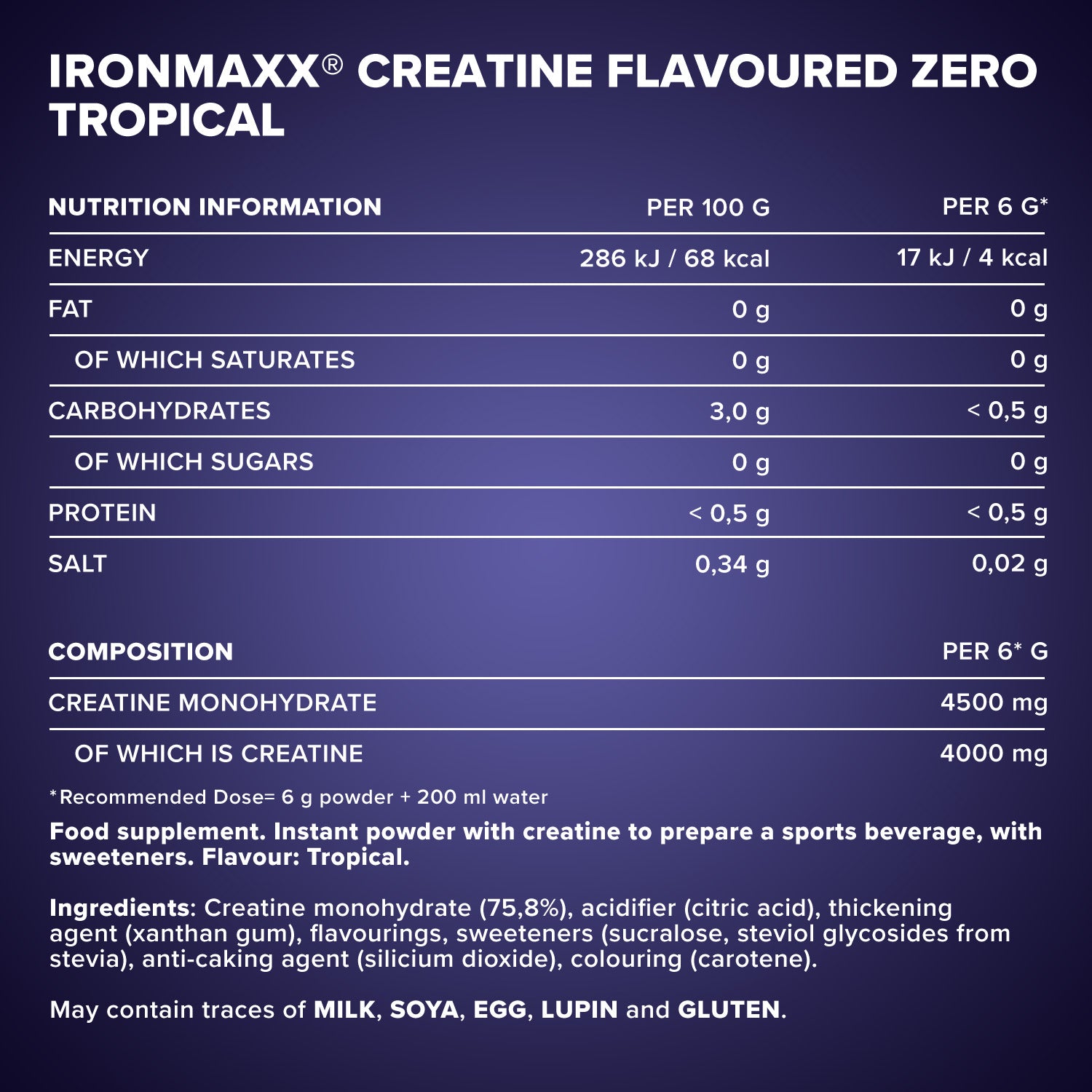 Designation: Dietary supplement. Instant powder withCreatine for the production of a sports drink, withSweeteners. Flavor: Tropical.