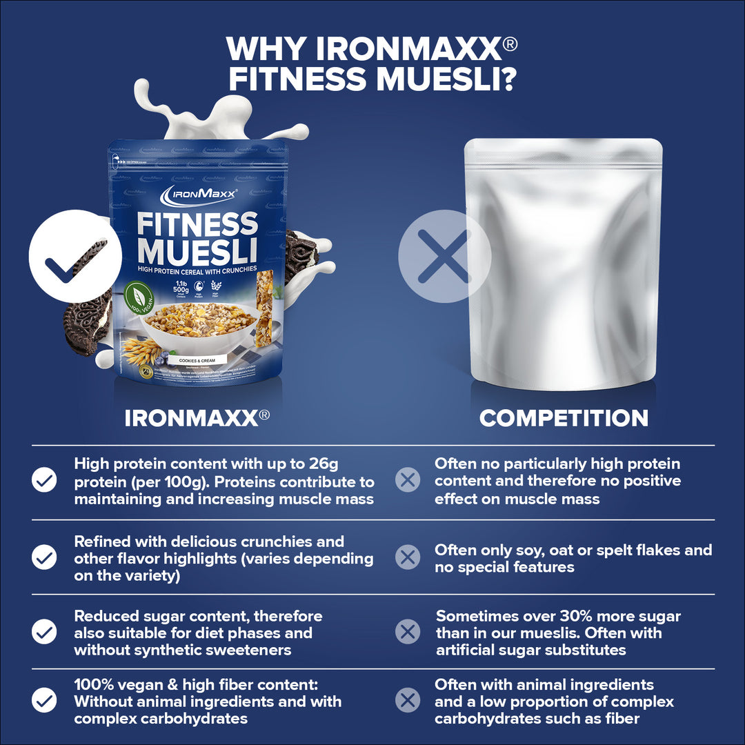 - Reduced sugar content: 30% less sugar than conventional mueslis