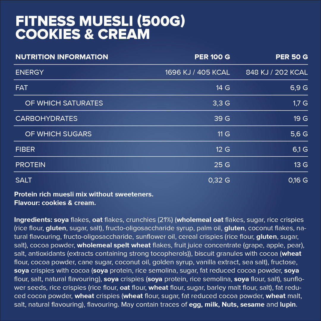 Ingredients:SOJA flakes, OAT flakes, Crunchies (21%)WHOLE GRAIN OAT flakes, sugar, rice crispies (rice flour, GLUTEN, sugar, salt), oligofructose syrup, palm oil, GLUTEN, coconut flakes, natural flavor, oligofructose, sunflower oil, cereal crispies (rice flour, GLUTEN, sugar, salt), cocoa powder, WHOLE GRAIN SPELT flakes, fruit juice concentrate (grape, apple, pear), salt, antioxidants (rich in tocopherol extracts), cocoa-containing shortbread pieces (WHEAT flour, cocoa powder, cane sugar, coconut oil, sugar beet syrup, vanilla extract, sea salt), fructose, SOJA crispies with cocoa (SOJA protein, rice semolina, sugar, defatted cocoa powder, SOJA flour, salt, natural flavor), SOJA crispies (SOJA protein, rice semolina, SOJA flour, salt), sunflower seeds, rice crispies (rice flour, OAT flour, WHEAT flour, sugar, BARLEY malt flour, salt), defatted cocoa powder, WHEAT crispies (WHEAT flour, sugar, defatted cocoa powder, WHEAT malt, salt, natural flavor), flavor.