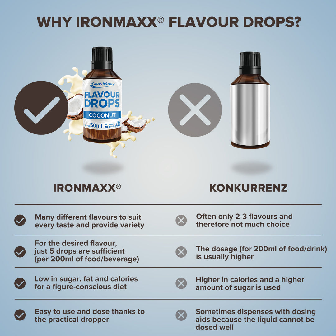 - Flavour Drops by IronMaxx®: Add delicious taste to quark, yoghurt, shakes or neutral protein powder – easy and versatile.