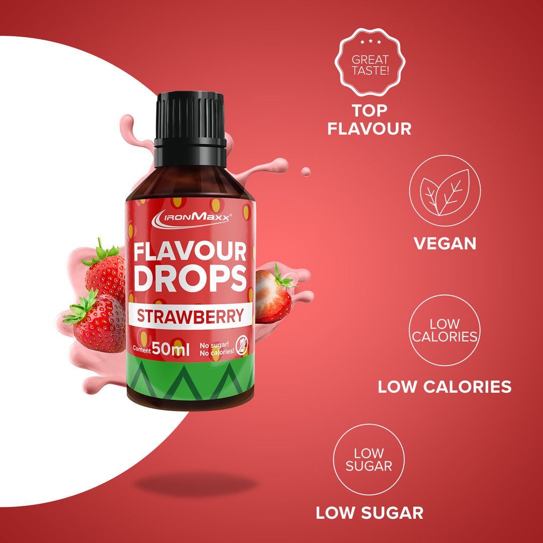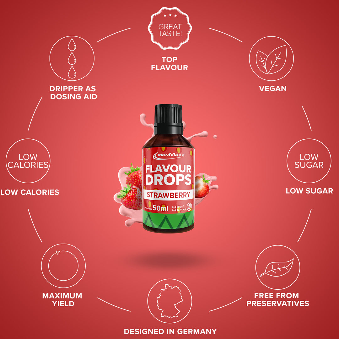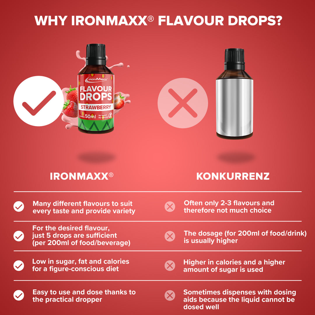- Flavour Drops by IronMaxx®: Add delicious taste to quark, yoghurt, shakes or neutral protein powder – easy and versatile.