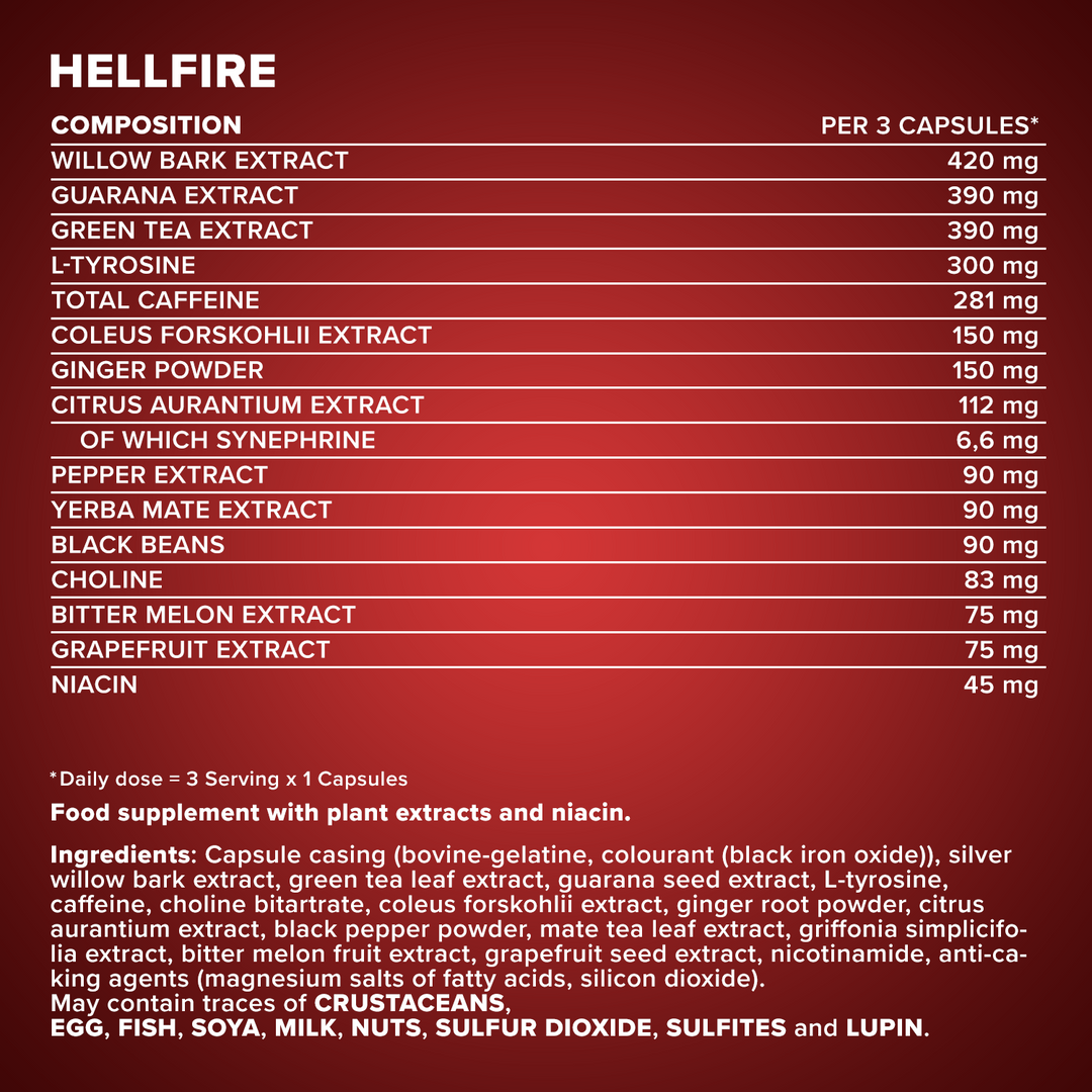 Take up to 3 capsules of Hellfire® daily with plenty of water. Best taken before breakfast or 30 minutes before training.