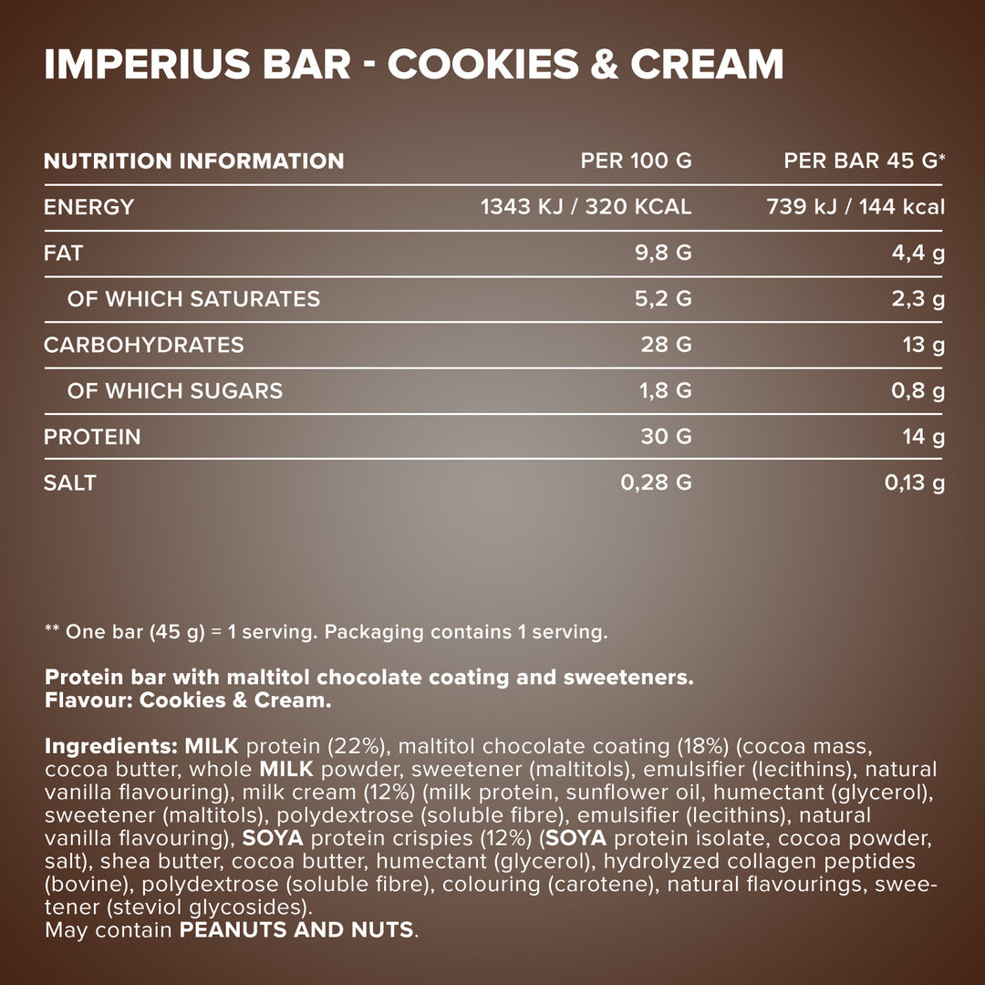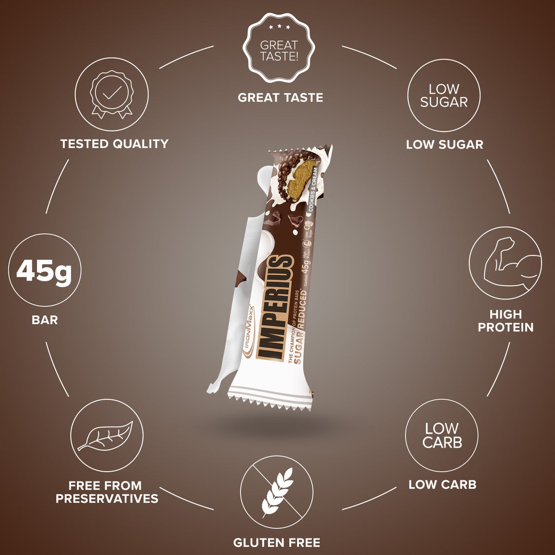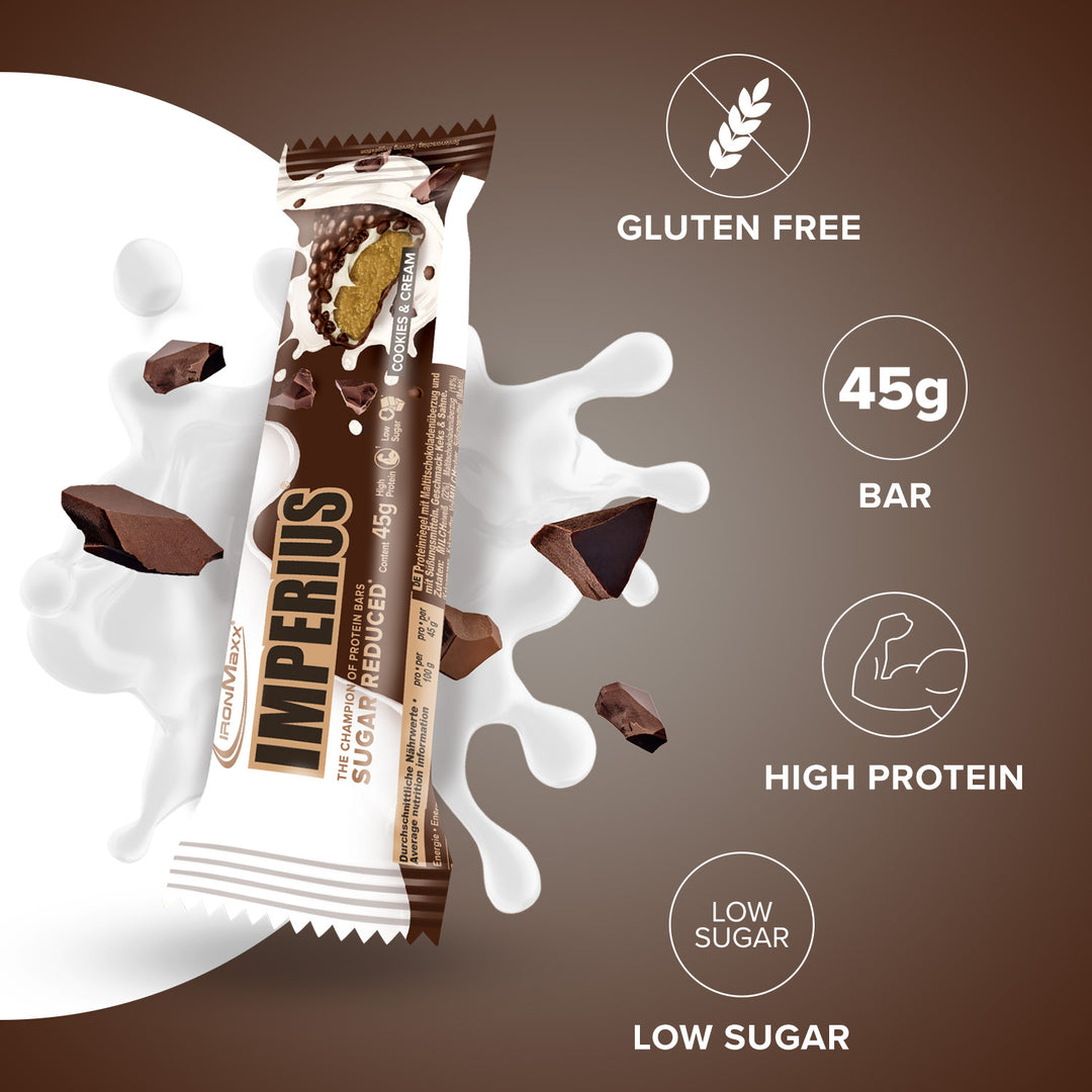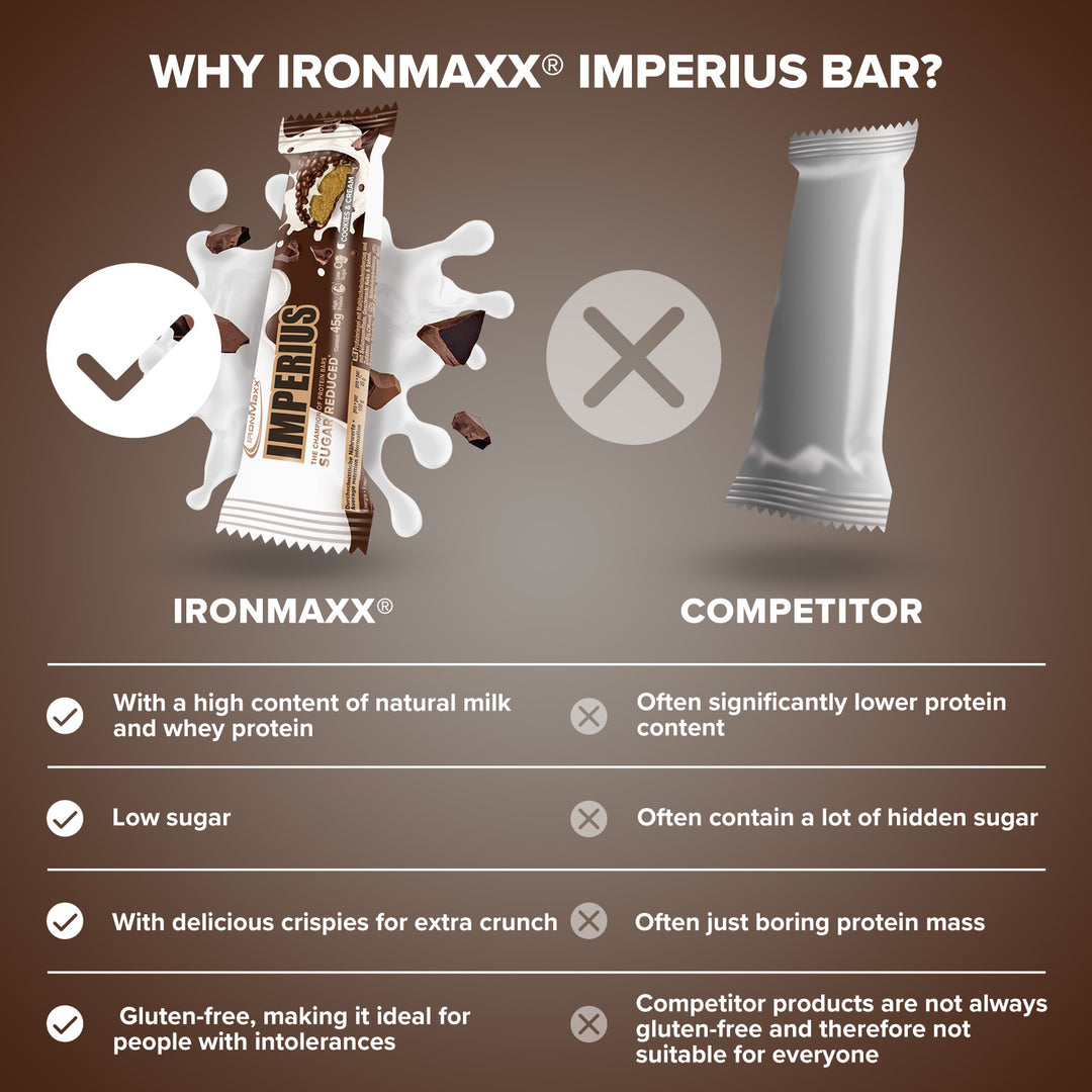 The IronMaxx® Imperius is your ultimate on-the-go protein snack – delivering 36 % premium protein from the finest whey and milk sources. This compact 45 g protein bar provides the perfect amount of protein for muscle growth and maintenance, ideal for active people and athletes.