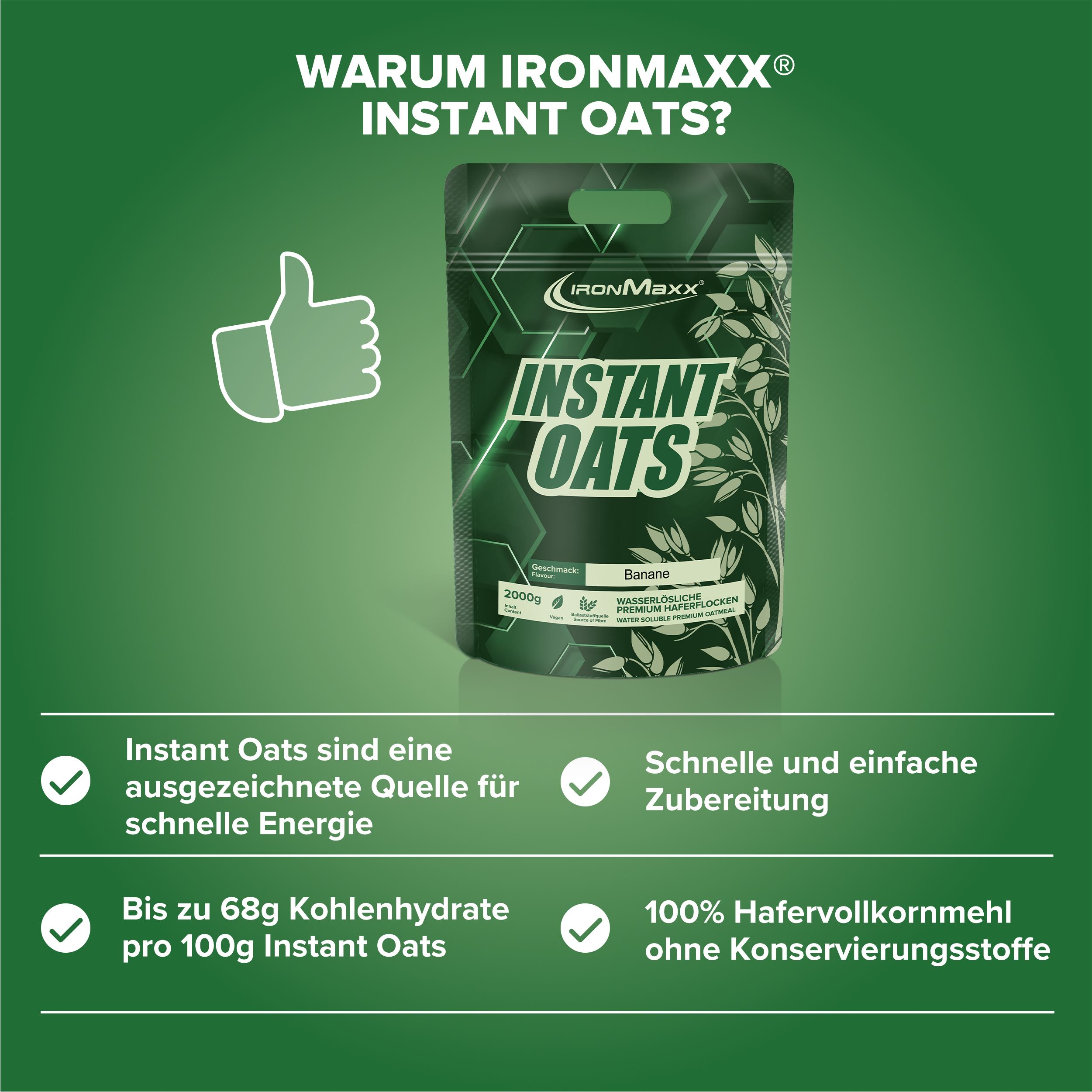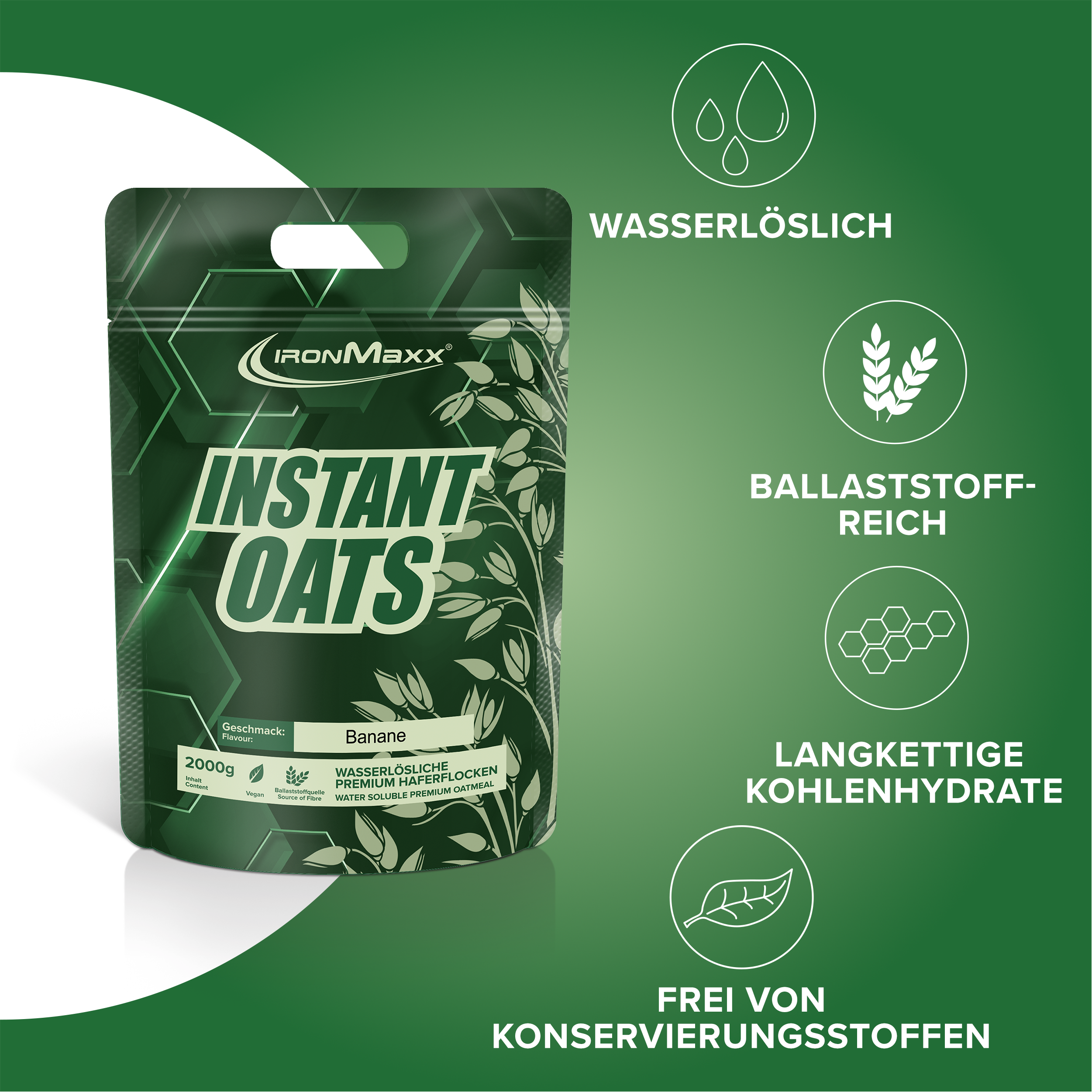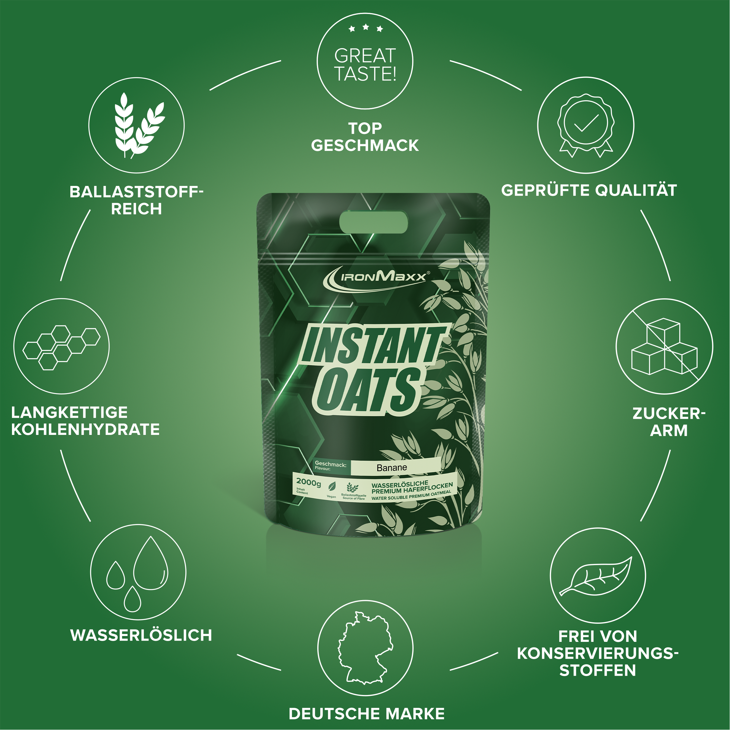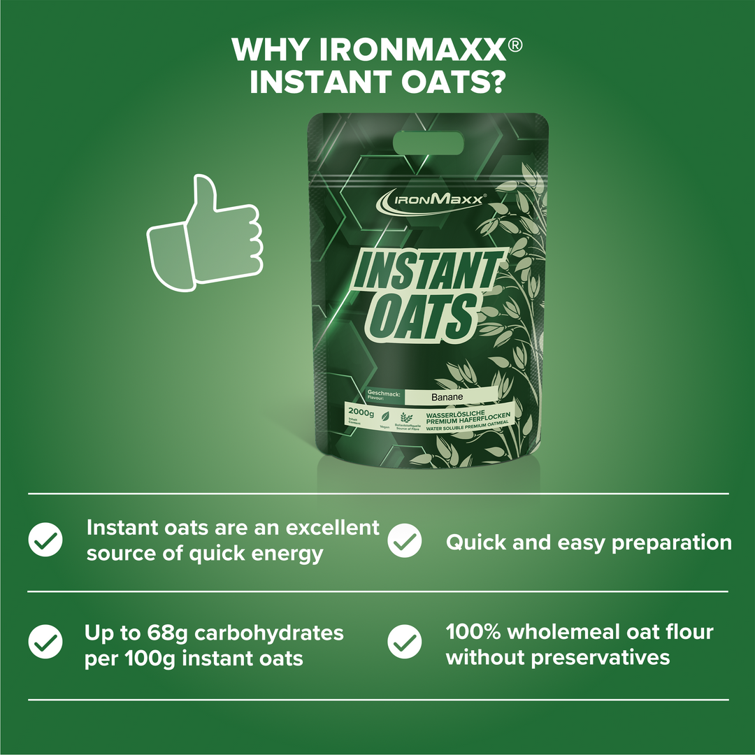 The IronMaxx® Instant Oats in your chosen flavour are made from finely ground wholegrain oat flakes and provide up to 68 g of complex carbohydrates and 15 g of protein per 100 g. Perfect for long-lasting energy and a balanced diet.