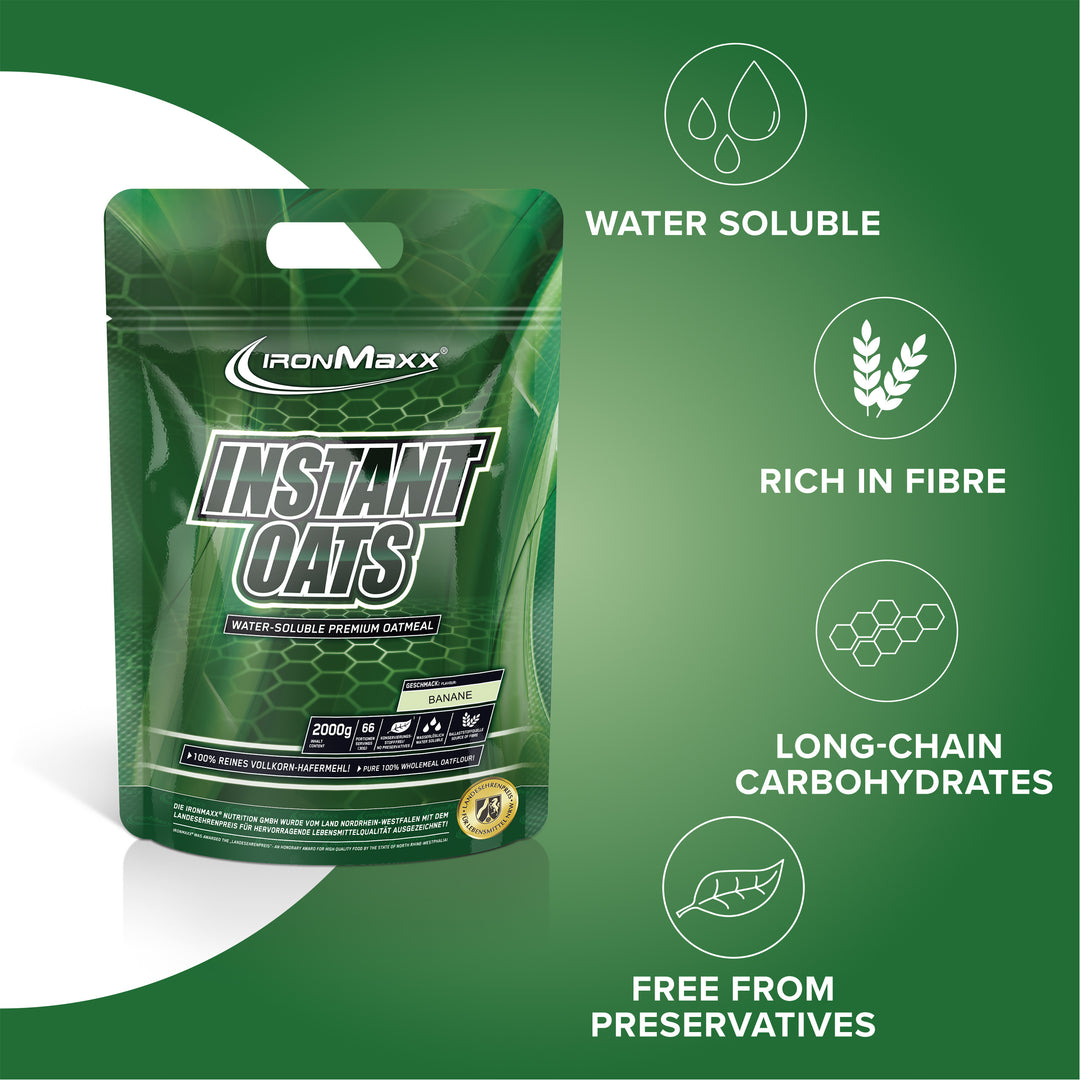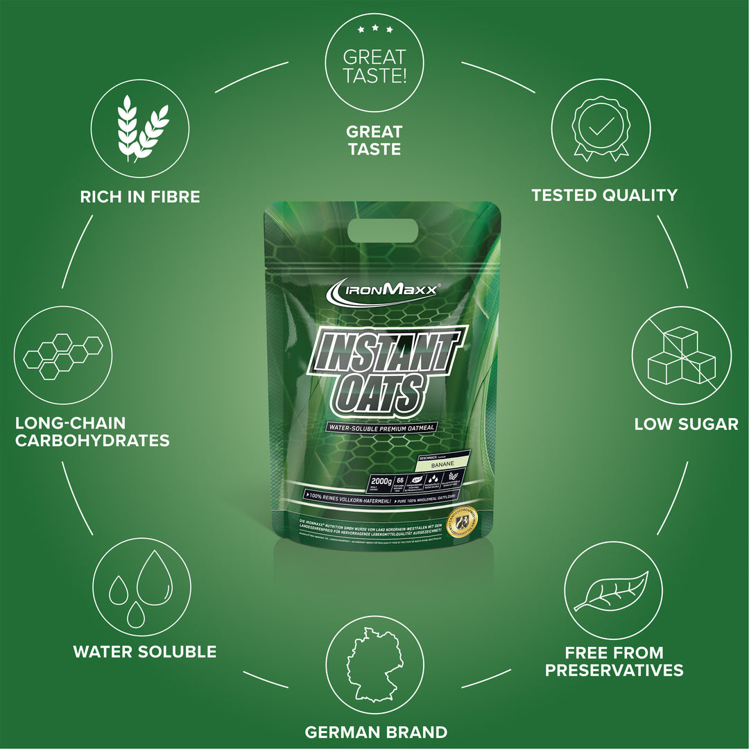 IronMaxx® Instant Oats in Banana Flavour are made from finely ground whole grain oats and deliver up to 68 g of complex carbohydrates and 15 g of protein per 100 g. This makes them the perfect base for long-lasting energy – ideal for breakfast, in a pre- or post-workout shake, or as a wholesome snack. Rich in fiber and quick to prepare, these oats support your digestion and fuel your active lifestyle. A smart choice for athletes and health-conscious individuals alike.