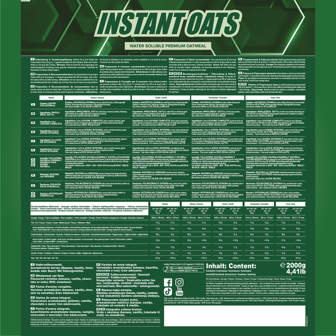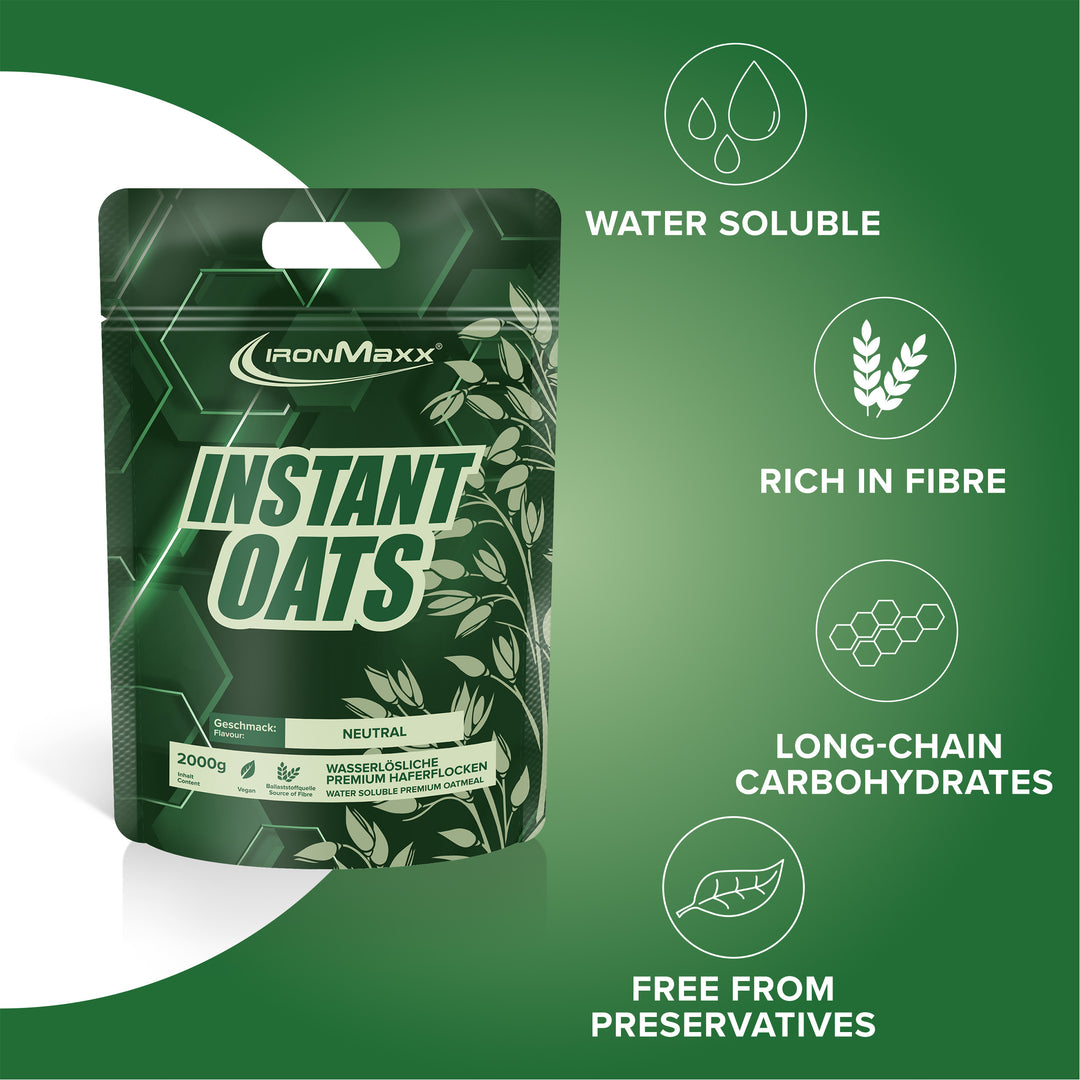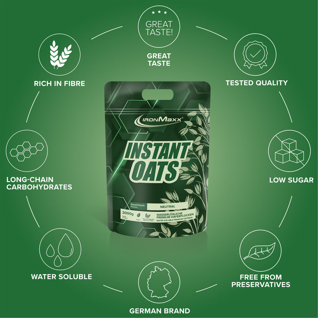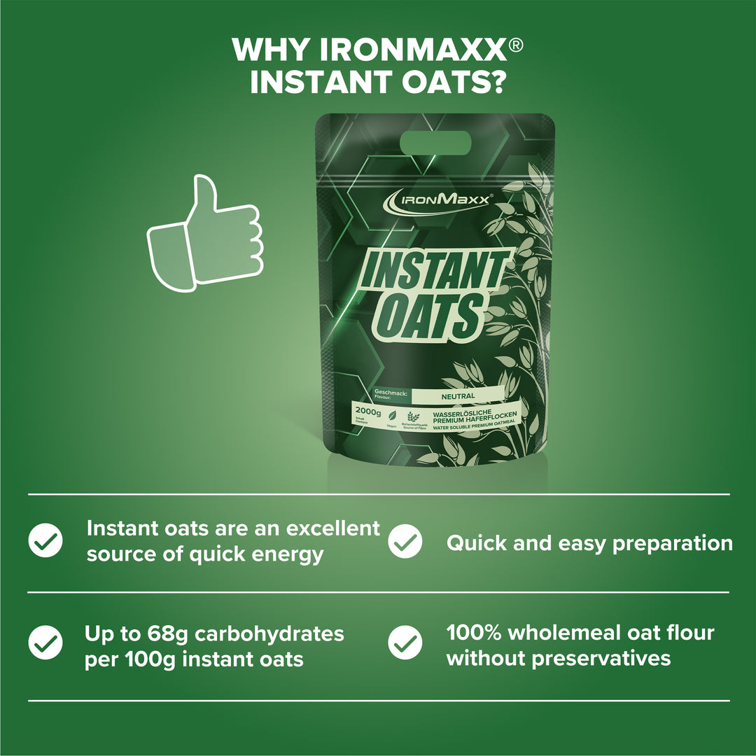 The IronMaxx® Instant Oats in your chosen flavour are made from finely ground wholegrain oat flakes and provide up to 68 g of complex carbohydrates and 15 g of protein per 100 g. Perfect for long-lasting energy and a balanced diet.