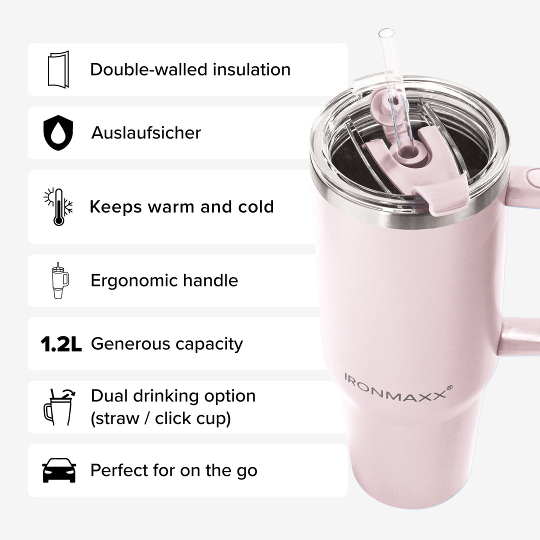 The IronMaxx® Handle Cup is your go-to companion for fitness, outdoor adventures, and daily routines. With a generous 1.2 l (40 oz) capacity, it keeps you perfectly hydrated wherever you are. Its double-wall insulation maintains your drinks hot or cold for hours. The leak-proof lid with built-in straw and ergonomic handle offer comfort and peace of mind. Featuring a stylish design with durable powder coating, it’s BPA-free, food-safe, and fits in standard cup holders – built to go wherever you go.