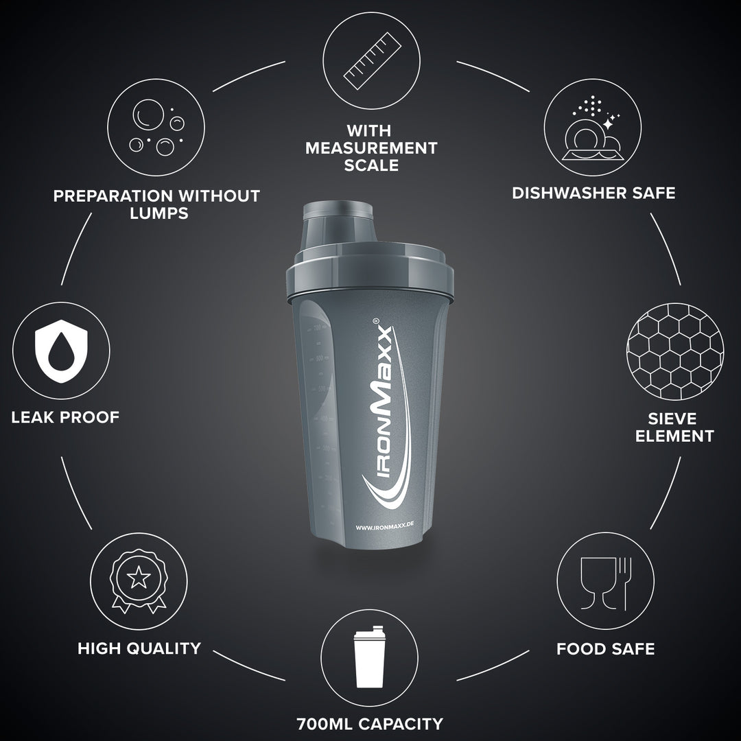 The classic IronMaxx® protein shaker is your reliable companion for creamy, lump-free shakes – anytime and anywhere. With a capacity of 700 ml, integrated sieve and precise measuring scale, every mixing ratio is perfectly achieved.