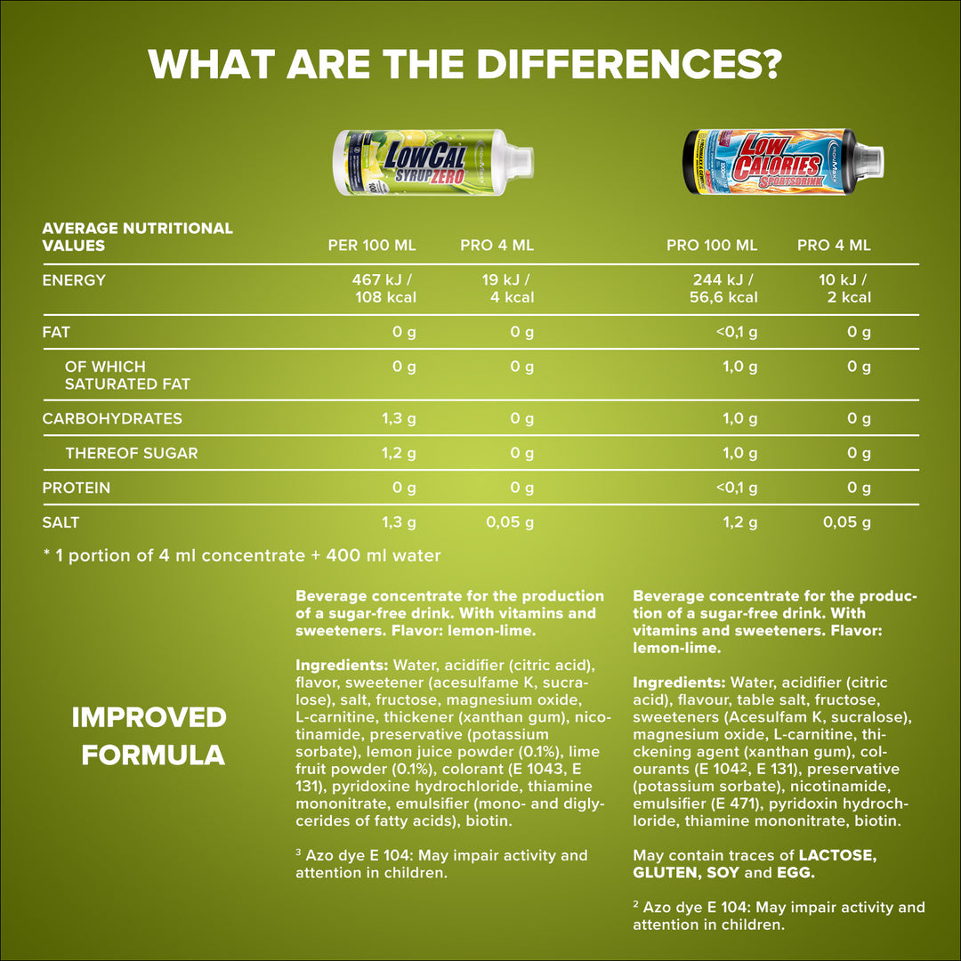 Water, acidifier (citric acid), flavoring, sweeteners (acesulfame K, sucralose), salt, fructose, magnesium oxide, L-carnitine, thickening agent (xanthan), nicotinamide, preservative (potassium sorbate), lemon juice powder (0.1%), lime fruit powder (0.1%), coloring agent (E 104*, E 131), pyridoxine hydrochloride, thiamine mononitrate, emulsifier (mono- and diglycerides of food fatty acids), biotin.