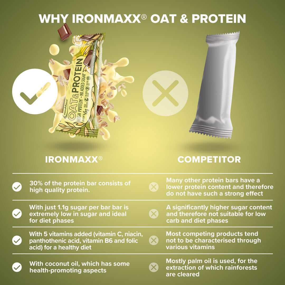 The IronMaxx® Oat & Protein Bar is your smart snack for stressful days – rich in protein, high in fiber, and with long-chain carbohydrates from whole grain oat flakes. With up to 26% protein and 16g of fiber per 100g, it supports muscle maintenance, satiety, and energy supply all in one. The double-layer structure of protein cream and oat base, refined with fruit pieces, soy crispies, and coated with white or milk chocolate, provides a genuine taste experience – completely without added sugar, without palm oil, and perfect for low-sugar phases. Available in Banana-Chocolate, Blueberry, Raspberry, and Chocolate Hazelnut.