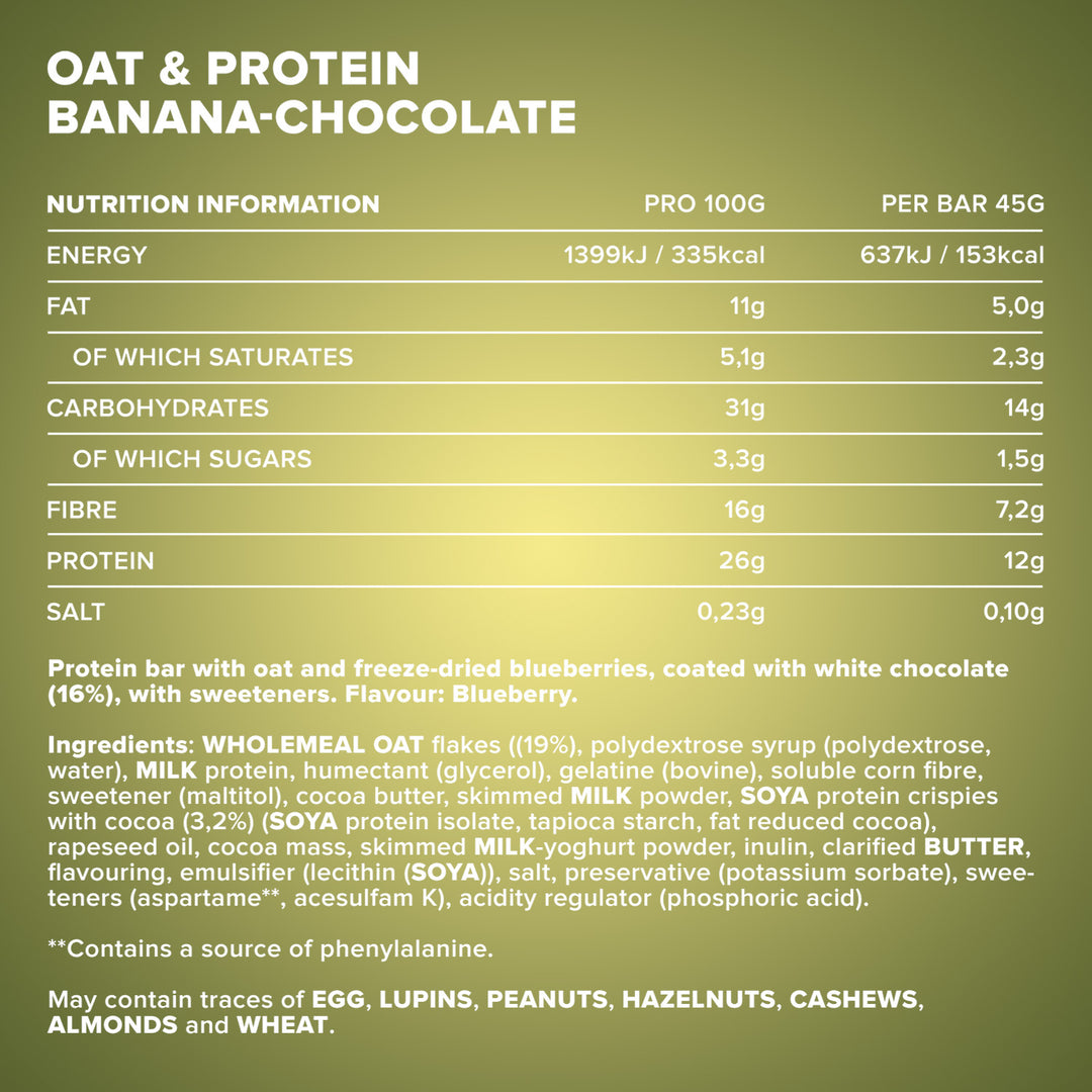 Legal Designation: Protein bar with oats, coated with milk chocolate (16%), with sweeteners. Flavor: Chocolate Banana.