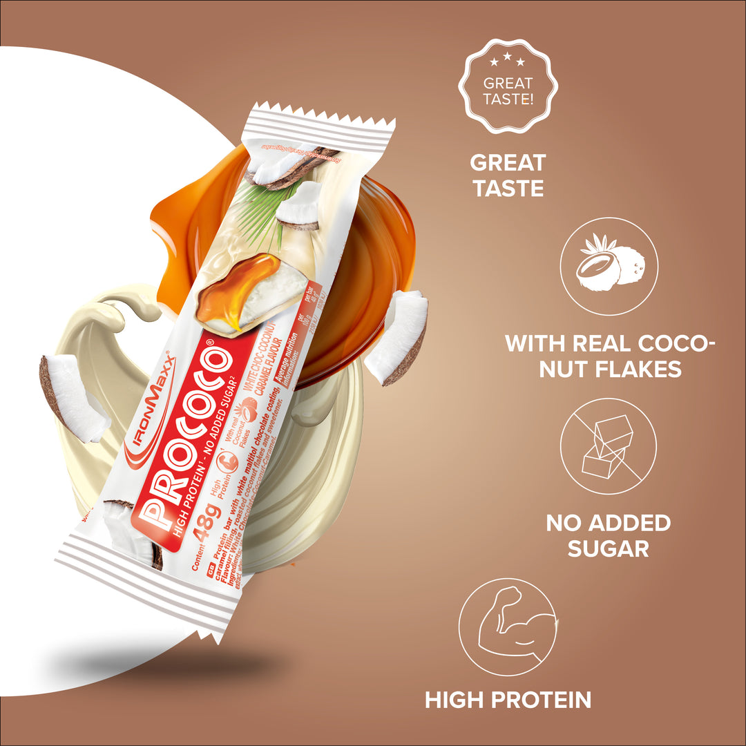 The IronMaxx® Protein Bar combines a creamy caramel filling, crunchy coconut flakes and a fine chocolate coating for a unique taste experience. Each bar (48 g) provides 12 g of high-quality protein to support muscle growth and recovery.