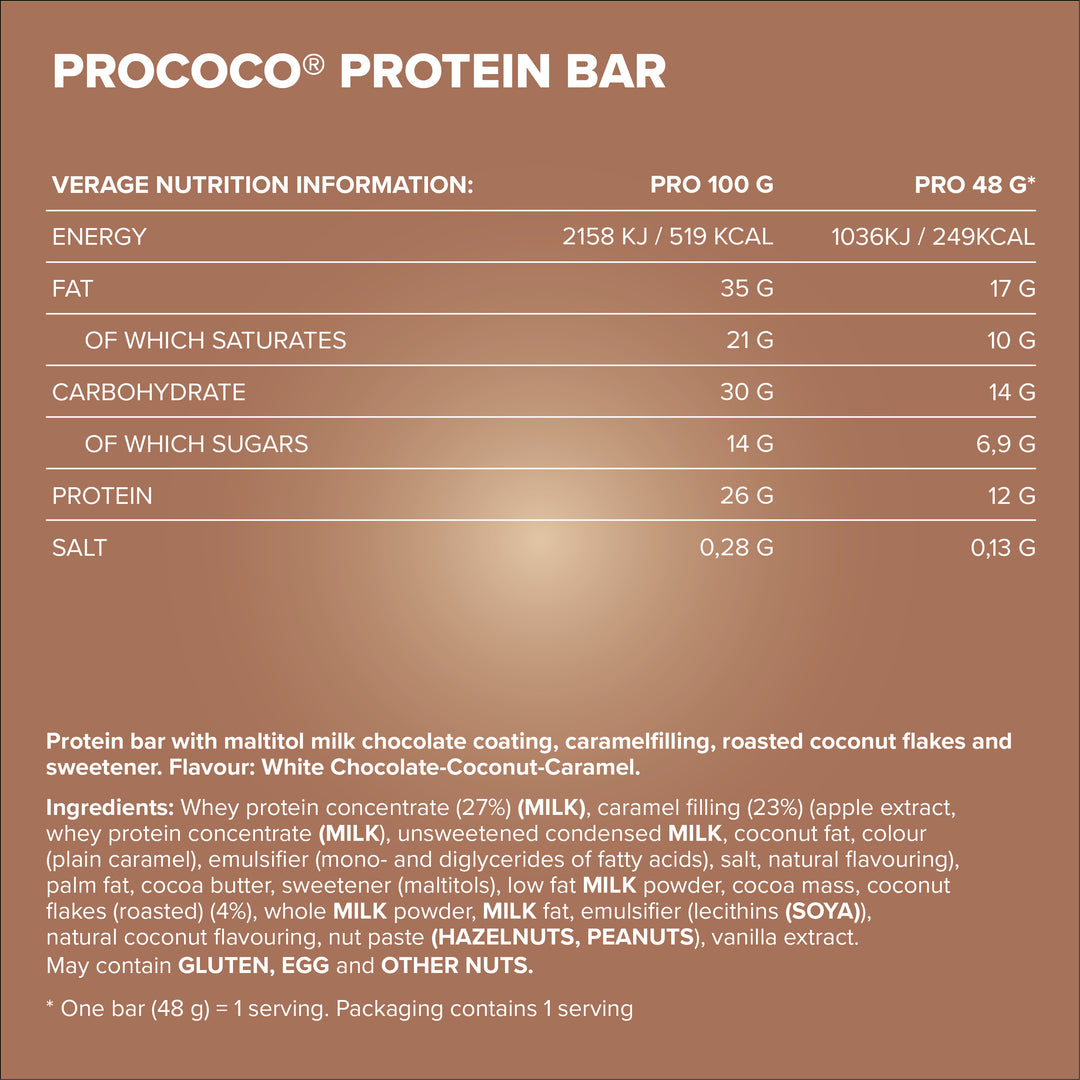 Whey protein concentrate (30%) (MILK), caramel filling (17%) (apple extract, whey protein concentrate (MILK), unsweetened condensed MILK, coconut fat, colouring (caramelised sugar)), emulsifier (mono- and diglycerides of fatty acids), salt, natural flavouring), palm fat, sweetener (maltitol), cocoa butter, skimmed MILK powder, roasted coconut flakes (3%), whole MILK powder, MILK fat, emulsifier (lecithins (SOYA)), natural coconut flavouring, nut paste (HAZELNUTS, PEANUTS), vanilla extract. May contain traces of GLUTEN, EGG and OTHER NUTS.