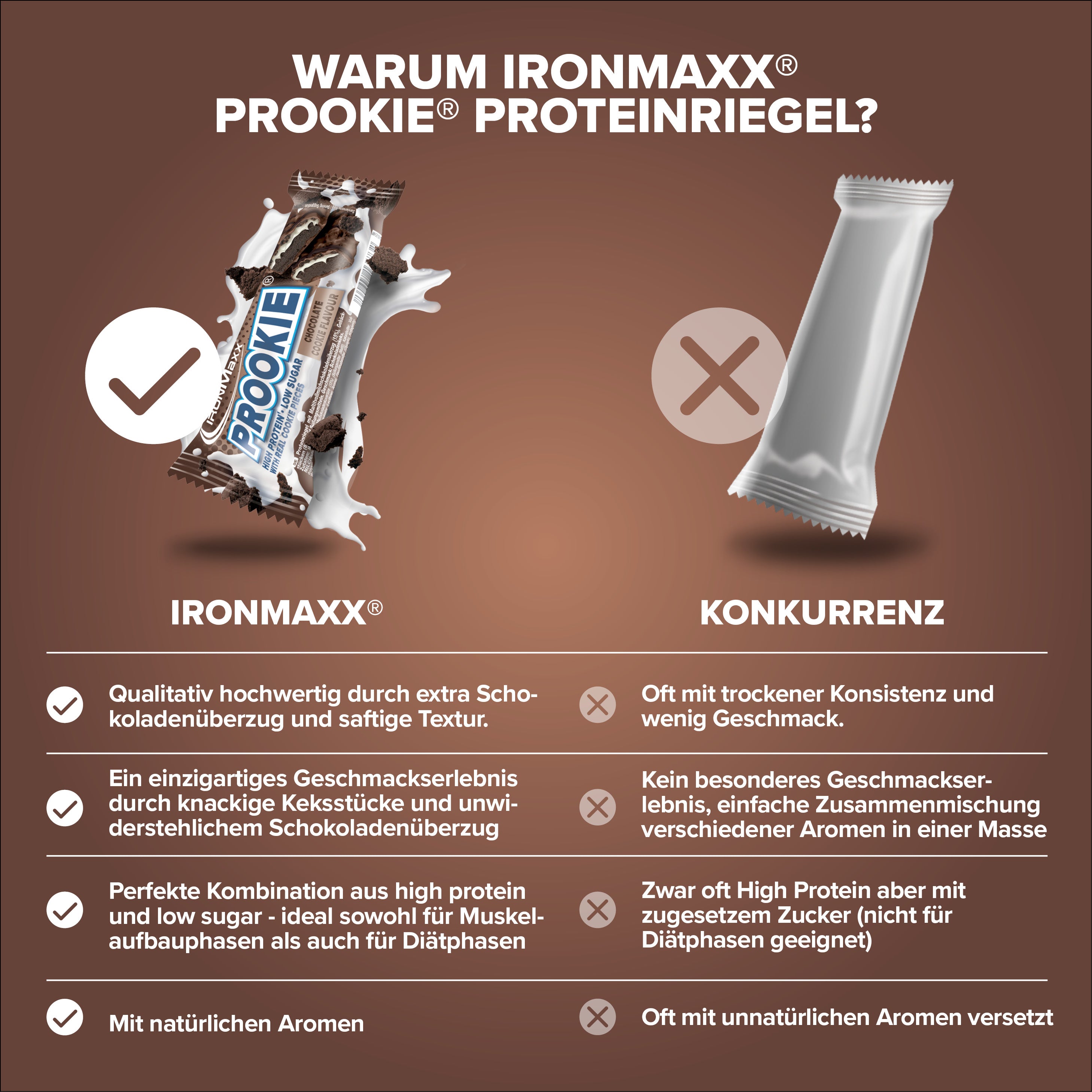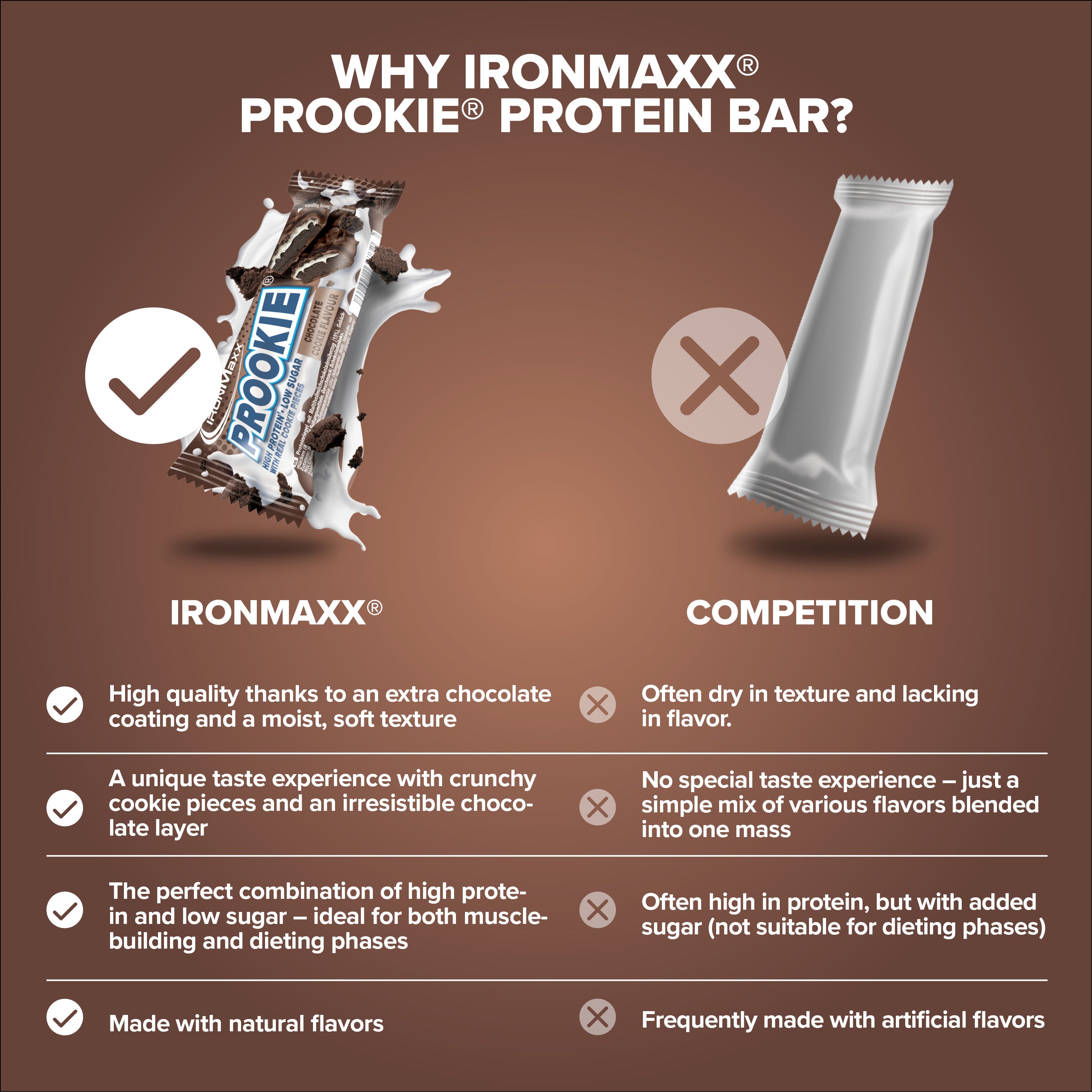 IronMaxx® Prookie® – the protein bar with authentic cookie flavour and powerful nutrition. With 30 g of high-quality protein per 100 g, it actively supports muscle growth and recovery – perfect for sport, fitness and active lifestyles.