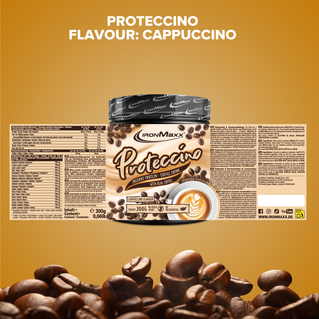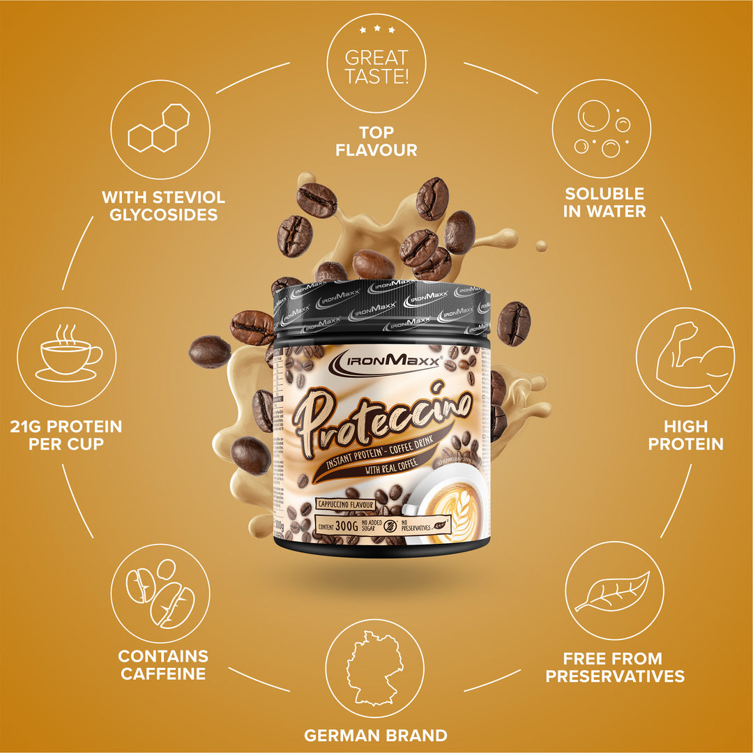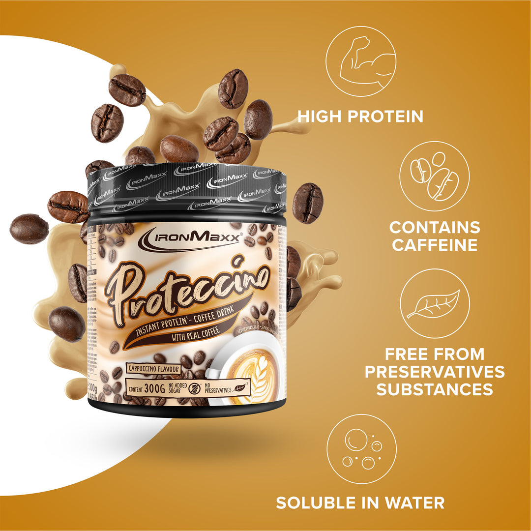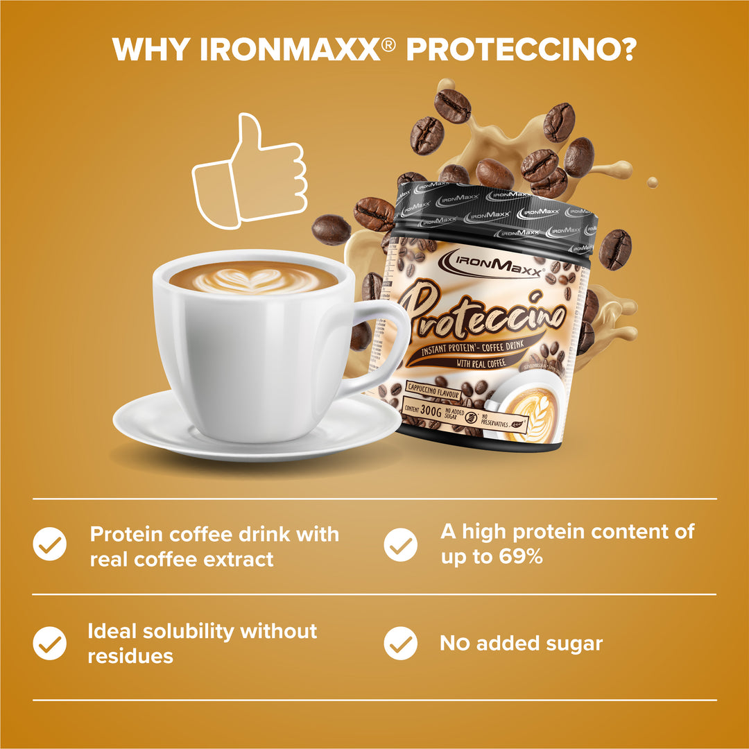 Kaffee oder Protein? Mit dem IronMaxx® Proteccino bekommst du beides – in einem cremigen Instant-Drink mit echtem Kaffee-Extrakt und bis zu 69 % Molkeneiweiß. Perfekt als Frühstücks-Booster, Pre-Workout-Drink oder proteinreicher Genussmoment.