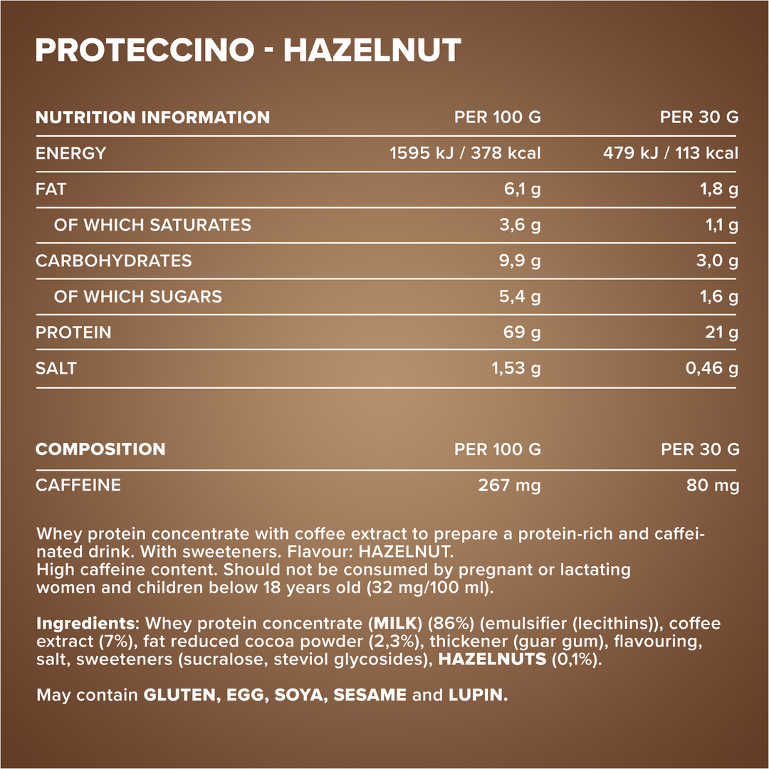 Whey protein concentrate (MILK) (86%) (Emulsifier (Lecithins)), Coffee extract (7%), Strongly defatted cocoa powder (2.3%), Thickener (Guar gum), Flavouring, Salt, Sweeteners (Sucralose, Steviol glycosides from Stevia), HAZELNUTS (0.1%). May contain traces of GLUTEN, EGG, SOYA, SESAME and LUPIN.