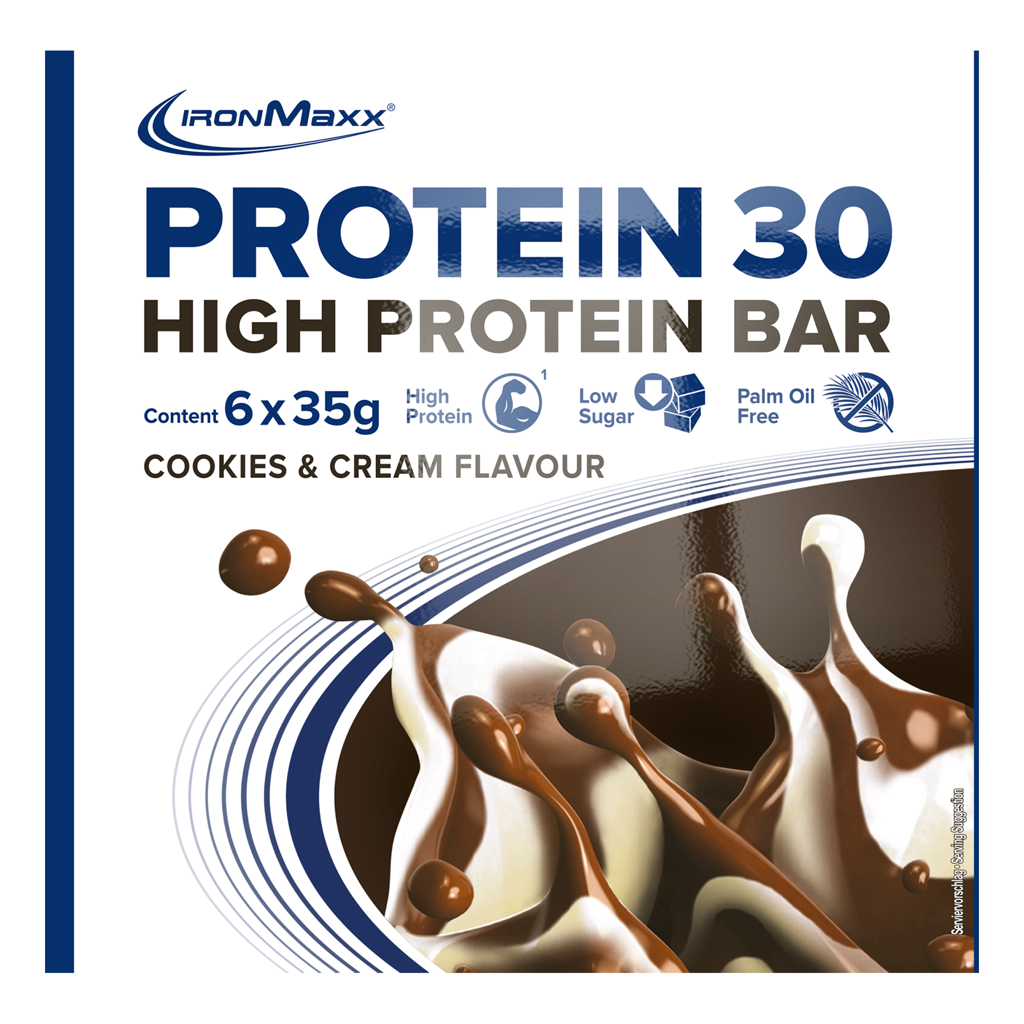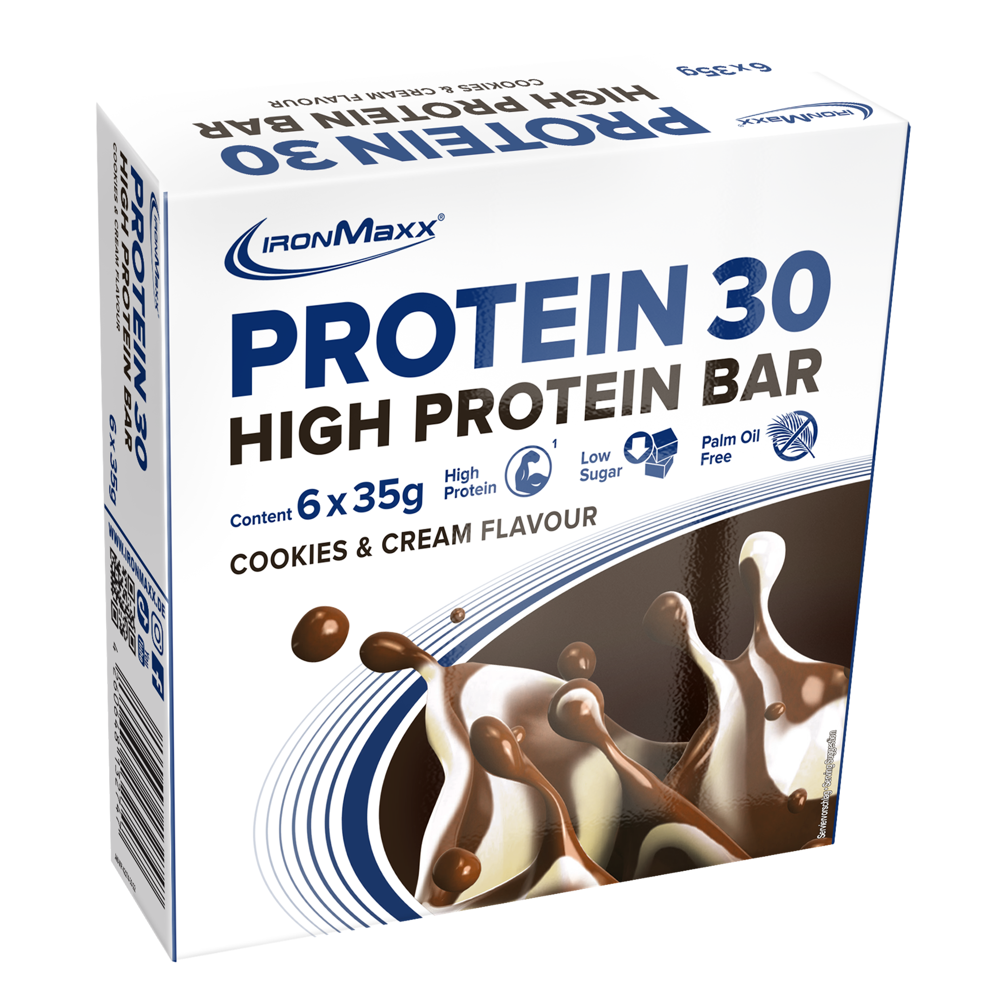 IronMaxx® Protein Bar 30 is your compact, high-performance snack. Weighing just 35 g, it’s the perfect grab-and-go protein boost—ideal pre-, intra-, or post-workout, or anytime you need quick, clean fuel. With 30 % premium protein from whey, milk, and soy, it supports muscle growth and maintenance. Free from palm oil and low in sugar, each bar also delivers 15 % of your daily needs for vitamin C, B6, niacin, and pantothenic acid. Available in indulgent flavors like Chocolate, Banana, Coconut, and Cookies & Cream – protein never tasted this good.