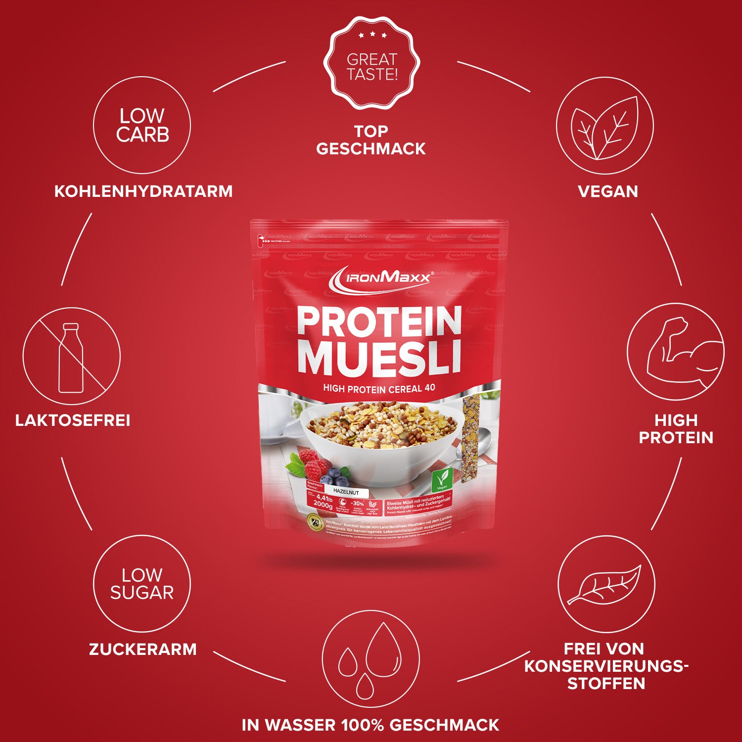 - Protein-rich start to the day: IronMaxx® Protein Muesli provides complex carbohydrates, fibre and protein – ideal for an energising breakfast.