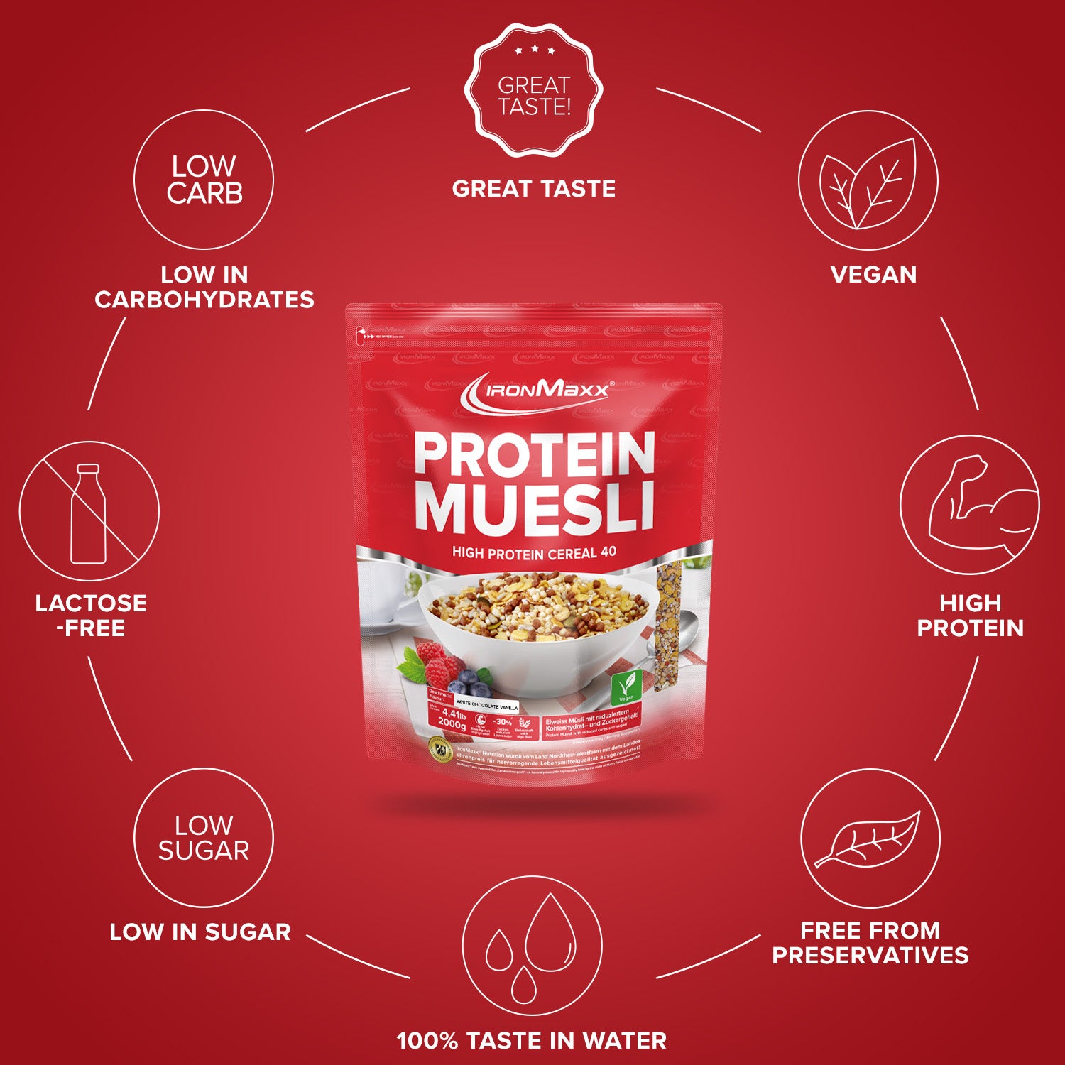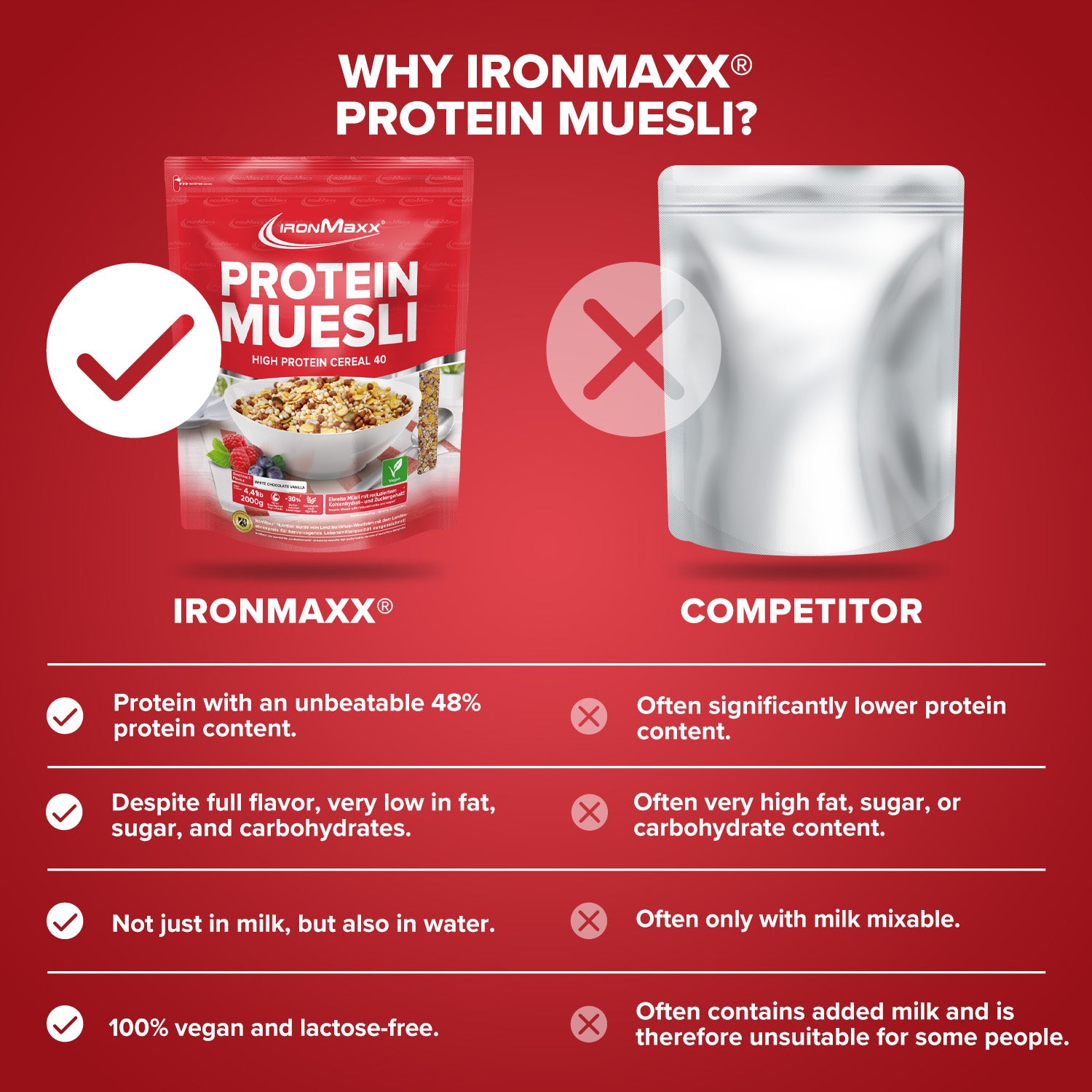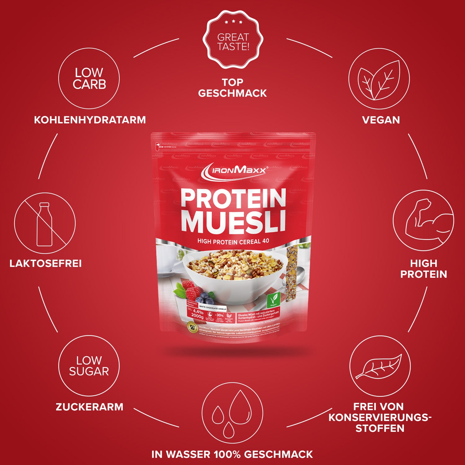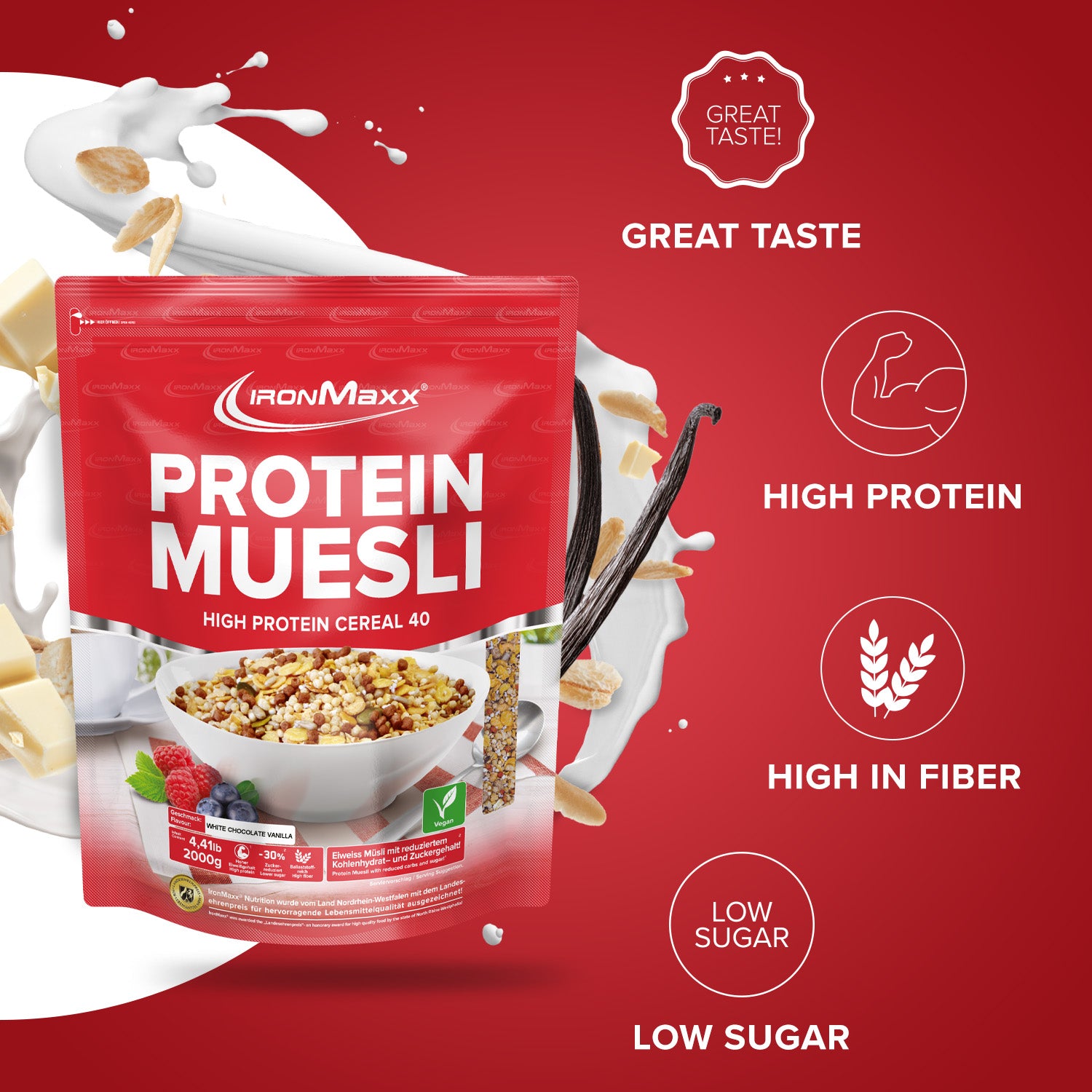 - Protein-rich start to the day: IronMaxx® Protein Muesli provides complex carbohydrates, fibre and protein – ideal for an energising breakfast.