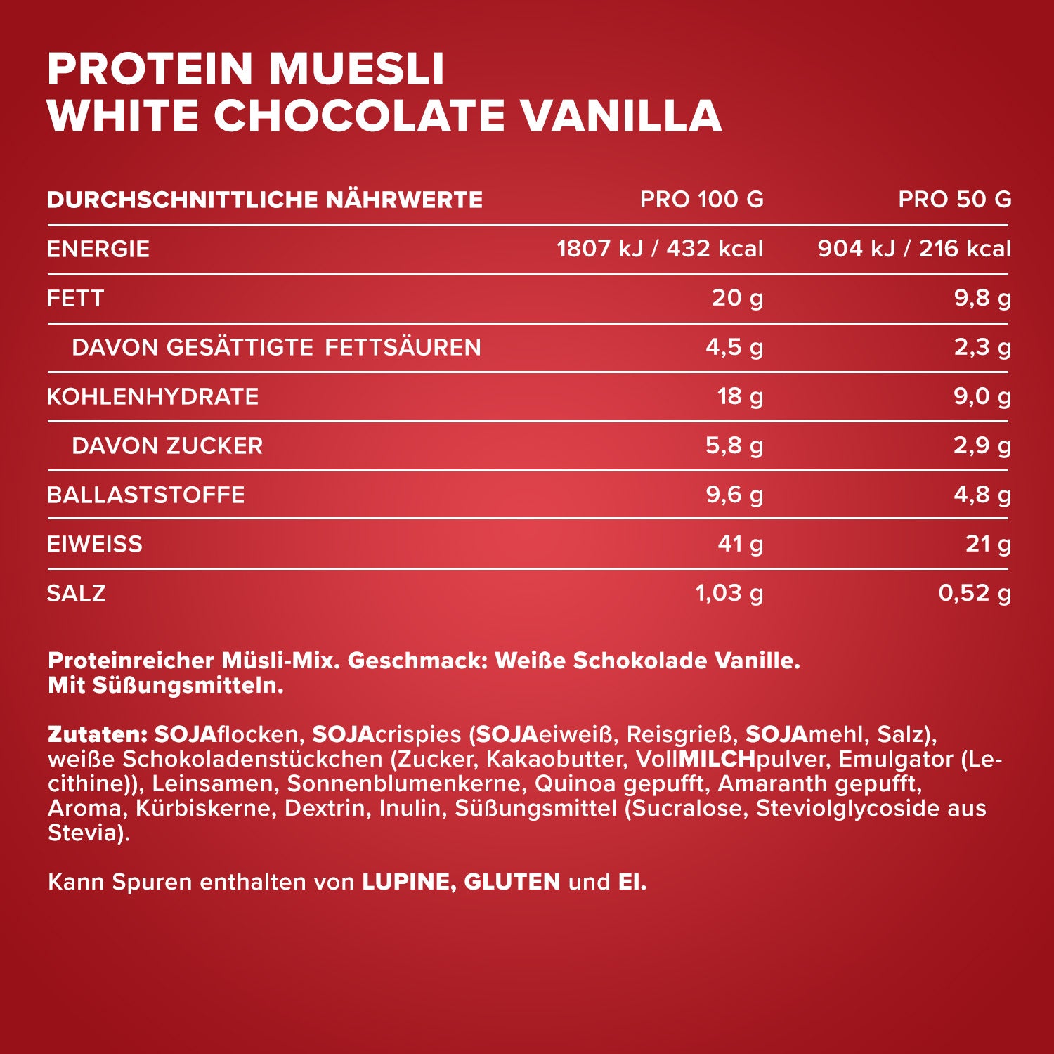 Store protected from heat, moisture, and sunlight. Proteins contribute to an increase in muscle mass. A balanced and varied diet and a healthy lifestyle are important. 30% less carbohydrates and sugar compared to conventional muesli.