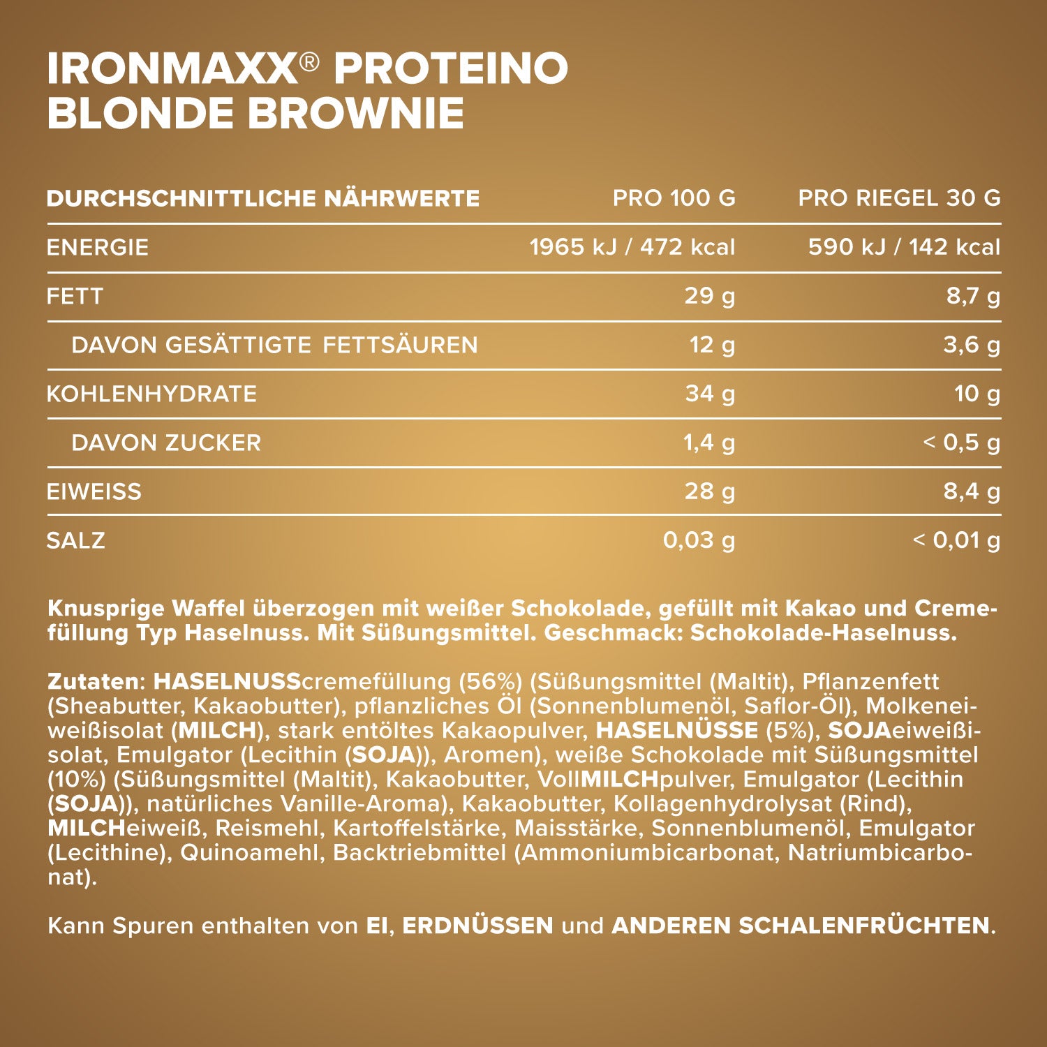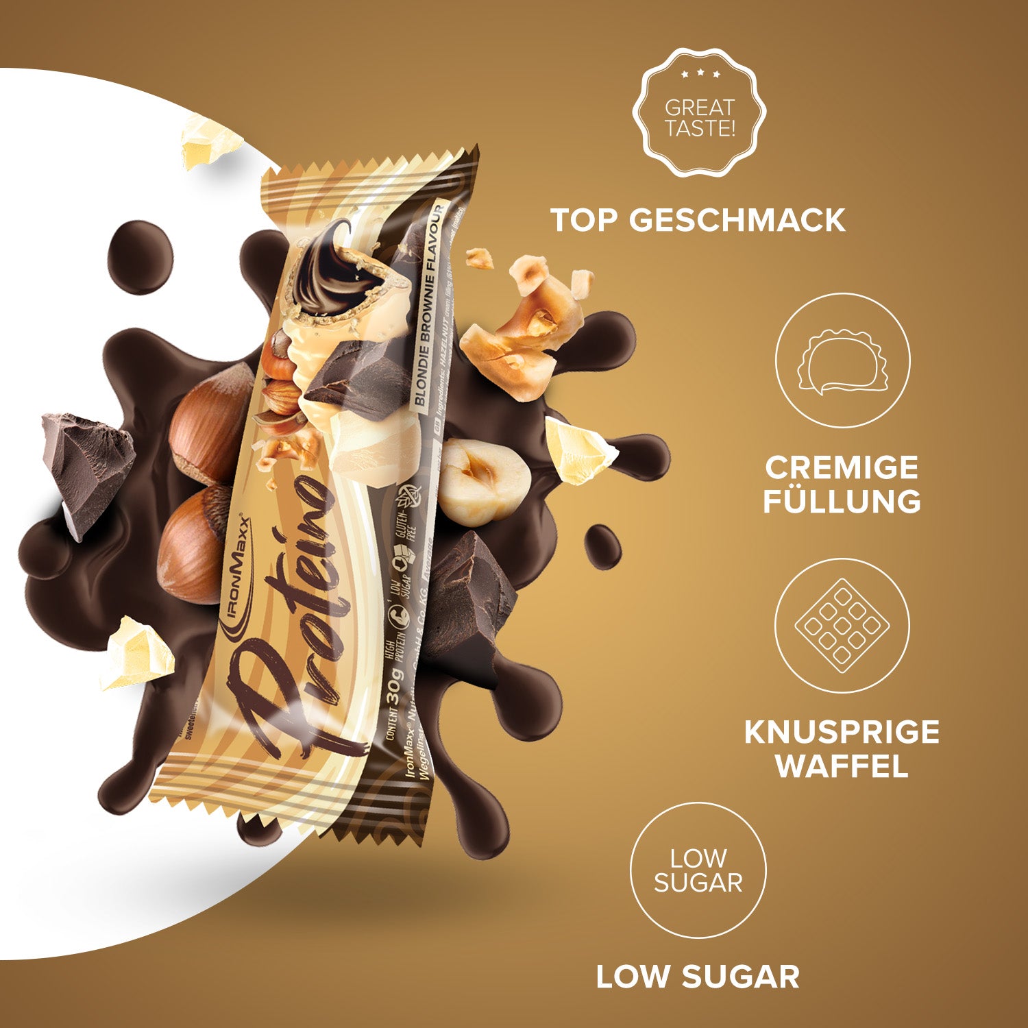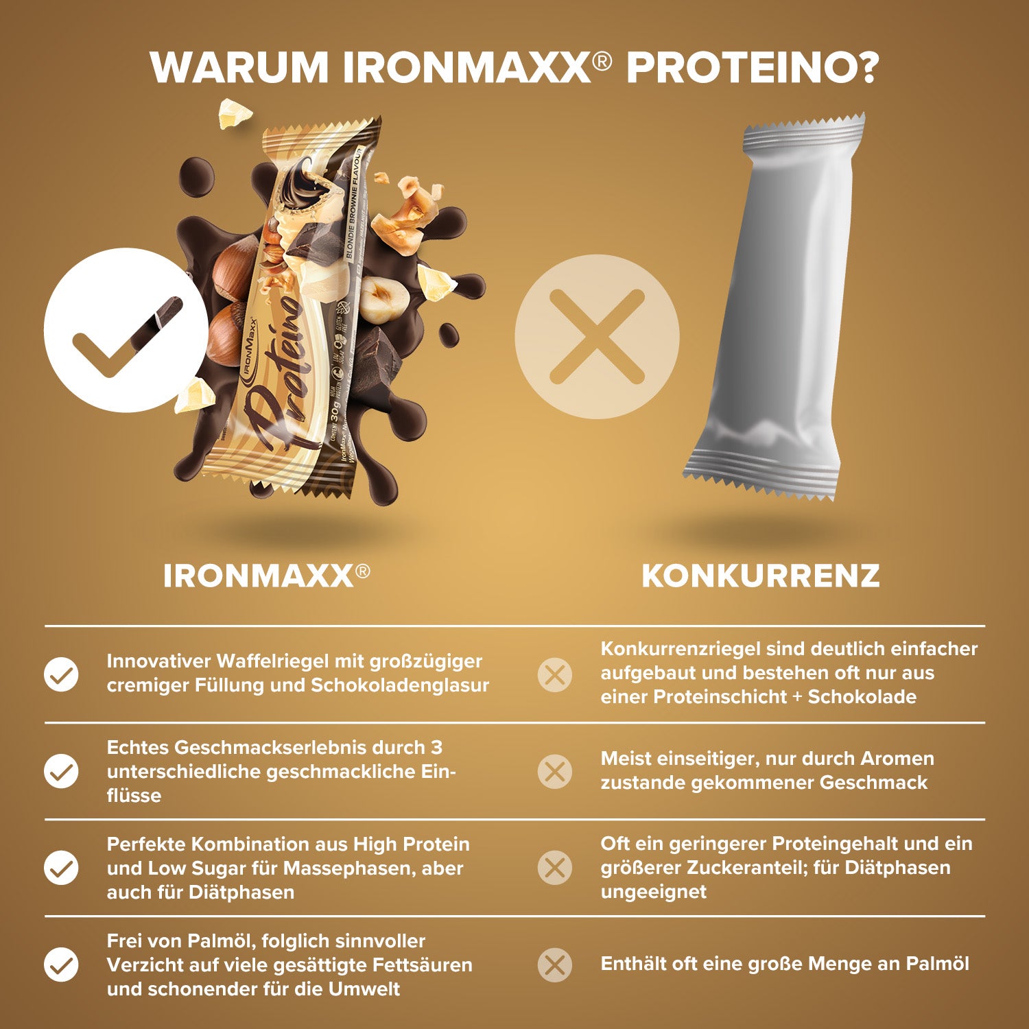 Proteino® by IronMaxx® is the protein bar chocolate lovers have been waiting for: a crispy wafer, silky-smooth filling and a fine chocolate coating make it a true highlight – with less than 1.5 g of sugar per bar.