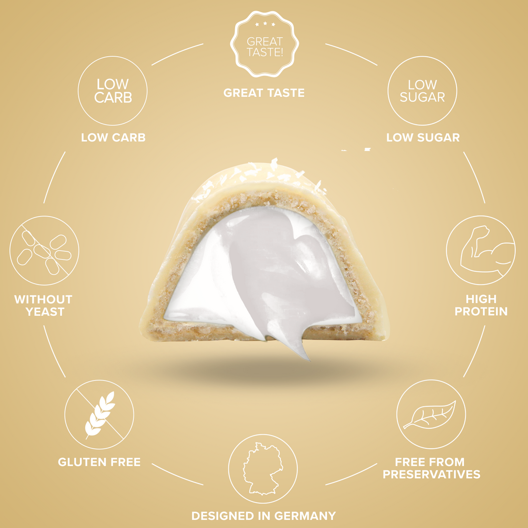 Cream filling type coconut-white chocolate (56%) (MILK protein, sunflower oil, fructooligosaccharides, white chocolate with sweeteners (6.8%) (cocoa butter, whole MILK powder, emulsifier (lecithin (SOY)), sweetener (maltitol), natural vanilla flavor), collagen hydrolysate (beef), whole MILK powder, cocoa butter, Emulsifier (lecithin (SOY)), vanilla extract, sweetener (sucralose), natural coconut flavor), white chocolate with sweeteners (11.9%) (cocoa butter, Emulsifier (lecithin (SOY)), whole MILK powder, sweetener (maltitol), natural vanilla flavor), collagen hydrolysate (beef), cocoa butter, MILK protein, rice flour, Potato starch, coconut flakes (0.6%), corn starch, sunflower oil, emulsifier (lecithins), quinoa flour, raising agents (sodium bicarbonate, ammonium bicarbonate).