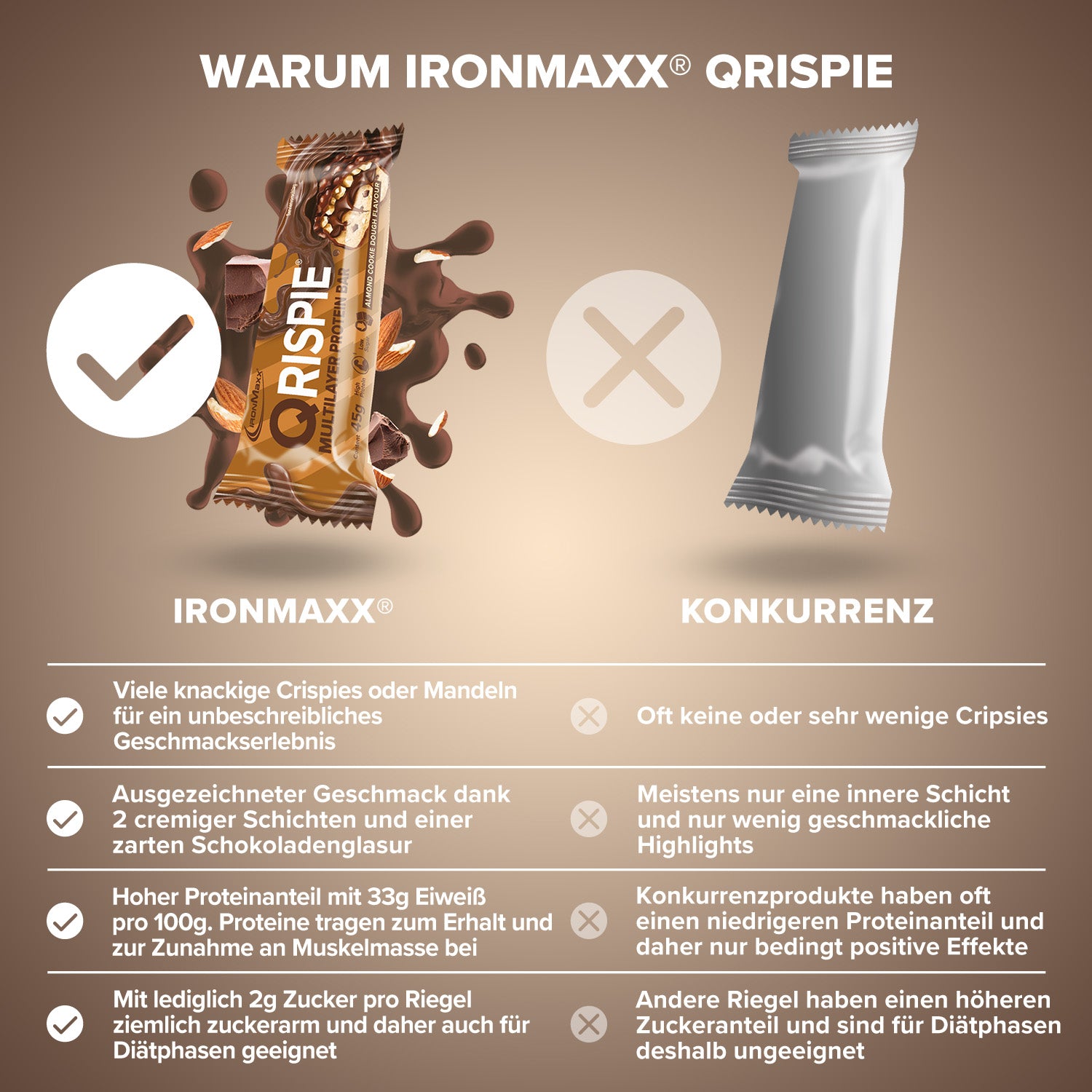IronMaxx® Qrispie ist ein mehrschichtiger Proteinriegel, der knusprige Crispies mit einer cremigen Füllung kombiniert und so für ein intensives Snack-Erlebnis sorgt. Mit 33 g Eiweiß pro 100 g liefert Qrispie hochwertiges Eiweiß und eignet sich ideal für alle, die Genuss und Funktionalität verbinden möchten.