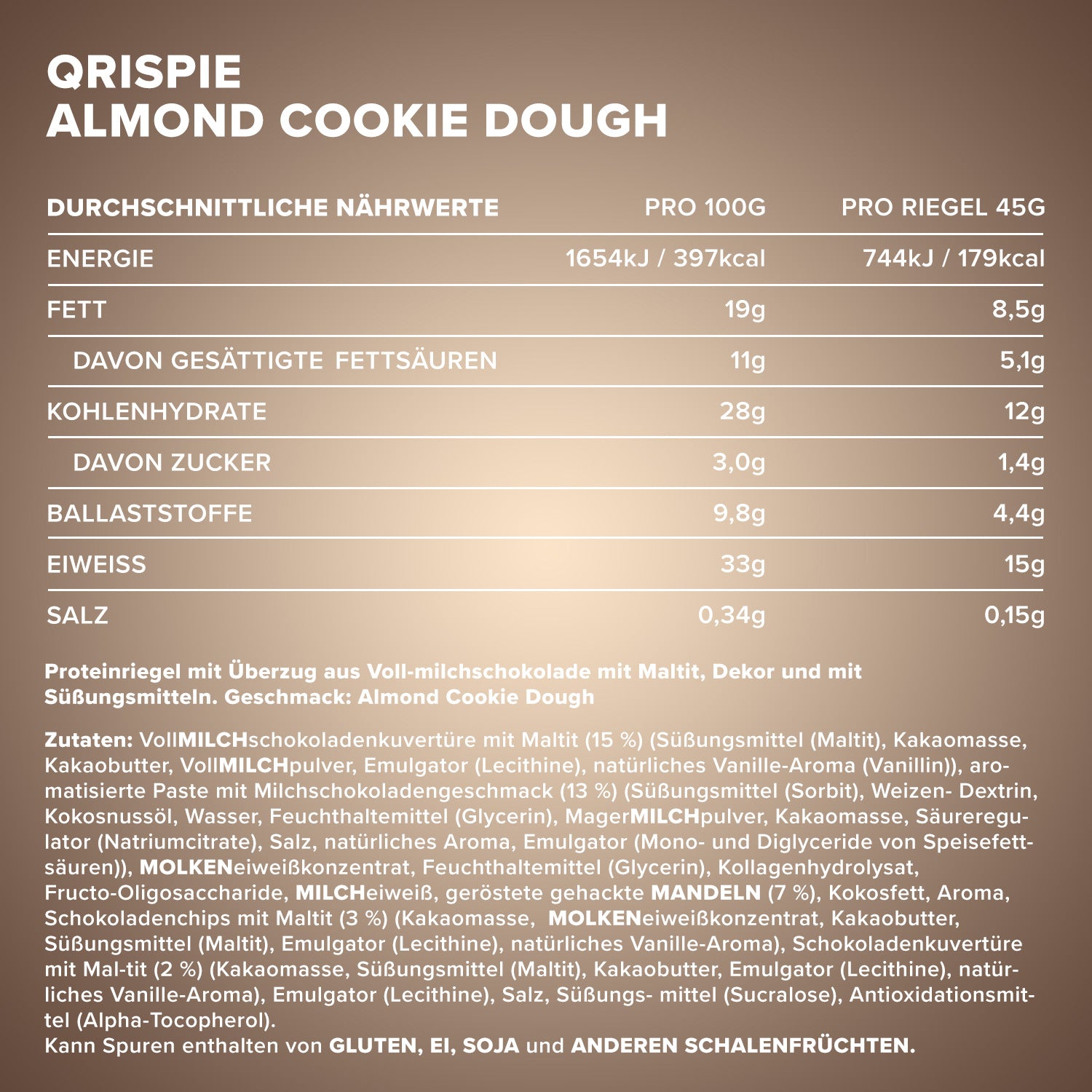 Die feine Kombination aus Mandel-Cookie-Dough und weißem Schokoladenkaramell überzeugt durch vollen Geschmack bei gleichzeitig zuckerarmer Rezeptur mit maximal 1,6 g Zucker pro Riegel. Proteine tragen zum Erhalt und Aufbau von Muskelmasse bei – perfekt als Snack im Alltag, rund ums Training oder für bewusste Genussmomente zwischendurch.