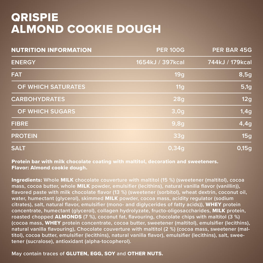 Product Name: Protein bar coated with whole milk chocolate with maltitol, decorated and with sweeteners. Flavor: Almond cookie dough.