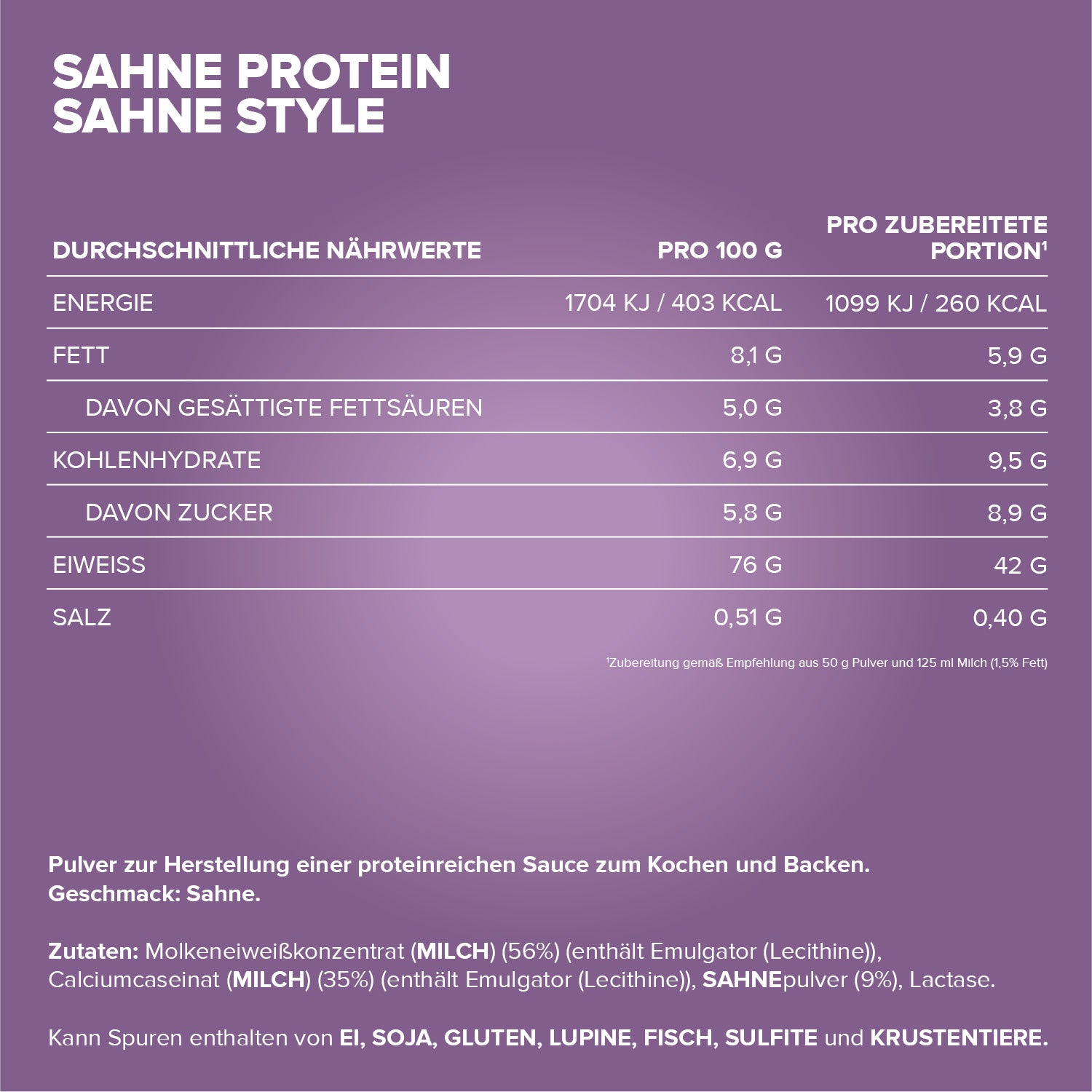 Legal designation: Protein powder for the preparation of a protein-rich sauce. With lactase.