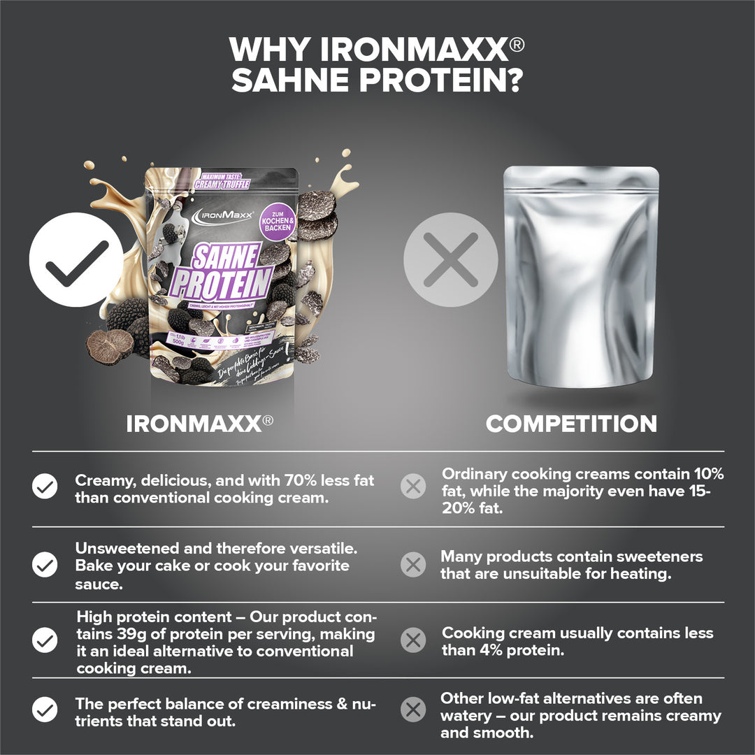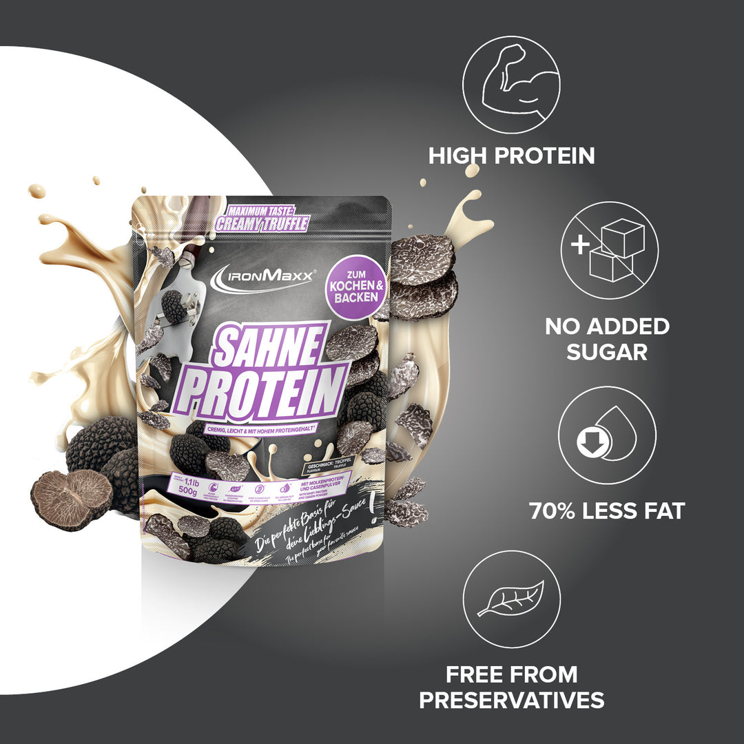 Ob für herzhafte Saucen, cremige Suppen oder leckere Aufläufe – das Sahne Protein sorgt für vollen Geschmack und eine angenehme Konsistenz, ganz ohne schlechtes Gewissen. Ideal für Sportler, Figurbewusste oder alle, die ihren Gerichten einen proteinreichen und fettarmen Boost verleihen möchten. Mit IronMaxx® bringst du Genuss und Funktionalität in perfekte Balance – kochen war noch nie so leicht!