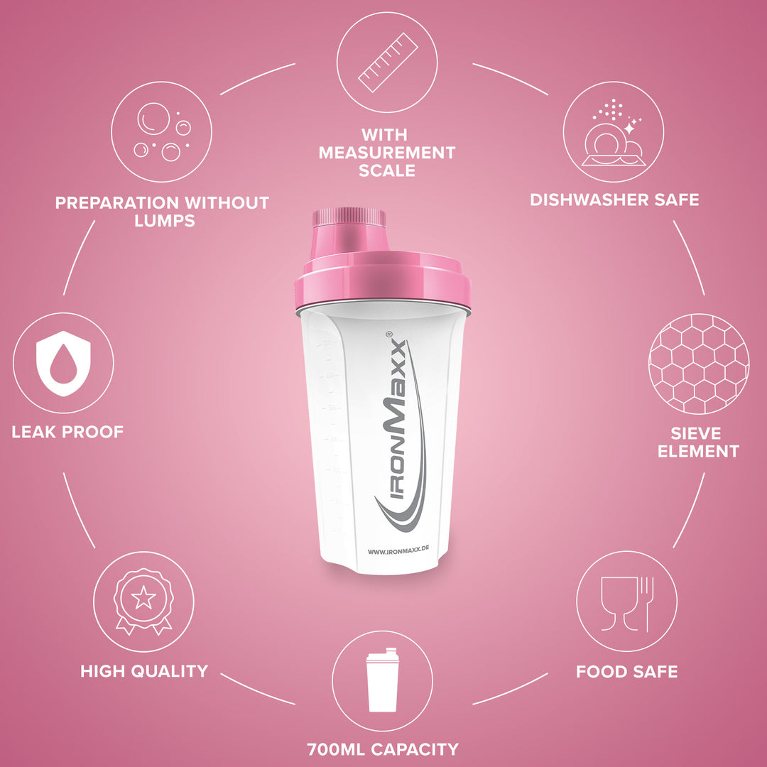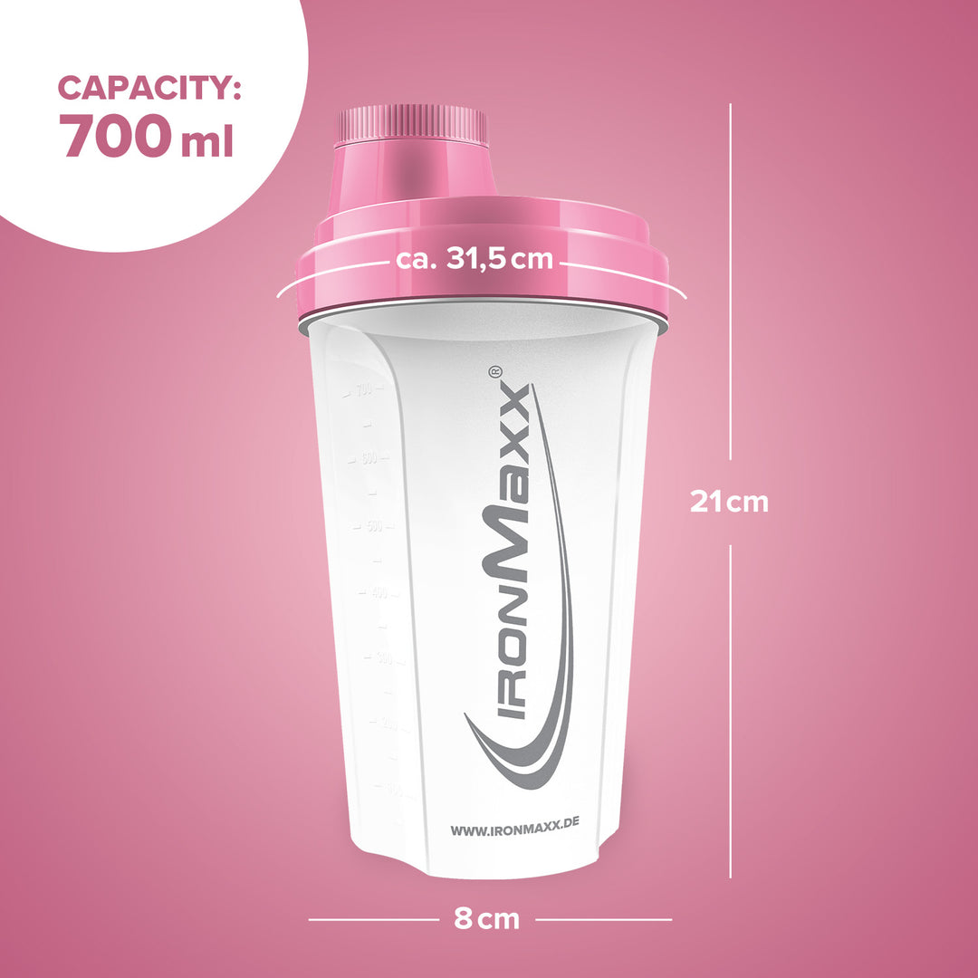 The classic IronMaxx® protein shaker is your reliable companion for creamy, lump-free shakes – anytime and anywhere. With a capacity of 700 ml, integrated sieve and precise measuring scale, every mixing ratio is perfectly achieved.