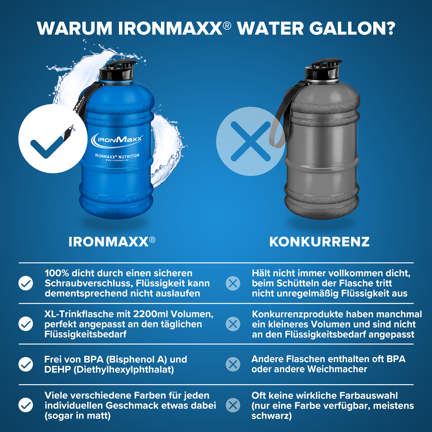 - Your motivational helper to drink enough fluids: The Water Gallon from IronMaxx®!