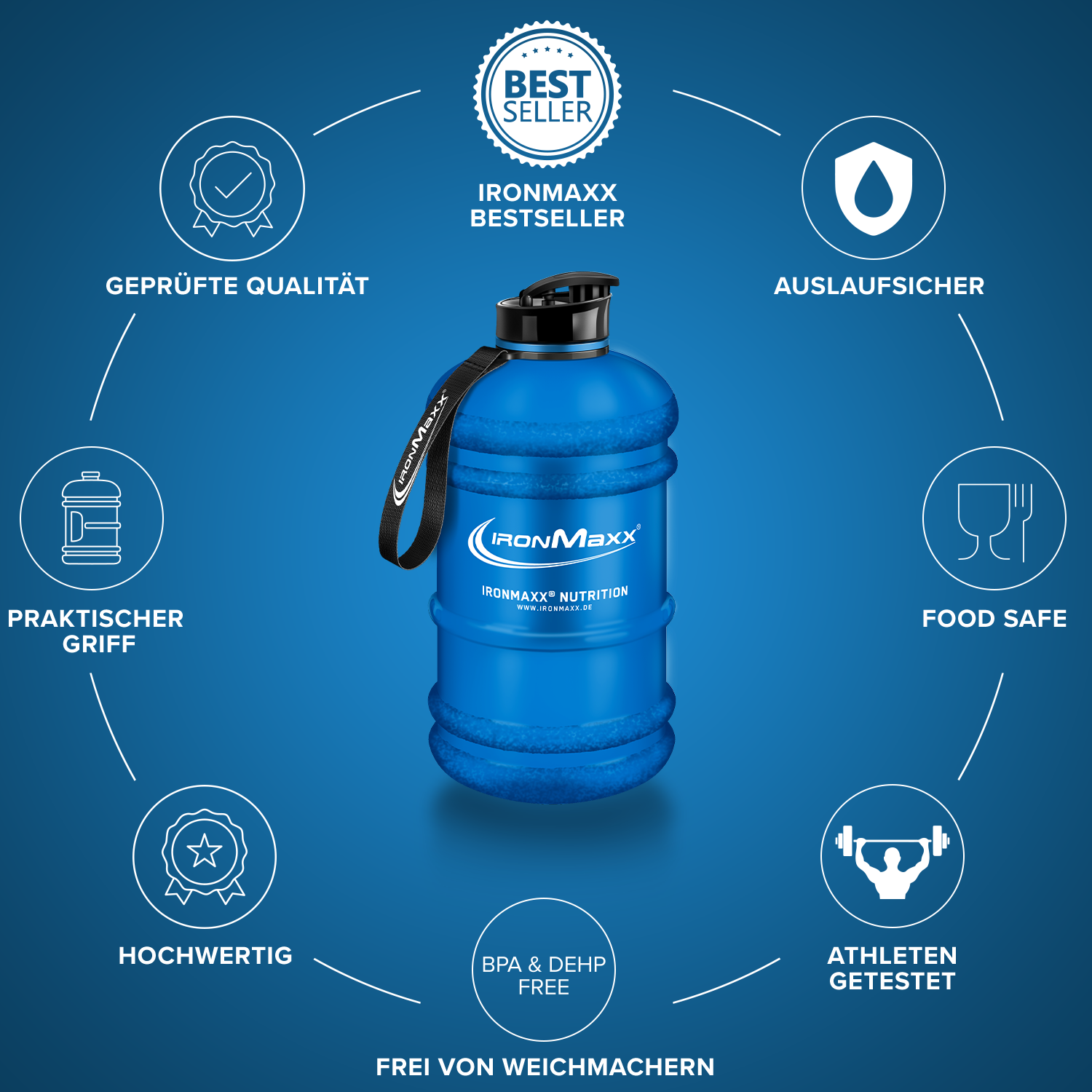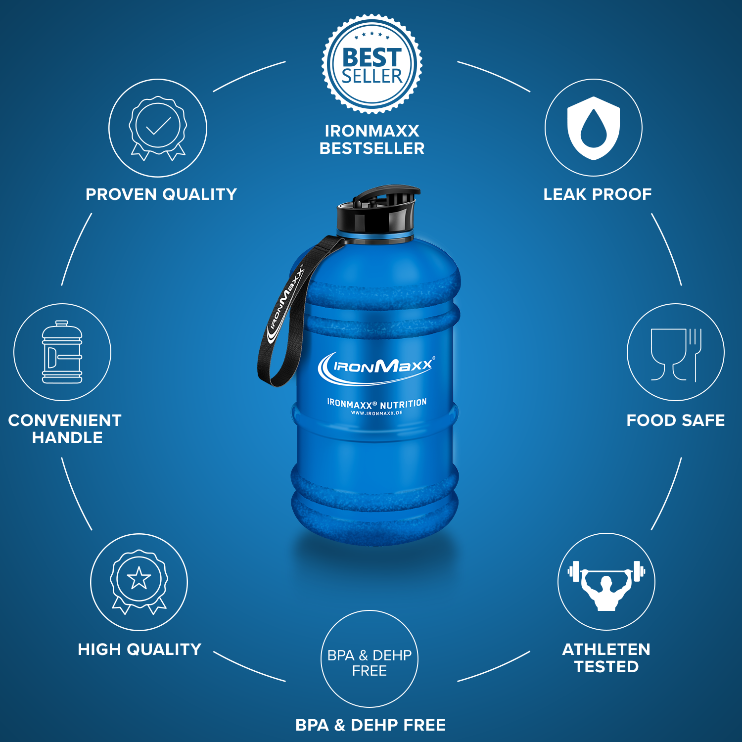 Struggling to drink enough water during the day? The IronMaxx® Water Gallon in Matt Blue is here to help! With a 2.2-liter capacity, this XL water bottle keeps you hydrated all day long – at the gym, at work, or on the go. Featuring a convenient carry strap, textured grip handle, and clear volume scale, it keeps you in control of your hydration goals.