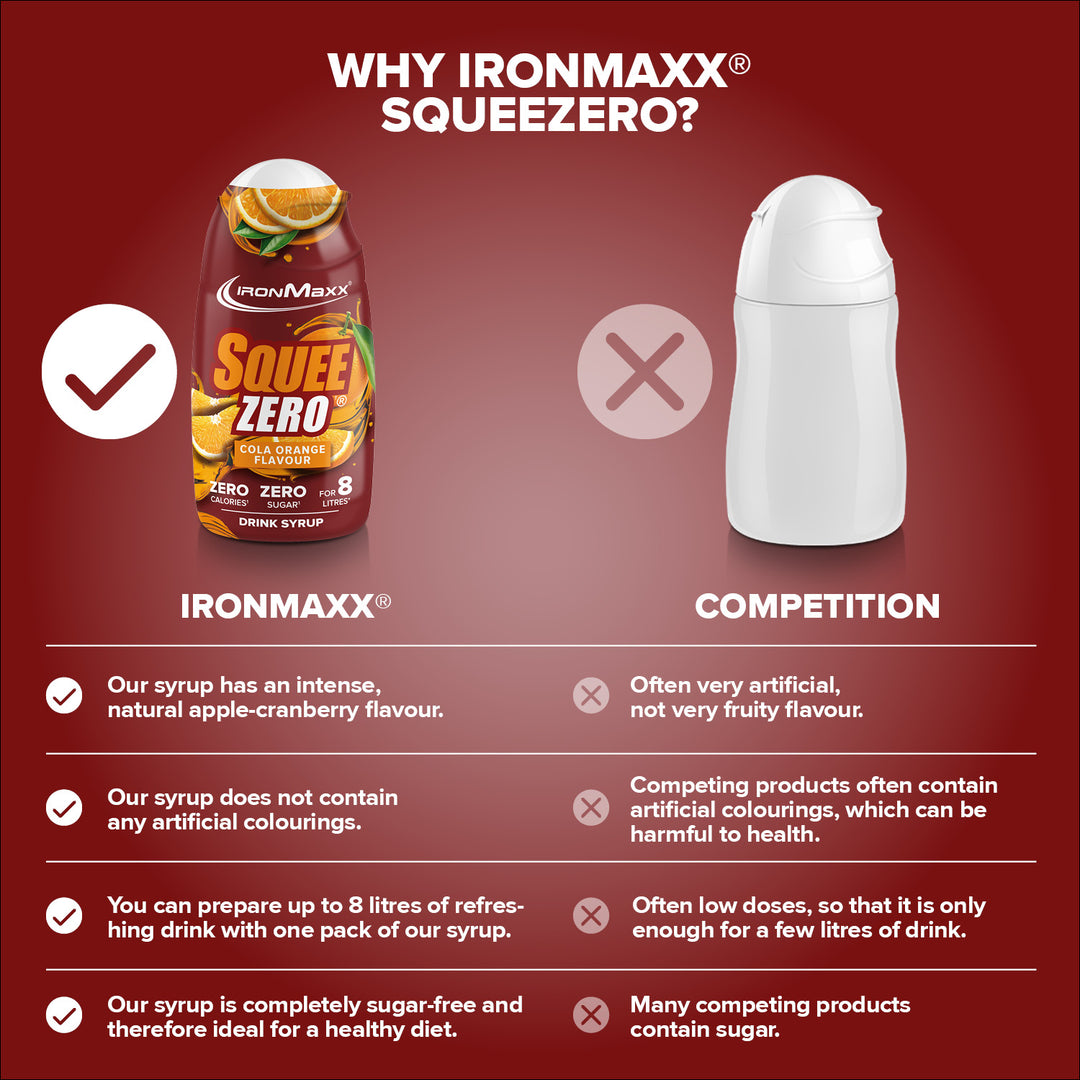 IronMaxx® SqueeZero – the sugar-free & calorie-free drink concentrate that transforms plain water into a refreshing fitness drink. With just a few drops, you create a full-flavour beverage without sugar or calories. Each 65 ml bottle makes up to 8 litres of ready-to-drink refreshment, helping you stay motivated to drink more every day.