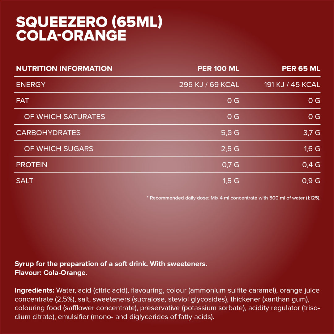 Water, acid (citric acid), flavouring, colour (ammonium sulphite caramel), orange juice concentrate (2.5%), salt, sweeteners (sucralose, steviol glycosides from stevia), thickener (xanthan gum), colouring foodstuff (safflower concentrate), preservative (potassium sorbate), acidity regulator (sodium citrate), emulsifier (mono- and diglycerides of fatty acids).
