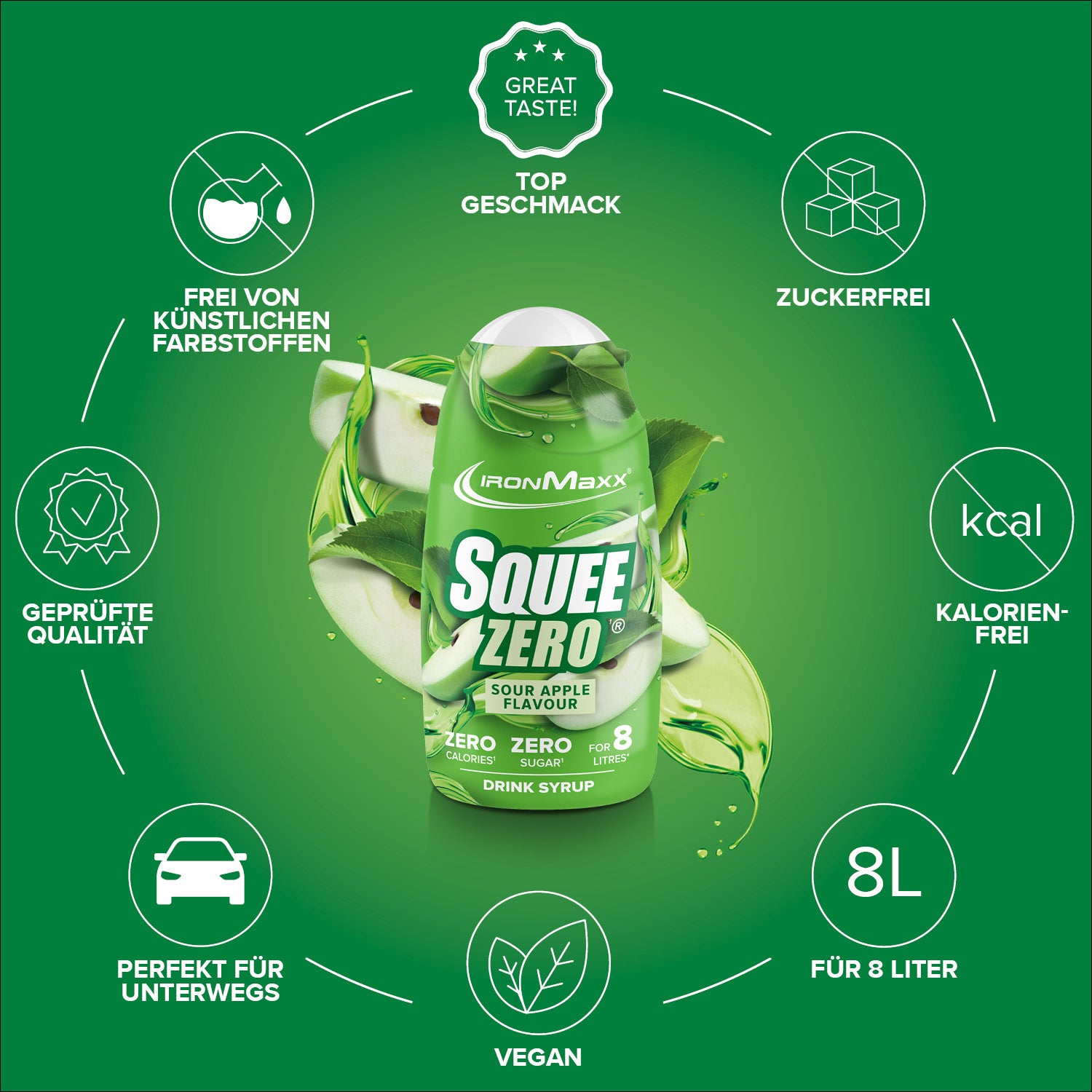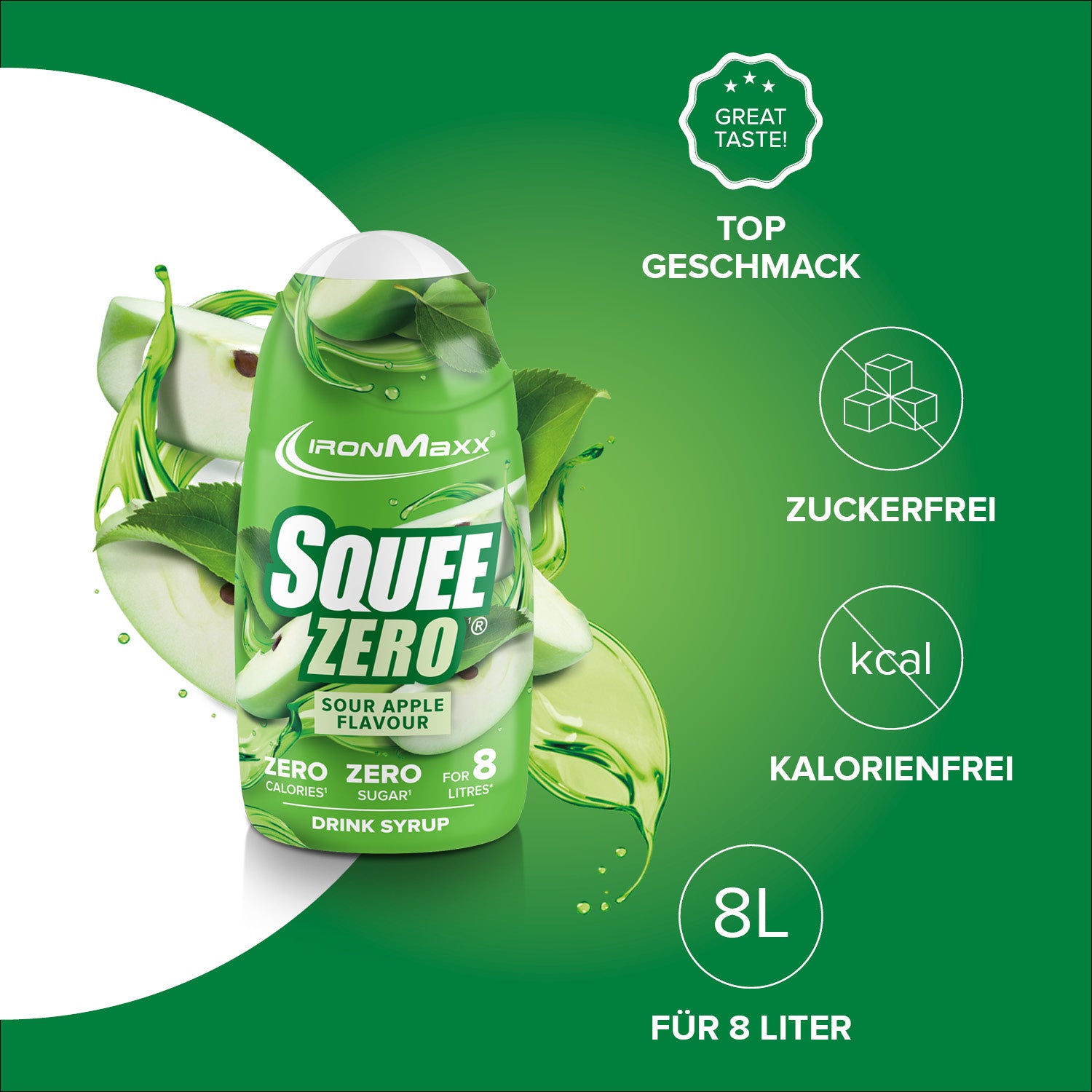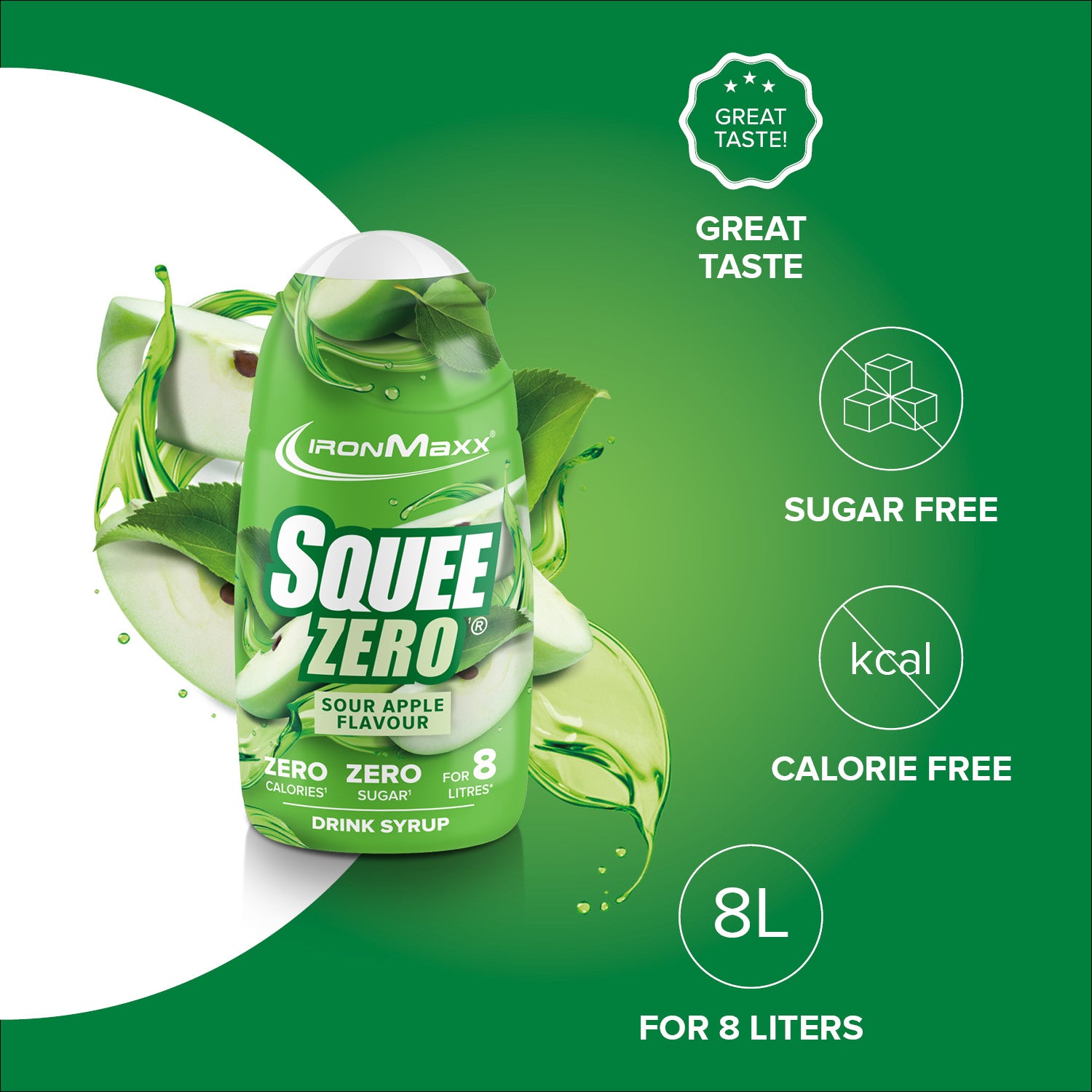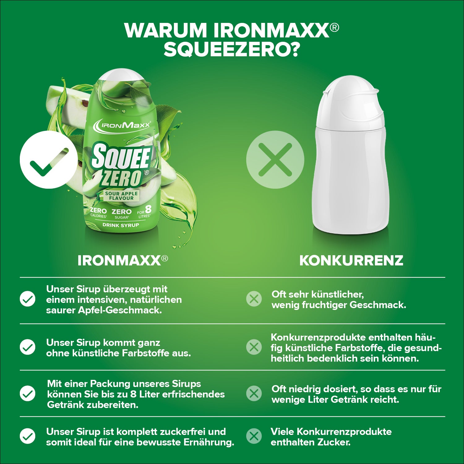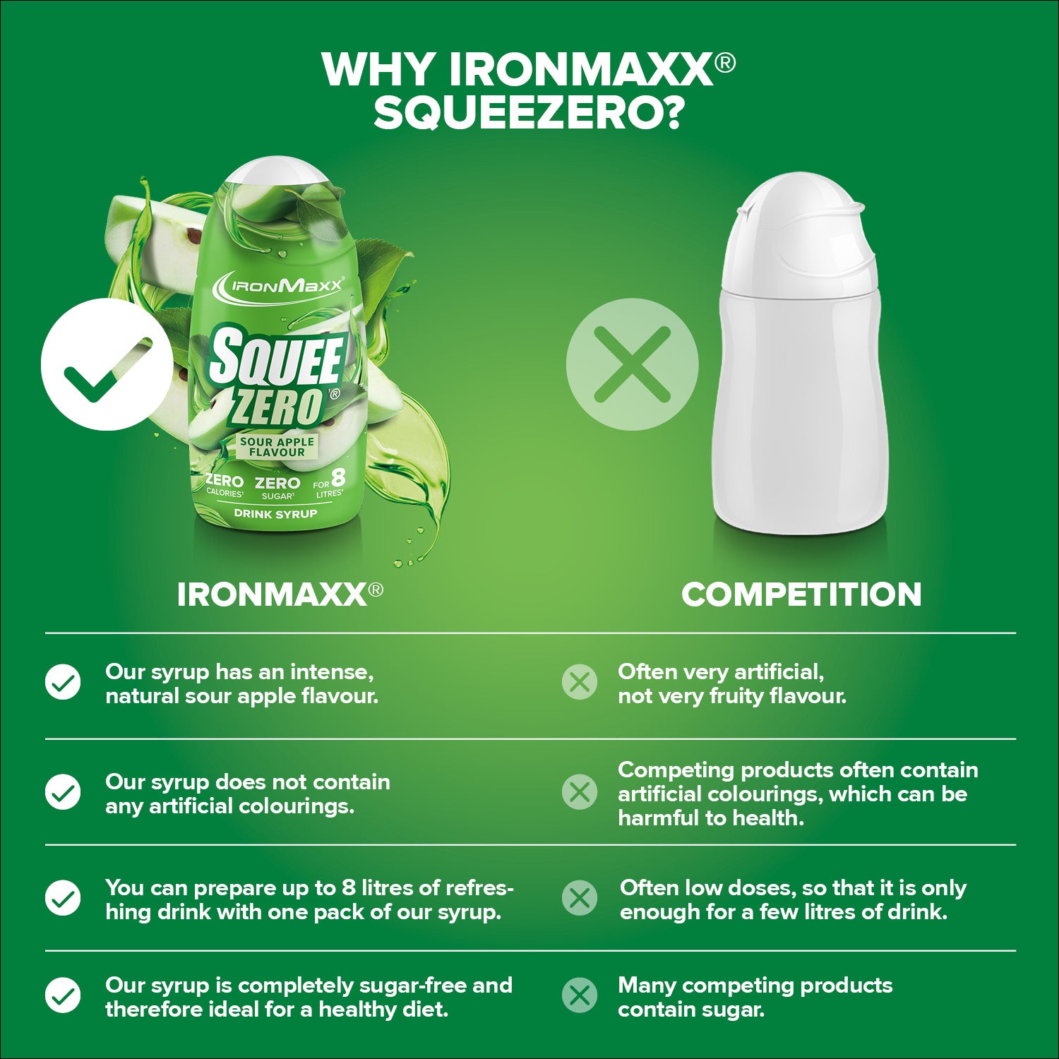 IronMaxx® SqueeZero – the sugar-free & calorie-free drink concentrate that transforms plain water into a refreshing fitness drink. With just a few drops, you create a full-flavour beverage without sugar or calories. Each 65 ml bottle makes up to 8 litres of ready-to-drink refreshment, helping you stay motivated to drink more every day.