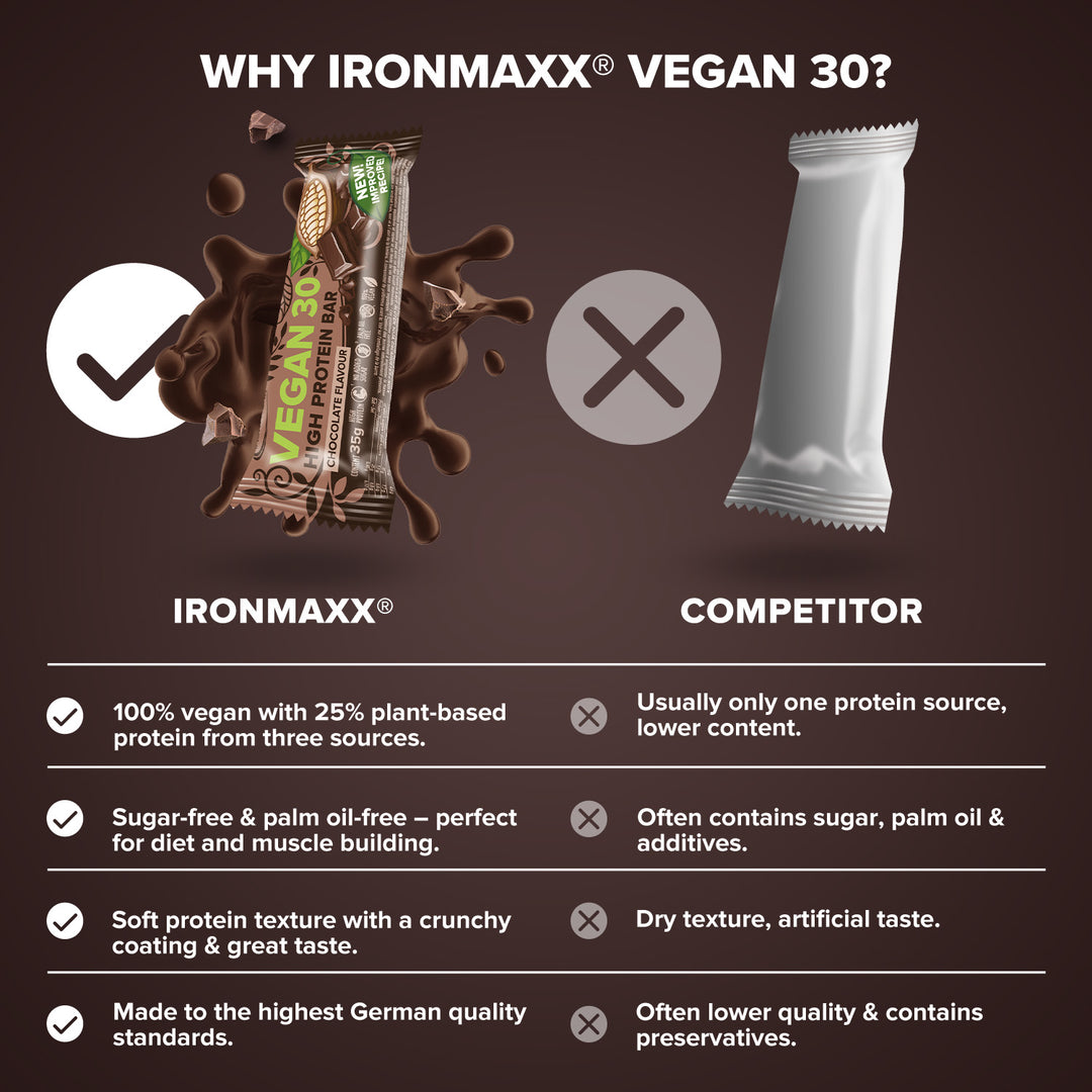 The IronMaxx® Vegan 30 Protein Bar is your perfect snack on the go – now with even better flavour and improved texture! With 25% plant-based protein from peas, fava beans and rapeseed protein, it reliably supports muscle growth and diet phases.