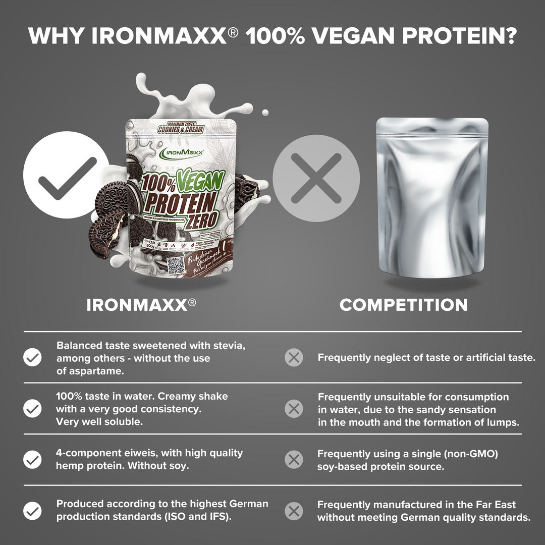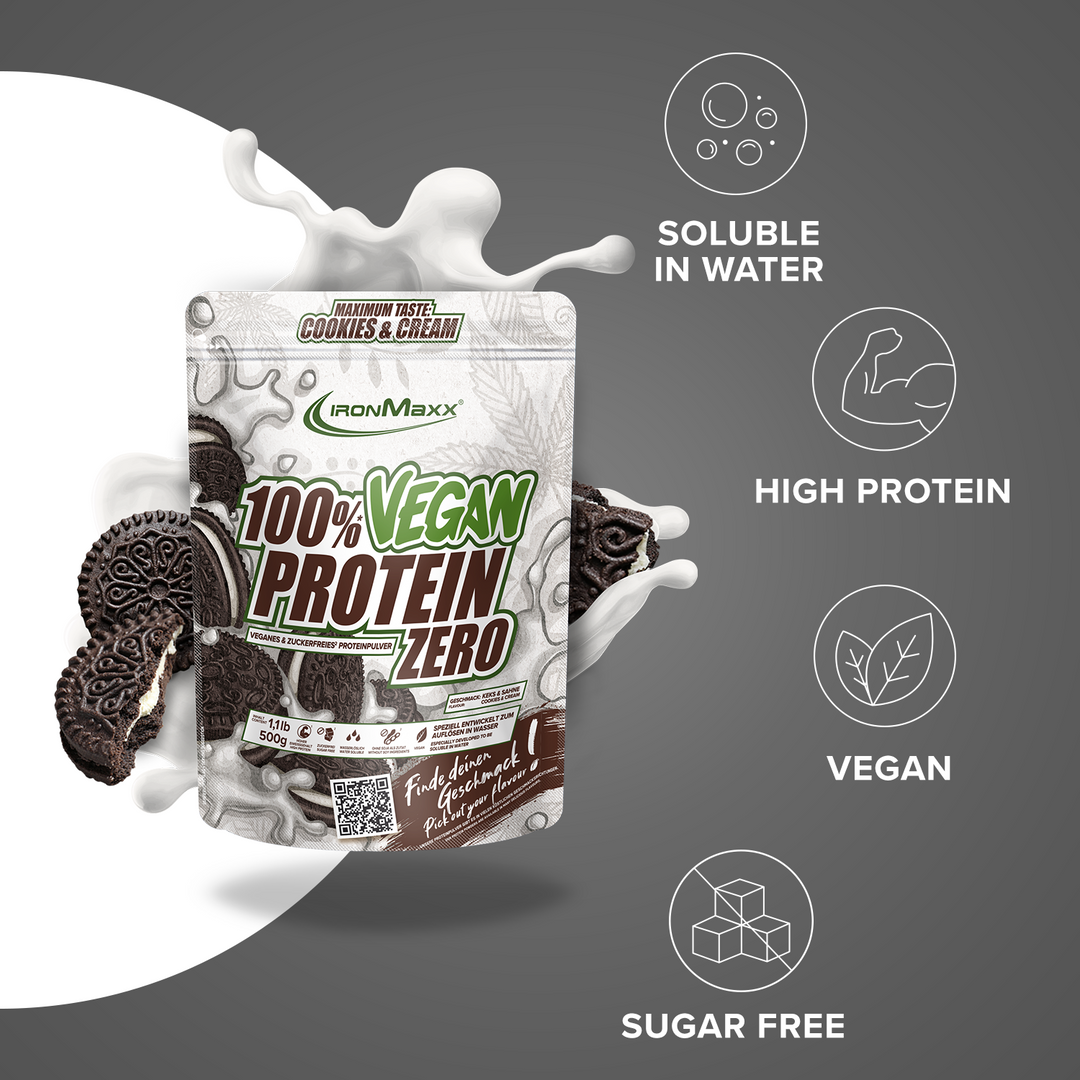 - Our IronMaxx® Vegan Protein Zero (vegan protein powder) is exceptionally high-dosed and thus the perfect supplement for your vegan, protein-rich everyday life!