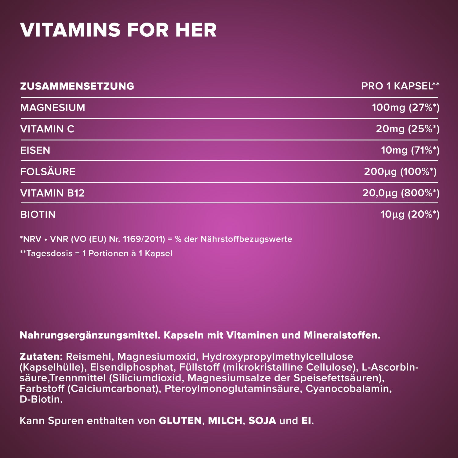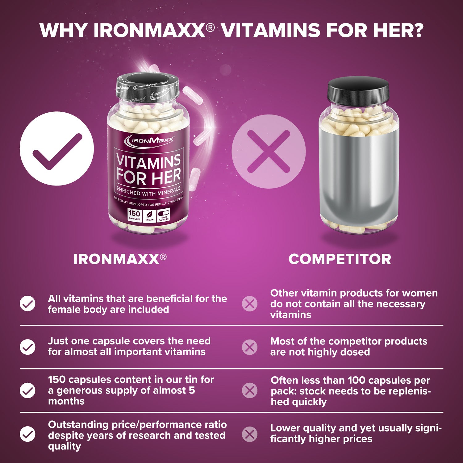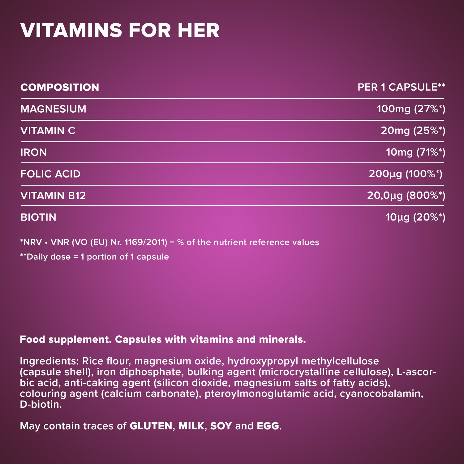 IronMaxx® Vitamins for Her is a carefully balanced multivitamin formula designed for women – supporting healthy skin, hair, energy levels, and immune function. Biotin helps maintain normal skin and hair, while vitamin C, iron, and folate reduce fatigue and boost vitality. Magnesium promotes healthy muscle function, and vitamins B12 and folic acid support your immune system and cell development. The perfect all-in-one solution – even during pregnancy.