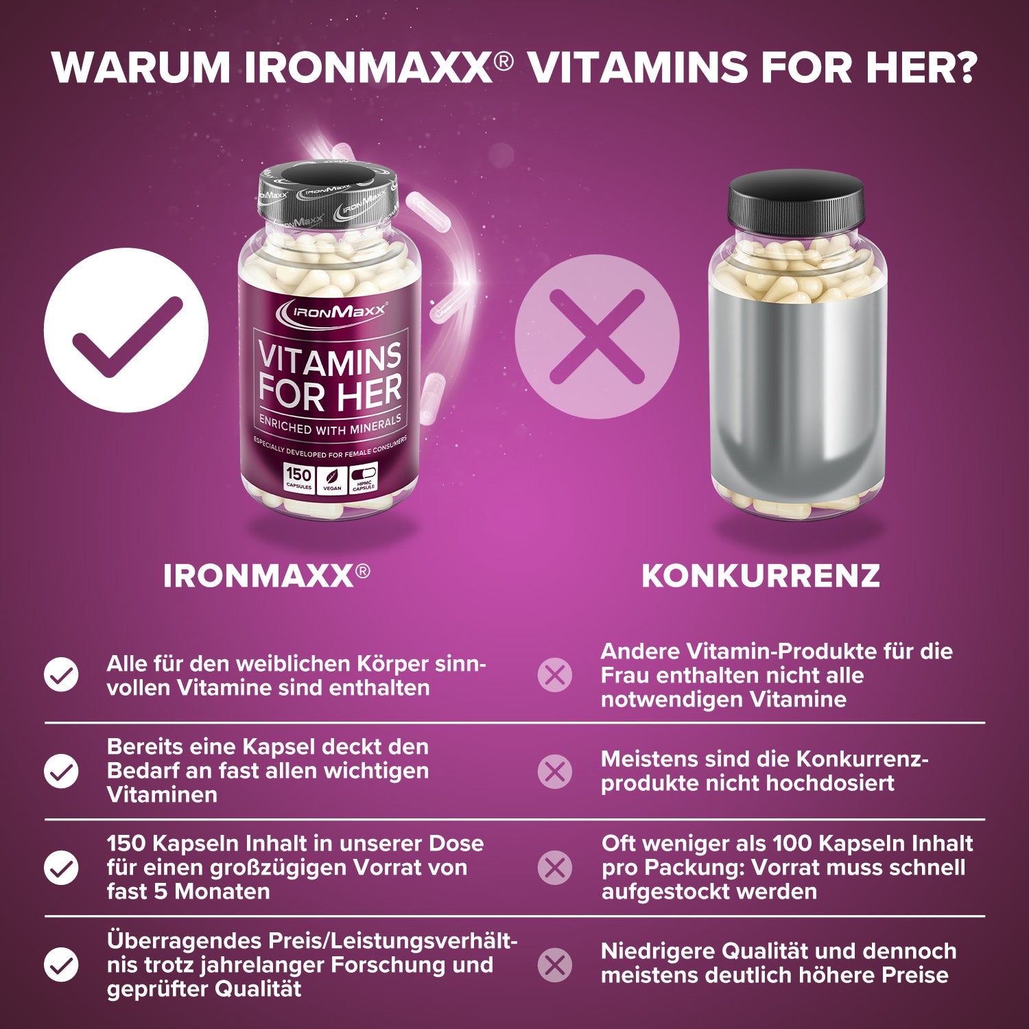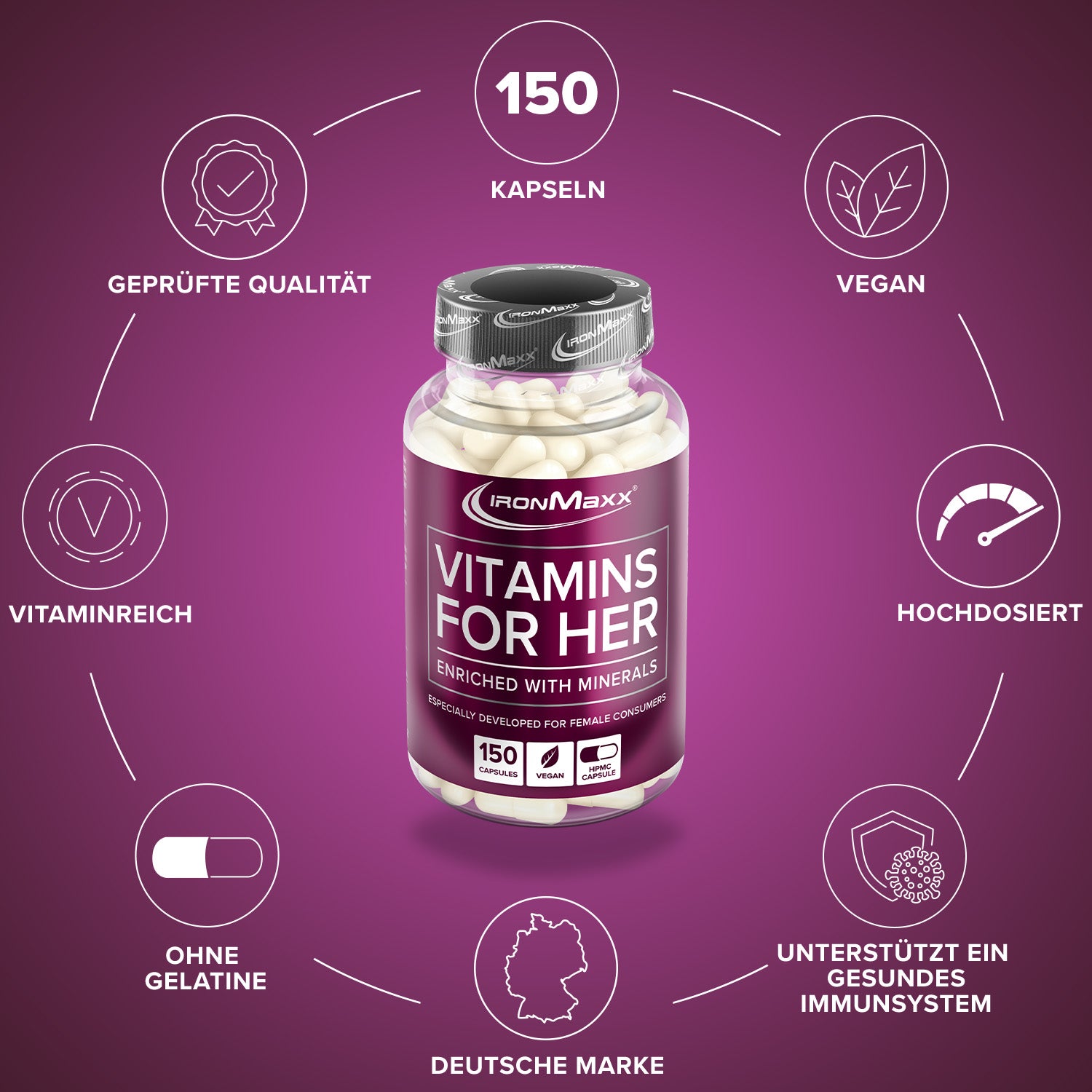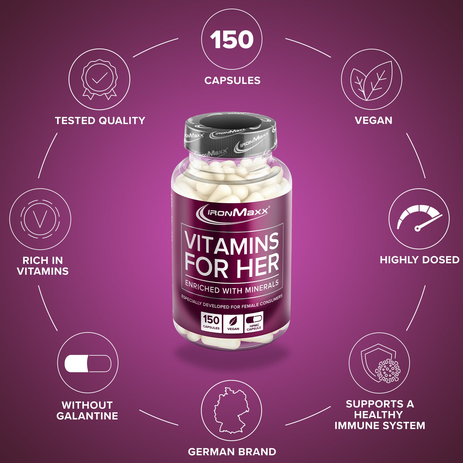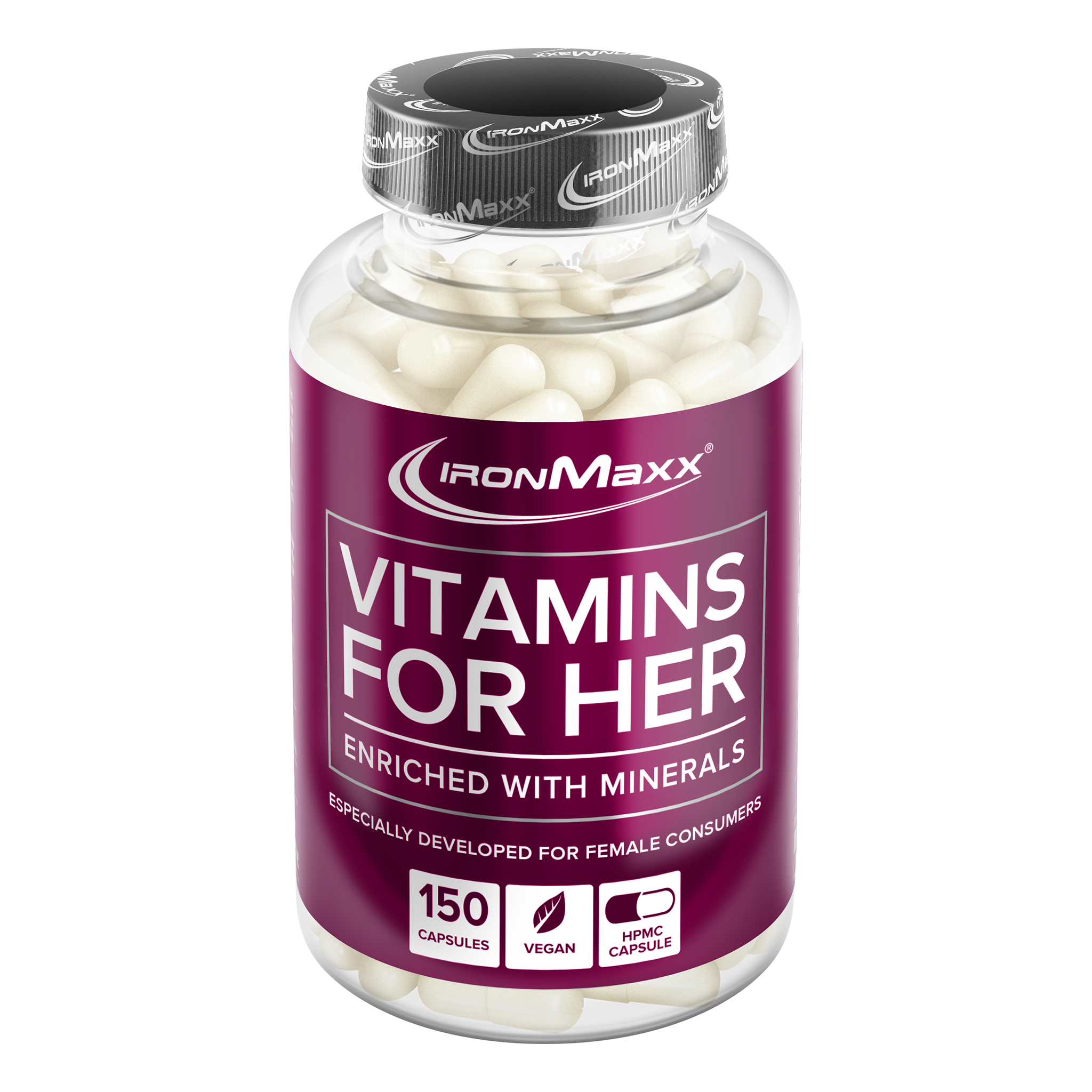 IronMaxx® Vitamins for Her is a carefully balanced multivitamin formula designed for women – supporting healthy skin, hair, energy levels, and immune function. Biotin helps maintain normal skin and hair, while vitamin C, iron, and folate reduce fatigue and boost vitality. Magnesium promotes healthy muscle function, and vitamins B12 and folic acid support your immune system and cell development. The perfect all-in-one solution – even during pregnancy.
