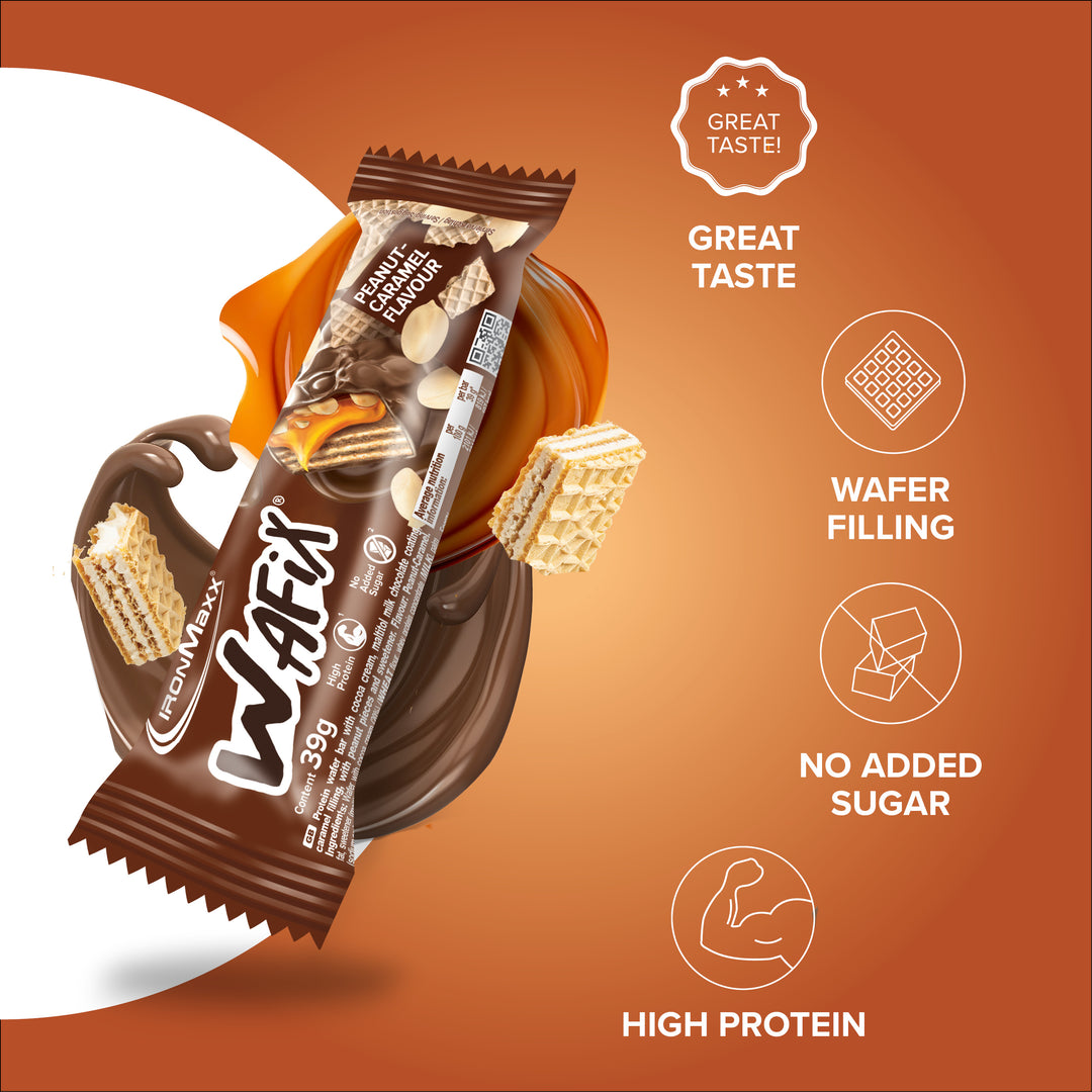 The IronMaxx® Wafix combines crispy wafer layers, a creamy caramel filling, delicate cocoa cream and crunchy peanut pieces for a unique snacking experience. Each bar (39 g) provides 10 g of high-quality protein to support muscle growth and maintenance.