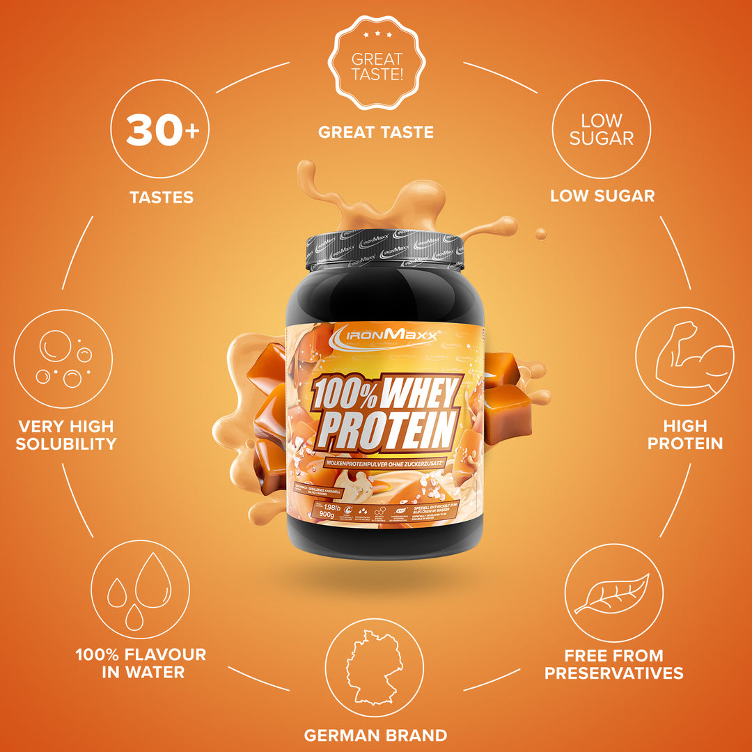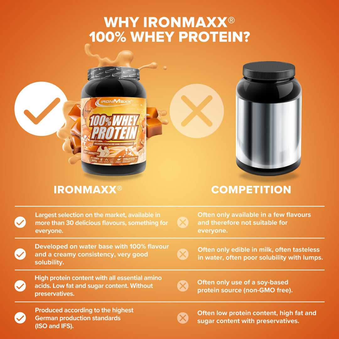 IronMaxx® 100% Whey Protein is one of the most popular protein shakes for muscle growth, recovery and cutting phases. With up to 80% protein, a complete amino acid profile (including BCAAs & EAAs) and a creamy, delicious taste, it is the perfect partner for your fitness routine.