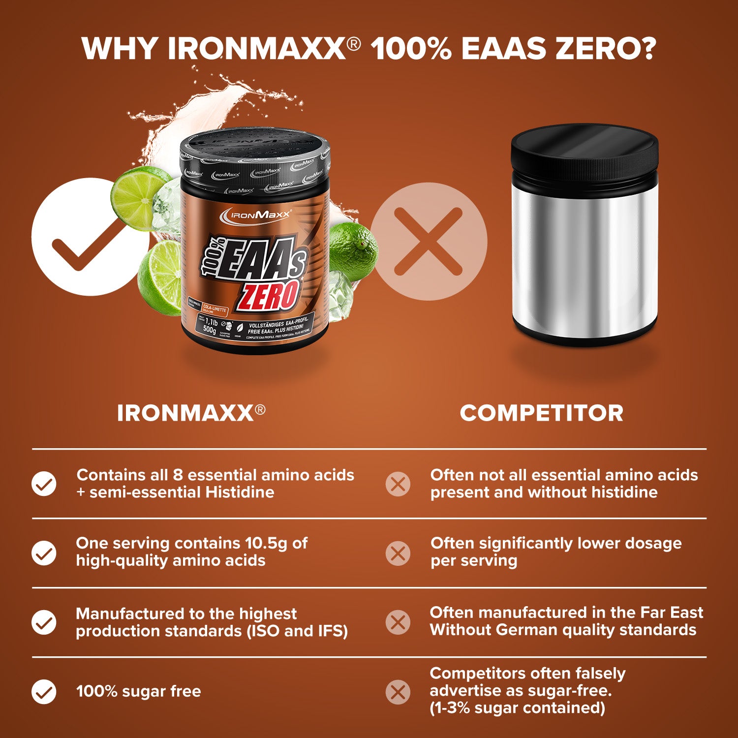 - Profil complet de l'EAA : Comprend tout 8 acides aminés essentiels plus Histidine - y compris BCAA pour un effet maximal.