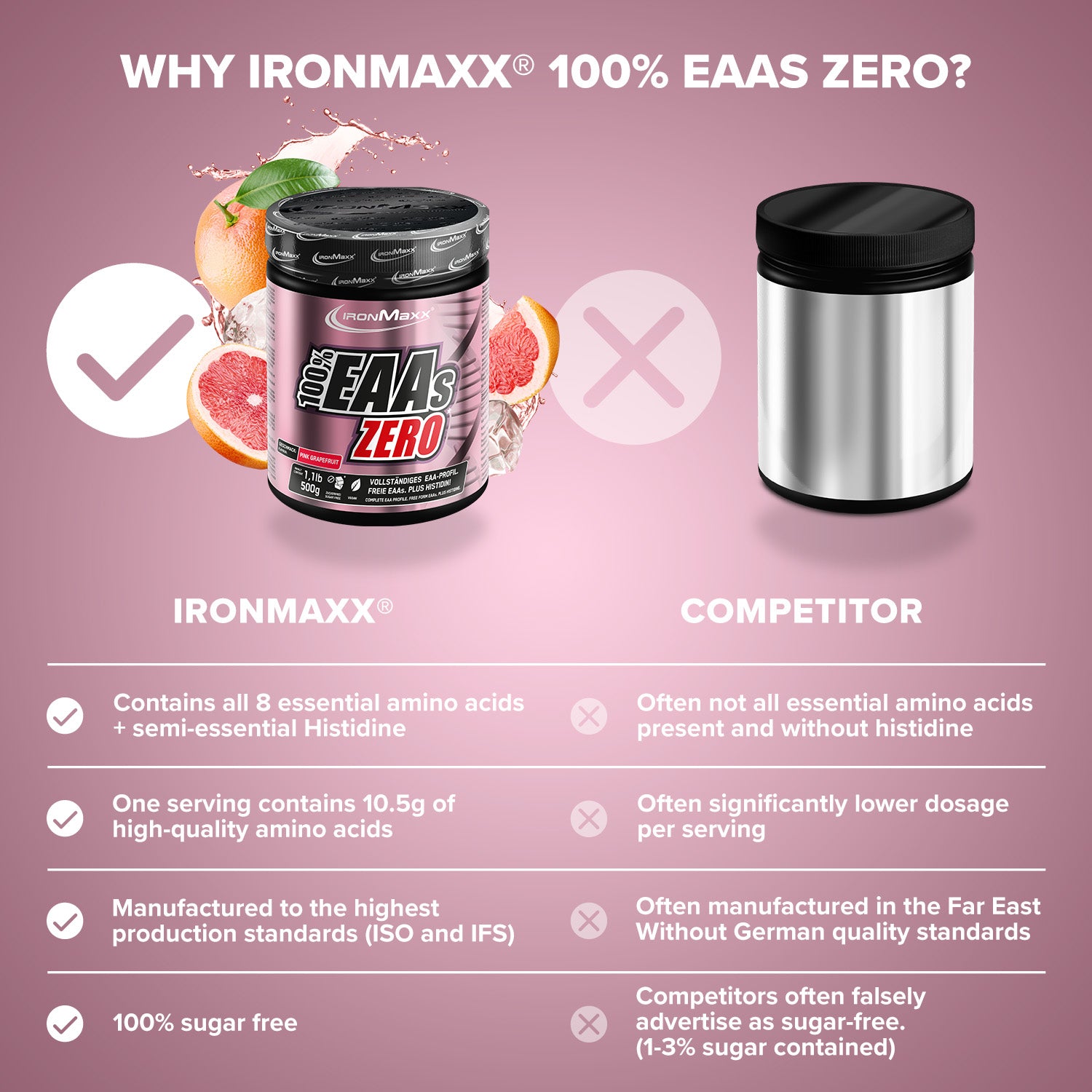 - Profil complet de l'EAA : Comprend tout 8 acides aminés essentiels plus Histidine - y compris BCAA pour un effet maximal.