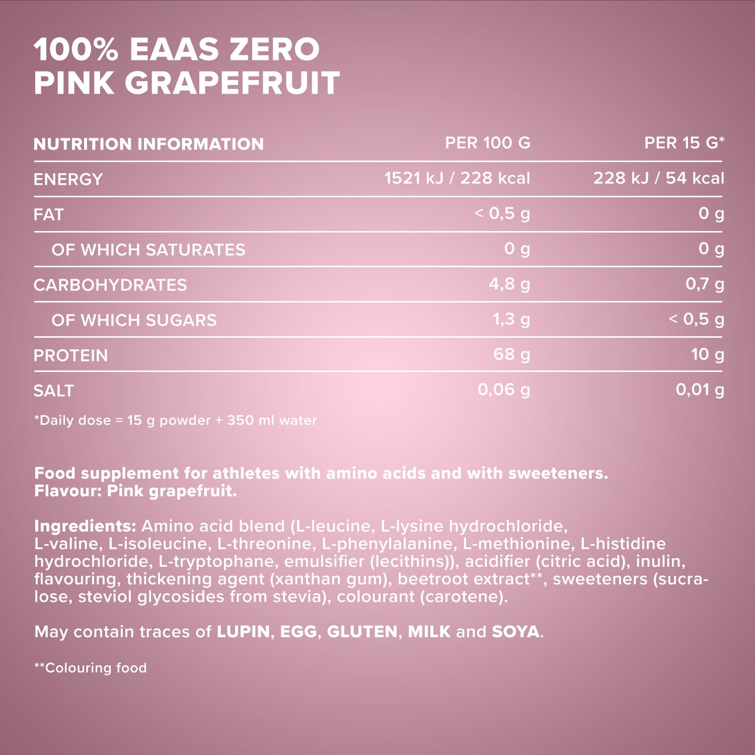 Mélange d'acides aminés (L-leucine, chlorhydrate de L-lysine, L-valine, L-isoleucine, L-thréonine, L-phénylalanine, L-méthionine, chlorhydrate de L-histidine, L-tryptophane, émulsifiant (lécithines)), acidifiant (acide citrique), inuline, arôme, épaississant (gomme xanthane), extrait de betterave**, édulcorants (sucralose, glycosides de stéviol), colorant (carotène). Peut contenir des traces de LUPINS,ŒUF,GLUTEN, LAIT et SOJA.