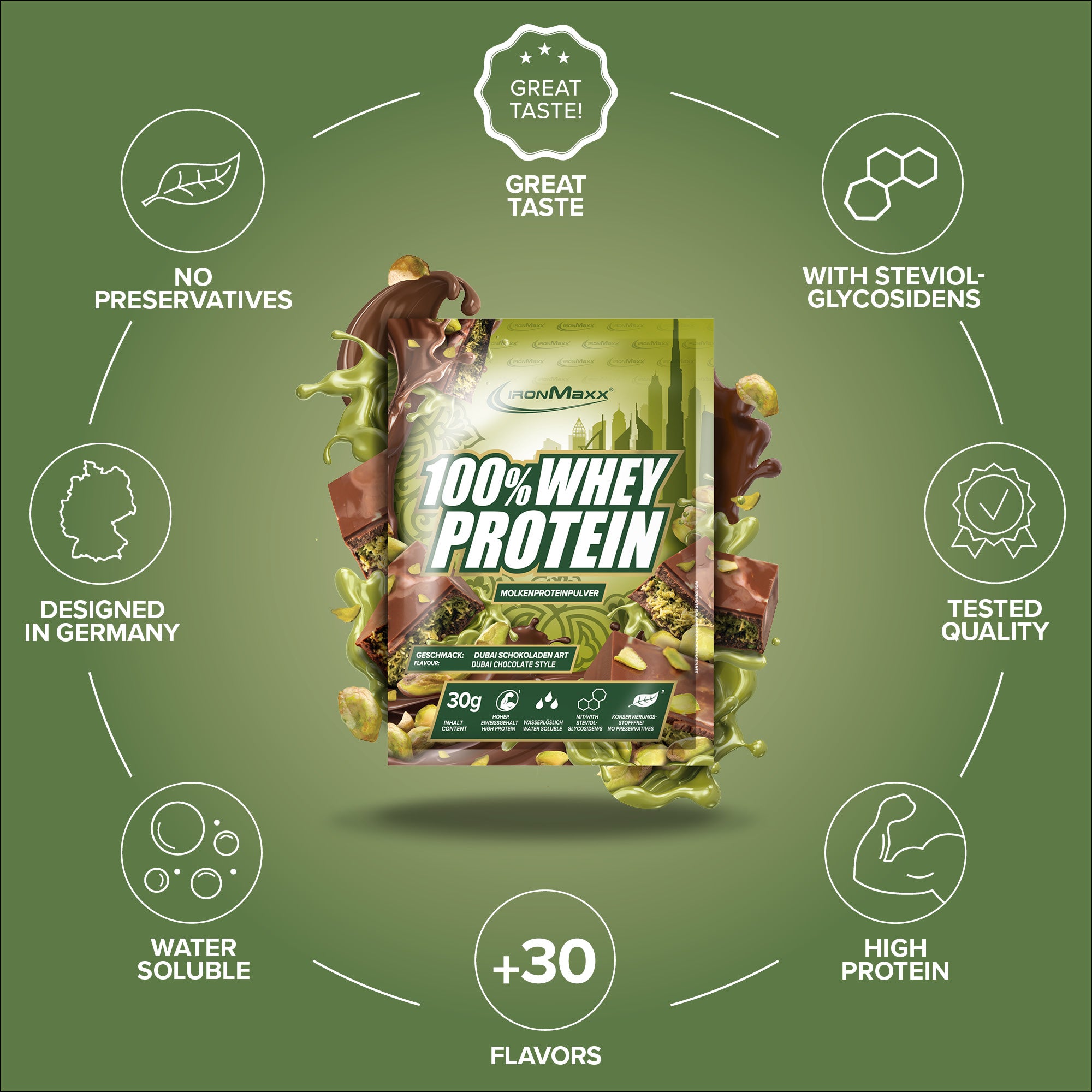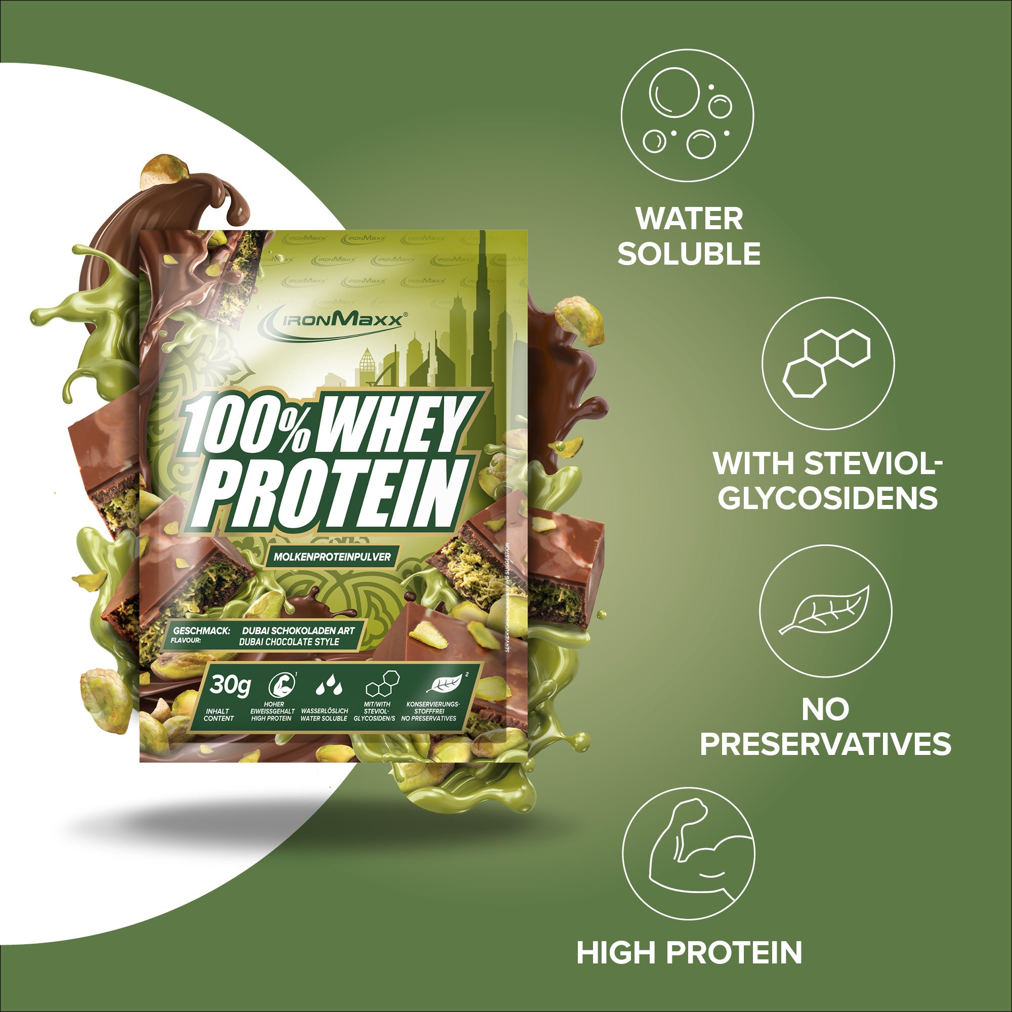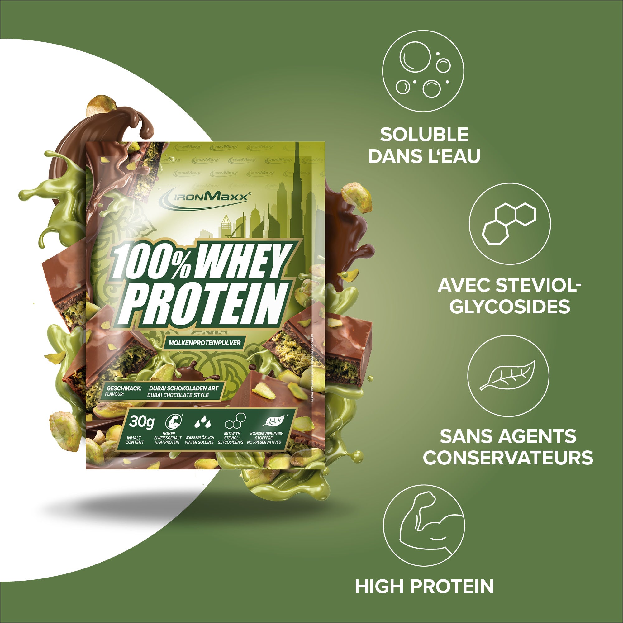 Nom commercialConcentré de protéines de lactosérum pour la préparation de boissons pour sportifs. Avec édulcorants. Saveur chocolat-pistache.