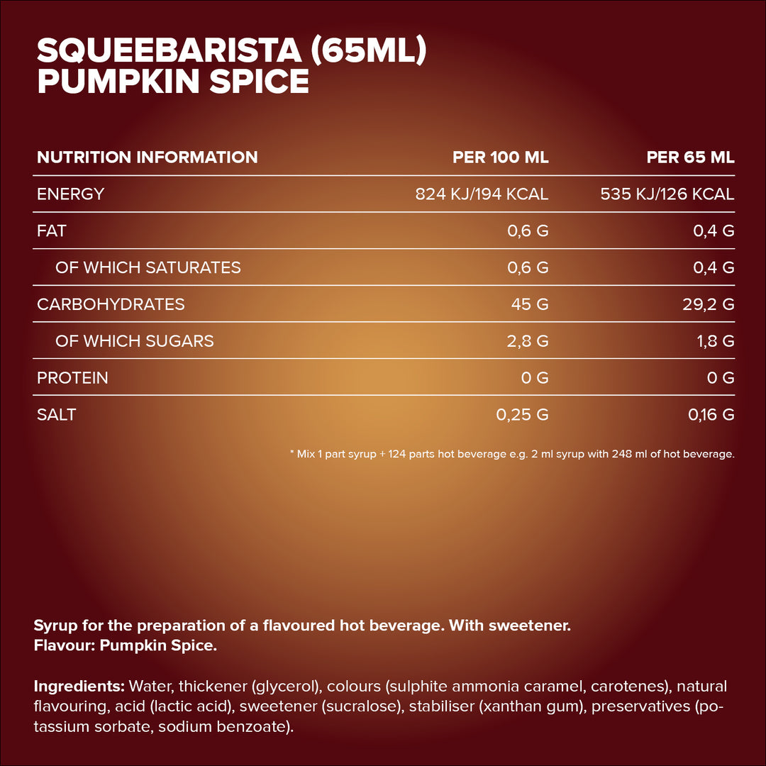 Eau, agent épaississant (glycérine), colorants (caramel au sulfite d'ammonium, carotènes), arôme naturel, acidifiant (acide lactique), édulcorant (sucralose), stabilisant (xanthane), conservateurs (sorbate de potassium et benzoate de sodium).