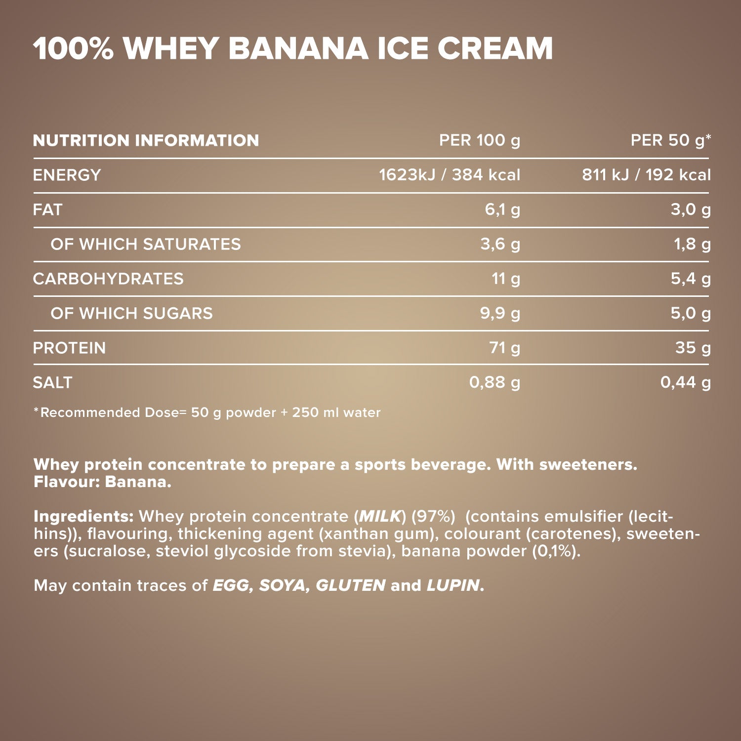 Wei-eiwitconcentraat (MELK) (97%) (bevat emulgator (lecithinen)), aroma, verdikkingsmiddel (xanthaangom), kleurstof (caroteen), zoetstoffen (sucralose, steviolglycosiden uit stevia), bananenpoeder (0,1%).Kan sporen bevatten van EI, SOJA, GLUTEN En LUPINES bevatten.
