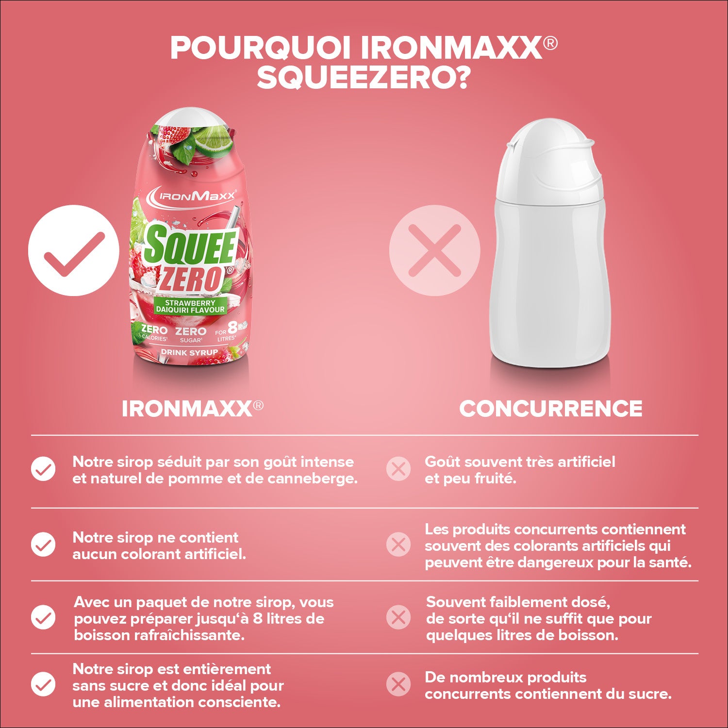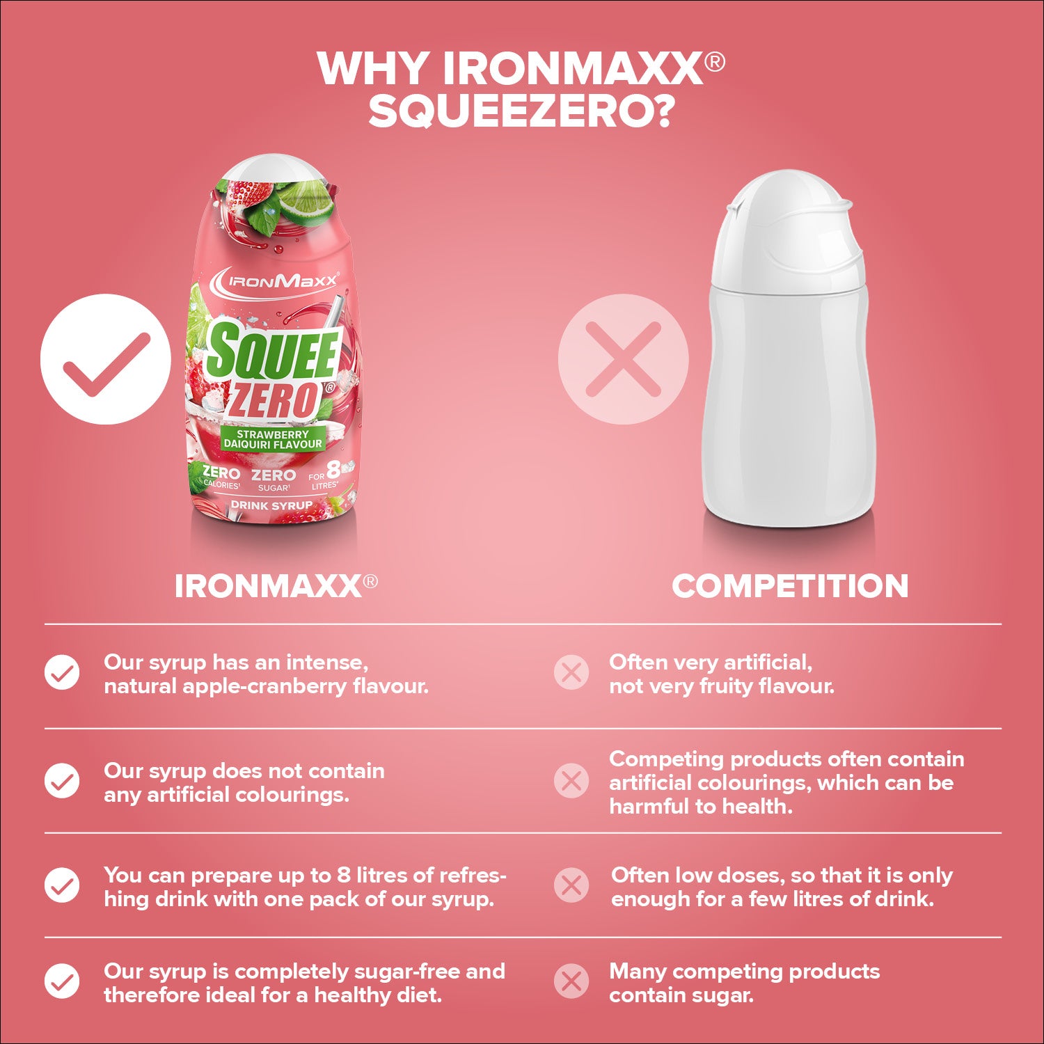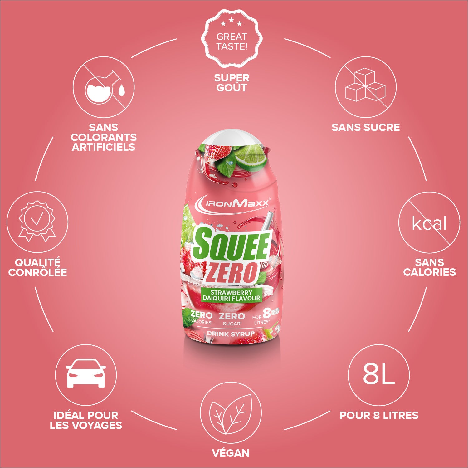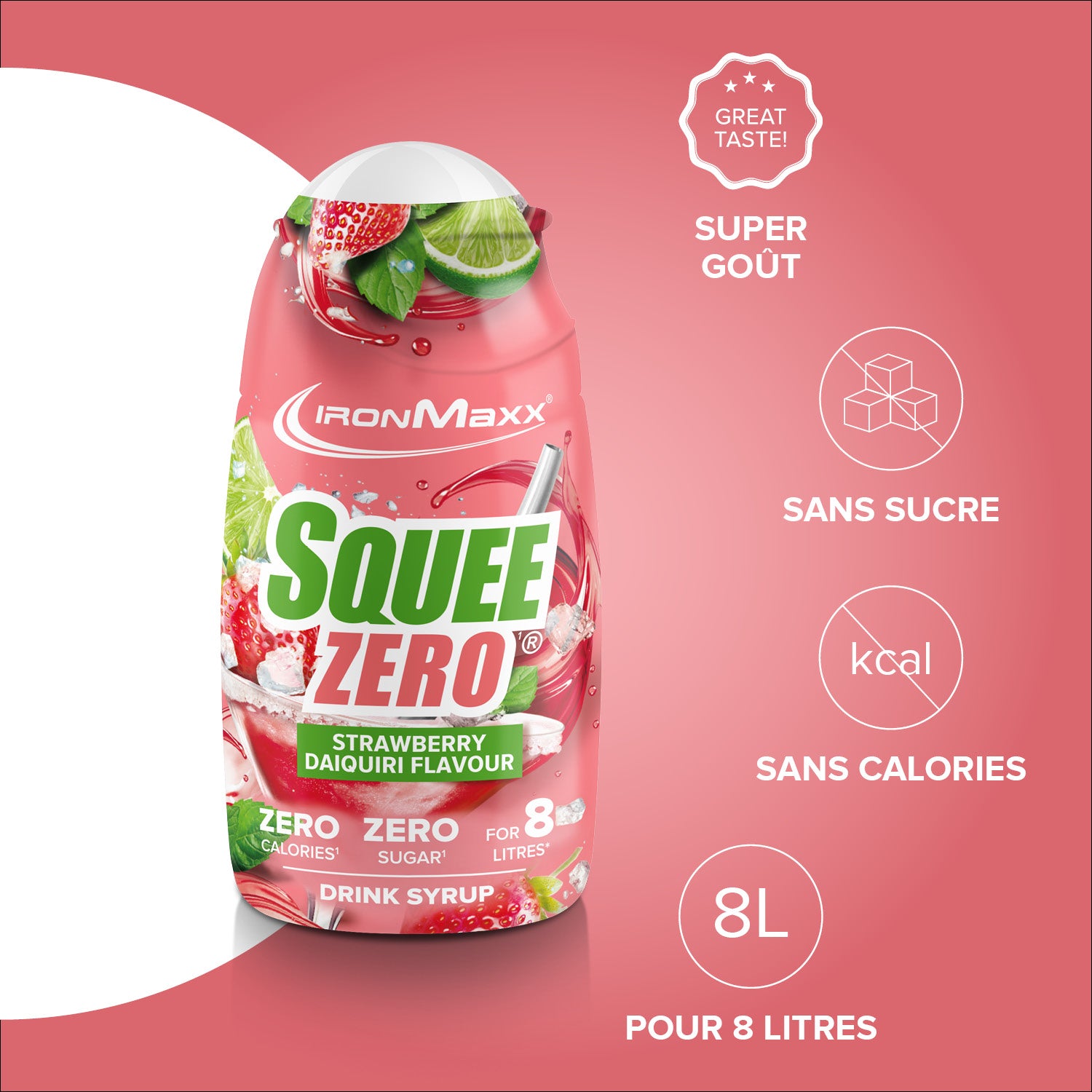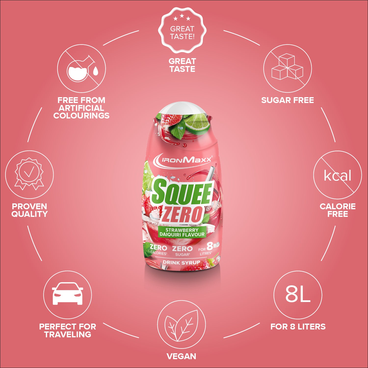 IronMaxx® SqueeZero – Het suikervrije en calorievrije drankconcentraat voor meer smaak in het dagelijks leven. Met slechts een paar druppels tover je water om tot een verfrissend drankje. Fitnessdrank – volledig suikervrij en calorievrij. Elk flesje (65ml) is goed voor maximaal 8 liter kant-en-klare drank, waardoor je gemotiveerd blijft om meer te drinken.